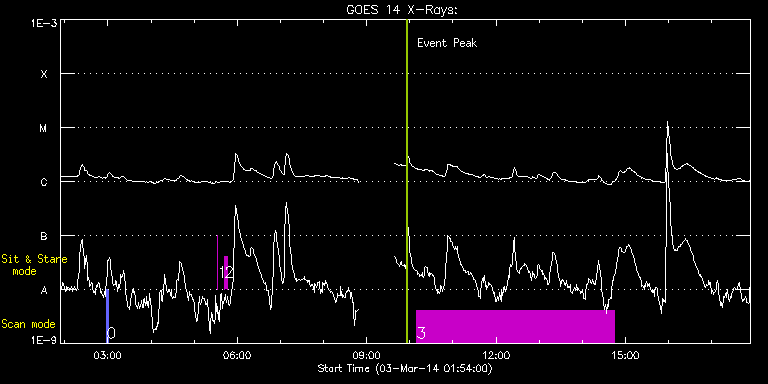 EIS Observation timeline overlay to GOES-Xray curve Code 1" 2" 40" 266" EIS Observations list for this event: STUDY ACRONYM ID DATE OBSERVED DESCRIPTION NOAA# TARGET 0 PRY_slot_context_v3 | 38939 | 2014/03/03 02:58:20 | IHOP 246: Hot plasma in AR | 1990 | Active Region TIMELINE ID DATE OBSERVED FITS FILE XCEN (+W/-E) YCEN (+N/-S) DUR ----------------------------------------------------------------------------------------------------------------- 38939 | 2014/03/03 02:58:20.000 | eis_l0_20140303_025820.fits.gz | 21.63 | -167.49 | 2m57s 1 regcal070 | 38940 | 2014/03/03 05:32:27 | Flat field with overscan pixels (50*8) | | Engineering TIMELINE ID DATE OBSERVED FITS FILE XCEN (+W/-E) YCEN (+N/-S) DUR ----------------------------------------------------------------------------------------------------------------- 38940 | 2014/03/03 05:32:27.000 | eis_l0_20140303_053227.fits.gz | -177.84 | -98.16 | 3s 2 regcal074 | 38941 | 2014/03/03 05:42:24 | Dark exposures including overscan pixe | | Engineering TIMELINE ID DATE OBSERVED FITS FILE XCEN (+W/-E) YCEN (+N/-S) DUR ----------------------------------------------------------------------------------------------------------------- 38941 | 2014/03/03 05:42:24.000 | eis_l0_20140303_054224.fits.gz | -176.52 | -98.01 | 3m22s 3 SK_CH_DIAG_320x384 | 38942 | 2014/03/03 10:09:49 | HOP 206: Polar panorama map | | Coronal Hole TIMELINE ID DATE OBSERVED FITS FILE XCEN (+W/-E) YCEN (+N/-S) DUR ----------------------------------------------------------------------------------------------------------------- 38942 | 2014/03/03 10:09:49.000 | eis_l0_20140303_100949.fits.gz | -4.39 | -923.37 | 4h35m36s : Check study information : Download file : View thumbnails For this event, also check for: