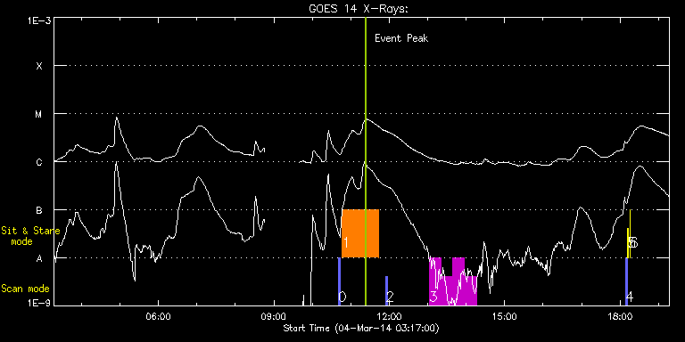 EIS Observation timeline overlay to GOES-Xray curve Code 1" 2" 40" 266" EIS Observations list for this event: STUDY ACRONYM ID DATE OBSERVED DESCRIPTION NOAA# TARGET 0 PRY_slot_context_v3 | 38969 | 2014/03/04 10:40:14 | AR 11991 obs | 1991 | Active Region TIMELINE ID DATE OBSERVED FITS FILE XCEN (+W/-E) YCEN (+N/-S) DUR ----------------------------------------------------------------------------------------------------------------- 38969 | 2014/03/04 10:40:14.000 | eis_l0_20140304_104014.fits.gz | 30.83 | -301.38 | 2m56s 1 FLAREDOP_EIS | 38970 | 2014/03/04 10:46:59 | AR 11991 obs | | Flare TIMELINE ID DATE OBSERVED FITS FILE XCEN (+W/-E) YCEN (+N/-S) DUR ----------------------------------------------------------------------------------------------------------------- 38970 | 2014/03/04 10:46:59.000 | eis_l0_20140304_104659.fits.gz | 28.52 | -301.30 | 55m51s 2 PRY_slot_context_v3 | 38971 | 2014/03/04 11:54:45 | AR 11991 obs | 1990 | Active Region TIMELINE ID DATE OBSERVED FITS FILE XCEN (+W/-E) YCEN (+N/-S) DUR ----------------------------------------------------------------------------------------------------------------- 38971 | 2014/03/04 11:54:45.000 | eis_l0_20140304_115445.fits.gz | 41.10 | -301.53 | 2m57s 3 YK_AR_50x384 | 38954 | 2014/03/04 13:02:20 | IHOP 250: Sunspot flows | 1995 | Active Region TIMELINE ID DATE OBSERVED FITS FILE XCEN (+W/-E) YCEN (+N/-S) DUR ----------------------------------------------------------------------------------------------------------------- 38954 | 2014/03/04 13:02:20.000 | eis_l0_20140304_130220.fits.gz | 328.89 | -118.14 | 18m24s 38954 | 2014/03/04 13:20:47.000 | eis_l0_20140304_132047.fits.gz | 331.36 | -118.37 | 18m24s 38954 | 2014/03/04 13:39:14.000 | eis_l0_20140304_133914.fits.gz | 333.99 | -118.61 | 18m24s 38954 | 2014/03/04 13:57:41.000 | eis_l0_20140304_135741.fits.gz | 336.62 | -118.68 | 18m24s 4 PRY_slot_contextLITE | 38955 | 2014/03/04 18:08:34 | EIS pointing monitoring | | Active Region TIMELINE ID DATE OBSERVED FITS FILE XCEN (+W/-E) YCEN (+N/-S) DUR ----------------------------------------------------------------------------------------------------------------- 38955 | 2014/03/04 18:08:34.000 | eis_l0_20140304_180834.fits.gz | -15.37 | -0.42 | 2m57s 5 Alignment_266 | 38956 | 2014/03/04 18:12:07 | EIS pointing monitoring | | Quiet Sun TIMELINE ID DATE OBSERVED FITS FILE XCEN (+W/-E) YCEN (+N/-S) DUR ----------------------------------------------------------------------------------------------------------------- 38956 | 2014/03/04 18:12:07.000 | eis_l0_20140304_181207.fits.gz | -132.57 | -0.50 | 1m22s 6 XRT_synop_AIA | 38957 | 2014/03/04 18:15:06 | EIS pointing monitoring | | Quiet Sun TIMELINE ID DATE OBSERVED FITS FILE XCEN (+W/-E) YCEN (+N/-S) DUR ----------------------------------------------------------------------------------------------------------------- 38957 | 2014/03/04 18:15:06.000 | eis_l0_20140304_181506.fits.gz | -132.49 | -0.42 | 10s : Check study information : Download file : View thumbnails For this event, also check for:
