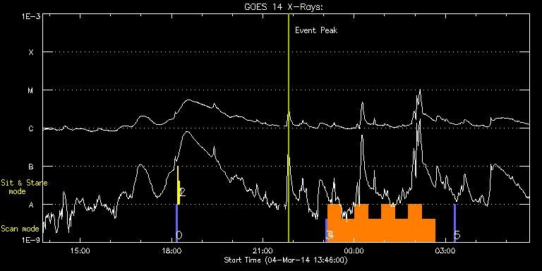 EIS Observation timeline overlay to GOES-Xray curve Code 1" 2" 40" 266" EIS Observations list for this event: STUDY ACRONYM ID DATE OBSERVED DESCRIPTION NOAA# TARGET 0 PRY_slot_contextLITE | 38955 | 2014/03/04 18:08:34 | EIS pointing monitoring | | Active Region TIMELINE ID DATE OBSERVED FITS FILE XCEN (+W/-E) YCEN (+N/-S) DUR ----------------------------------------------------------------------------------------------------------------- 38955 | 2014/03/04 18:08:34.000 | eis_l0_20140304_180834.fits.gz | -15.37 | -0.42 | 2m57s 1 Alignment_266 | 38956 | 2014/03/04 18:12:07 | EIS pointing monitoring | | Quiet Sun TIMELINE ID DATE OBSERVED FITS FILE XCEN (+W/-E) YCEN (+N/-S) DUR ----------------------------------------------------------------------------------------------------------------- 38956 | 2014/03/04 18:12:07.000 | eis_l0_20140304_181207.fits.gz | -132.57 | -0.50 | 1m22s 2 XRT_synop_AIA | 38957 | 2014/03/04 18:15:06 | EIS pointing monitoring | | Quiet Sun TIMELINE ID DATE OBSERVED FITS FILE XCEN (+W/-E) YCEN (+N/-S) DUR ----------------------------------------------------------------------------------------------------------------- 38957 | 2014/03/04 18:15:06.000 | eis_l0_20140304_181506.fits.gz | -132.49 | -0.42 | 10s 3 PRY_slot_context_v3 | 38958 | 2014/03/04 23:03:18 | IHOP 246: Hot plasma in AR | 1990 | Active Region TIMELINE ID DATE OBSERVED FITS FILE XCEN (+W/-E) YCEN (+N/-S) DUR ----------------------------------------------------------------------------------------------------------------- 38958 | 2014/03/04 23:03:18.000 | eis_l0_20140304_230318.fits.gz | 428.03 | -128.81 | 2m56s 4 PRY_footpoints_lite | 38959 | 2014/03/04 23:07:34 | IHOP 246: Hot plasma in AR | | Active Region TIMELINE ID DATE OBSERVED FITS FILE XCEN (+W/-E) YCEN (+N/-S) DUR ----------------------------------------------------------------------------------------------------------------- 38959 | 2014/03/04 23:07:34.000 | eis_l0_20140304_230734.fits.gz | 489.49 | -111.89 | 26m22s 38959 | 2014/03/04 23:33:59.000 | eis_l0_20140304_233359.fits.gz | 493.04 | -112.12 | 26m23s 38959 | 2014/03/05 00:00:25.000 | eis_l0_20140305_000025.fits.gz | 496.52 | -112.43 | 26m22s 38959 | 2014/03/05 00:26:50.000 | eis_l0_20140305_002650.fits.gz | 500.00 | -112.50 | 26m23s 38959 | 2014/03/05 00:53:16.000 | eis_l0_20140305_005316.fits.gz | 503.47 | -112.89 | 26m22s 38959 | 2014/03/05 01:19:41.000 | eis_l0_20140305_011941.fits.gz | 506.95 | -113.20 | 26m23s 38959 | 2014/03/05 01:46:07.000 | eis_l0_20140305_014607.fits.gz | 510.50 | -113.28 | 26m22s 38959 | 2014/03/05 02:12:33.000 | eis_l0_20140305_021233.fits.gz | 513.98 | -113.66 | 26m22s 5 PRY_slot_context_v3 | 38960 | 2014/03/05 03:16:56 | IHOP 246: Hot plasma in AR | 1990 | Active Region TIMELINE ID DATE OBSERVED FITS FILE XCEN (+W/-E) YCEN (+N/-S) DUR ----------------------------------------------------------------------------------------------------------------- 38960 | 2014/03/05 03:16:56.000 | eis_l0_20140305_031656.fits.gz | 461.33 | -131.13 | 2m56s : Check study information : Download file : View thumbnails For this event, also check for: