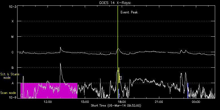 EIS Observation timeline overlay to GOES-Xray curve Code 1" 2" 40" 266" EIS Observations list for this event: STUDY ACRONYM ID DATE OBSERVED DESCRIPTION NOAA# TARGET 0 SK_CH_DIAG_320x384 | 38961 | 2014/03/05 09:46:50 | HOP 81: Polar monitoring campaign | | Coronal Hole TIMELINE ID DATE OBSERVED FITS FILE XCEN (+W/-E) YCEN (+N/-S) DUR ----------------------------------------------------------------------------------------------------------------- 38961 | 2014/03/05 09:46:50.000 | eis_l0_20140305_094650.fits.gz | -4.89 | -943.69 | 4h35m37s 1 PRY_slot_contextLITE | 38962 | 2014/03/05 17:41:33 | EIS pointing monitoring | | Active Region TIMELINE ID DATE OBSERVED FITS FILE XCEN (+W/-E) YCEN (+N/-S) DUR ----------------------------------------------------------------------------------------------------------------- 38962 | 2014/03/05 17:41:33.000 | eis_l0_20140305_174133.fits.gz | -15.06 | -0.42 | 2m57s 2 Alignment_266 | 38963 | 2014/03/05 17:45:06 | EIS pointing monitoring | | Quiet Sun TIMELINE ID DATE OBSERVED FITS FILE XCEN (+W/-E) YCEN (+N/-S) DUR ----------------------------------------------------------------------------------------------------------------- 38963 | 2014/03/05 17:45:06.000 | eis_l0_20140305_174506.fits.gz | -132.57 | -0.35 | 1m22s 3 XRT_synop_AIA | 38964 | 2014/03/05 17:47:38 | EIS pointing monitoring | | Quiet Sun TIMELINE ID DATE OBSERVED FITS FILE XCEN (+W/-E) YCEN (+N/-S) DUR ----------------------------------------------------------------------------------------------------------------- 38964 | 2014/03/05 17:47:38.000 | eis_l0_20140305_174738.fits.gz | -132.57 | -0.58 | 10s 4 PRY_slot_context_v3 | 38965 | 2014/03/05 23:18:27 | IHOP 246: Hot plasma in AR | 1990 | Active Region TIMELINE ID DATE OBSERVED FITS FILE XCEN (+W/-E) YCEN (+N/-S) DUR ----------------------------------------------------------------------------------------------------------------- 38965 | 2014/03/05 23:18:27.000 | eis_l0_20140305_231827.fits.gz | 607.64 | -144.49 | 2m56s : Check study information : Download file : View thumbnails For this event, also check for: