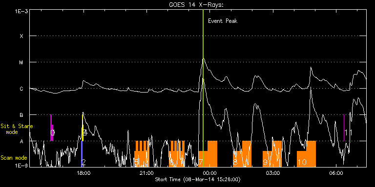 EIS Observation timeline overlay to GOES-Xray curve Code 1" 2" 40" 266" EIS Observations list for this event: STUDY ACRONYM ID DATE OBSERVED DESCRIPTION NOAA# TARGET 0 regcal071 | 39028 | 2014/03/08 16:25:12 | Dark exposures, CCD bottom rows (100s | | Engineering TIMELINE ID DATE OBSERVED FITS FILE XCEN (+W/-E) YCEN (+N/-S) DUR ----------------------------------------------------------------------------------------------------------------- 39028 | 2014/03/08 16:25:12.000 | eis_l0_20140308_162512.fits.gz | -9854.89 | -10268.20 | 3m21s 1 regcal072 | 39029 | 2014/03/08 16:29:00 | Dark exposures, top CCD rows (100s exp | | Engineering TIMELINE ID DATE OBSERVED FITS FILE XCEN (+W/-E) YCEN (+N/-S) DUR ----------------------------------------------------------------------------------------------------------------- 39029 | 2014/03/08 16:29:00.000 | eis_l0_20140308_162900.fits.gz | -9854.89 | -9757.20 | 3m22s 2 PRY_slot_contextLITE | 38999 | 2014/03/08 17:53:27 | EIS-AIA alignment | 1999 | Active Region TIMELINE ID DATE OBSERVED FITS FILE XCEN (+W/-E) YCEN (+N/-S) DUR ----------------------------------------------------------------------------------------------------------------- 38999 | 2014/03/08 17:53:27.000 | eis_l0_20140308_175327.fits.gz | -15.14 | -0.19 | 2m56s 3 Alignment_266 | 39000 | 2014/03/08 17:56:42 | EIS-AIA alignment | | Quiet Sun TIMELINE ID DATE OBSERVED FITS FILE XCEN (+W/-E) YCEN (+N/-S) DUR ----------------------------------------------------------------------------------------------------------------- 39000 | 2014/03/08 17:56:42.000 | eis_l0_20140308_175642.fits.gz | -132.57 | -0.42 | 1m22s 4 XRT_synop_AIA | 39001 | 2014/03/08 17:59:16 | EIS-AIA alignment | | Quiet Sun TIMELINE ID DATE OBSERVED FITS FILE XCEN (+W/-E) YCEN (+N/-S) DUR ----------------------------------------------------------------------------------------------------------------- 39001 | 2014/03/08 17:59:16.000 | eis_l0_20140308_175916.fits.gz | -132.49 | -0.50 | 10s 5 HH_Flare+AR_180x152 | 39034 | 2014/03/08 20:24:29 | AR 11990 at W-limb | 1990 | Flare TIMELINE ID DATE OBSERVED FITS FILE XCEN (+W/-E) YCEN (+N/-S) DUR ----------------------------------------------------------------------------------------------------------------- 39034 | 2014/03/08 20:24:29.000 | eis_l0_20140308_202429.fits.gz | 901.98 | -211.53 | 5m17s 39034 | 2014/03/08 20:29:49.000 | eis_l0_20140308_202949.fits.gz | 901.90 | -211.60 | 5m18s 39034 | 2014/03/08 20:35:10.000 | eis_l0_20140308_203510.fits.gz | 901.98 | -211.60 | 5m18s 39034 | 2014/03/08 20:40:31.000 | eis_l0_20140308_204031.fits.gz | 901.90 | -211.45 | 5m18s 39034 | 2014/03/08 20:45:51.000 | eis_l0_20140308_204551.fits.gz | 901.90 | -211.30 | 5m19s 39034 | 2014/03/08 20:51:13.000 | eis_l0_20140308_205113.fits.gz | 901.98 | -211.45 | 5m18s 39034 | 2014/03/08 20:56:34.000 | eis_l0_20140308_205634.fits.gz | 901.90 | -211.53 | 5m18s 39034 | 2014/03/08 21:01:55.000 | eis_l0_20140308_210155.fits.gz | 901.90 | -211.45 | 5m17s 6 HH_Flare+AR_180x152 | 39033 | 2014/03/08 22:03:53 | AR 11990 at W-limb | 1990 | Flare TIMELINE ID DATE OBSERVED FITS FILE XCEN (+W/-E) YCEN (+N/-S) DUR ----------------------------------------------------------------------------------------------------------------- 39033 | 2014/03/08 22:03:53.000 | eis_l0_20140308_220353.fits.gz | 909.64 | -211.37 | 5m18s 39033 | 2014/03/08 22:09:14.000 | eis_l0_20140308_220914.fits.gz | 909.64 | -211.53 | 5m17s 39033 | 2014/03/08 22:14:34.000 | eis_l0_20140308_221434.fits.gz | 909.64 | -211.68 | 5m17s 39033 | 2014/03/08 22:19:54.000 | eis_l0_20140308_221954.fits.gz | 909.64 | -211.30 | 5m17s 39033 | 2014/03/08 22:25:14.000 | eis_l0_20140308_222514.fits.gz | 909.64 | -211.45 | 5m17s 39033 | 2014/03/08 22:30:34.000 | eis_l0_20140308_223034.fits.gz | 909.72 | -211.37 | 5m18s 39033 | 2014/03/08 22:35:55.000 | eis_l0_20140308_223555.fits.gz | 909.64 | -211.45 | 5m17s 39033 | 2014/03/08 22:41:15.000 | eis_l0_20140308_224115.fits.gz | 909.64 | -211.45 | 5m19s 7 PRY_footpoints_lite | 39009 | 2014/03/08 23:27:14 | IHOP246 (Hot Plasma in AR 11990 at W-l | 1990 | Active Region TIMELINE ID DATE OBSERVED FITS FILE XCEN (+W/-E) YCEN (+N/-S) DUR ----------------------------------------------------------------------------------------------------------------- 39009 | 2014/03/08 23:27:14.000 | eis_l0_20140308_232714.fits.gz | 911.71 | -211.45 | 26m22s 39009 | 2014/03/08 23:53:39.000 | eis_l0_20140308_235339.fits.gz | 911.64 | -211.45 | 26m22s 8 PRY_footpoints_lite | 39010 | 2014/03/09 01:05:30 | IHOP246 (Hot Plasma in AR 11990 at W-l | 1990 | Active Region TIMELINE ID DATE OBSERVED FITS FILE XCEN (+W/-E) YCEN (+N/-S) DUR ----------------------------------------------------------------------------------------------------------------- 39010 | 2014/03/09 01:05:30.000 | eis_l0_20140309_010530.fits.gz | 903.65 | -211.37 | 26m22s 39010 | 2014/03/09 01:31:56.000 | eis_l0_20140309_013156.fits.gz | 903.65 | -211.60 | 26m22s 9 PRY_footpoints_lite | 39011 | 2014/03/09 02:31:38 | IHOP246 (Hot Plasma in AR 11990 at W-l | 1990 | Active Region TIMELINE ID DATE OBSERVED FITS FILE XCEN (+W/-E) YCEN (+N/-S) DUR ----------------------------------------------------------------------------------------------------------------- 39011 | 2014/03/09 02:31:38.000 | eis_l0_20140309_023138.fits.gz | 911.71 | -211.60 | 26m22s 39011 | 2014/03/09 02:58:04.000 | eis_l0_20140309_025804.fits.gz | 911.64 | -211.53 | 26m22s 10 PRY_footpoints_lite | 39012 | 2014/03/09 04:08:39 | IHOP246 (Hot Plasma in AR 11990 at W-l | 1990 | Active Region TIMELINE ID DATE OBSERVED FITS FILE XCEN (+W/-E) YCEN (+N/-S) DUR ----------------------------------------------------------------------------------------------------------------- 39012 | 2014/03/09 04:08:39.000 | eis_l0_20140309_040839.fits.gz | 911.64 | -211.45 | 26m22s 39012 | 2014/03/09 04:35:04.000 | eis_l0_20140309_043504.fits.gz | 911.64 | -211.60 | 26m23s 11 regcal076 | 39030 | 2014/03/09 06:21:26 | Flatfield, 1 exposure, led 100ms, ccd 