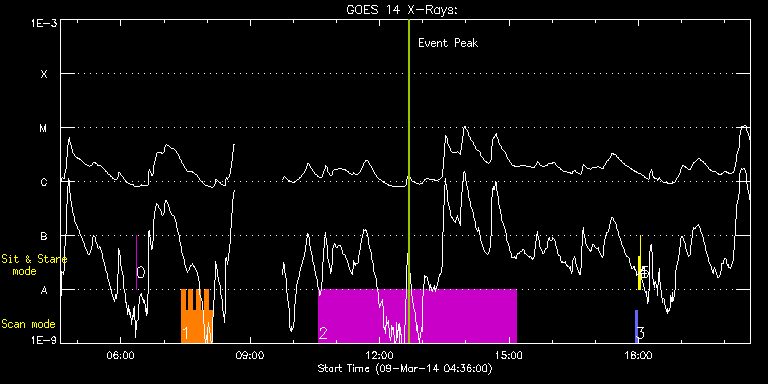 EIS Observation timeline overlay to GOES-Xray curve Code 1" 2" 40" 266" EIS Observations list for this event: STUDY ACRONYM ID DATE OBSERVED DESCRIPTION NOAA# TARGET 0 regcal076 | 39030 | 2014/03/09 06:21:26 | Flatfield, 1 exposure, led 100ms, ccd | | Engineering TIMELINE ID DATE OBSERVED FITS FILE XCEN (+W/-E) YCEN (+N/-S) DUR ----------------------------------------------------------------------------------------------------------------- 39030 | 2014/03/09 06:21:26.000 | eis_l0_20140309_062126.fits.gz | -418.23 | -127.28 | 1s 1 HH_Flare+AR_180x152 | 39031 | 2014/03/09 07:24:05 | AR 11998 near disc center | 1998 | Flare TIMELINE ID DATE OBSERVED FITS FILE XCEN (+W/-E) YCEN (+N/-S) DUR ----------------------------------------------------------------------------------------------------------------- 39031 | 2014/03/09 07:24:05.000 | eis_l0_20140309_072405.fits.gz | -431.21 | -79.67 | 5m18s 39031 | 2014/03/09 07:29:26.000 | eis_l0_20140309_072926.fits.gz | -430.43 | -79.43 | 5m17s 39031 | 2014/03/09 07:34:46.000 | eis_l0_20140309_073446.fits.gz | -429.74 | -79.59 | 5m18s 39031 | 2014/03/09 07:40:07.000 | eis_l0_20140309_074007.fits.gz | -428.97 | -79.36 | 5m18s 39031 | 2014/03/09 07:45:28.000 | eis_l0_20140309_074528.fits.gz | -428.27 | -79.28 | 5m18s 39031 | 2014/03/09 07:50:48.000 | eis_l0_20140309_075048.fits.gz | -427.50 | -79.36 | 5m19s 39031 | 2014/03/09 07:56:10.000 | eis_l0_20140309_075610.fits.gz | -426.80 | -79.20 | 5m17s 39031 | 2014/03/09 08:01:30.000 | eis_l0_20140309_080130.fits.gz | -426.03 | -79.36 | 5m19s 2 SK_CH_DIAG_320x384 | 39013 | 2014/03/09 10:35:25 | HOP206 at S-pole | | Coronal Hole TIMELINE ID DATE OBSERVED FITS FILE XCEN (+W/-E) YCEN (+N/-S) DUR ----------------------------------------------------------------------------------------------------------------- 39013 | 2014/03/09 10:35:25.000 | eis_l0_20140309_103525.fits.gz | -9873.96 | -9966.20 | 4h35m37s 3 PRY_slot_contextLITE | 39002 | 2014/03/09 17:56:32 | EIS-AIA alignment | 2000 | Active Region TIMELINE ID DATE OBSERVED FITS FILE XCEN (+W/-E) YCEN (+N/-S) DUR ----------------------------------------------------------------------------------------------------------------- 39002 | 2014/03/09 17:56:32.000 | eis_l0_20140309_175632.fits.gz | -15.21 | -0.35 | 2m56s 4 Alignment_266 | 39003 | 2014/03/09 17:59:46 | EIS-AIA alignment | 2000 | Quiet Sun TIMELINE ID DATE OBSERVED FITS FILE XCEN (+W/-E) YCEN (+N/-S) DUR ----------------------------------------------------------------------------------------------------------------- 39003 | 2014/03/09 17:59:46.000 | eis_l0_20140309_175946.fits.gz | -132.57 | -0.50 | 1m22s 5 XRT_synop_AIA | 39004 | 2014/03/09 18:02:19 | EIS-AIA alignment | 2000 | Quiet Sun TIMELINE ID DATE OBSERVED FITS FILE XCEN (+W/-E) YCEN (+N/-S) DUR ----------------------------------------------------------------------------------------------------------------- 39004 | 2014/03/09 18:02:19.000 | eis_l0_20140309_180219.fits.gz | -132.57 | -0.35 | 10s : Check study information : Download file : View thumbnails For this event, also check for:
