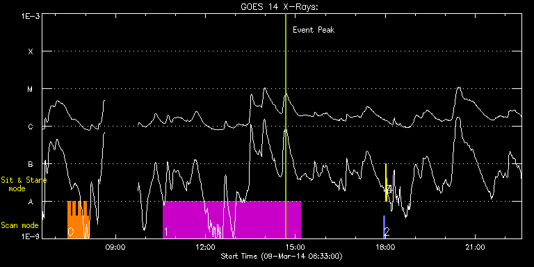 EIS Observation timeline overlay to GOES-Xray curve Code 1" 2" 40" 266" EIS Observations list for this event: STUDY ACRONYM ID DATE OBSERVED DESCRIPTION NOAA# TARGET 0 HH_Flare+AR_180x152 | 39031 | 2014/03/09 07:24:05 | AR 11998 near disc center | 1998 | Flare TIMELINE ID DATE OBSERVED FITS FILE XCEN (+W/-E) YCEN (+N/-S) DUR ----------------------------------------------------------------------------------------------------------------- 39031 | 2014/03/09 07:24:05.000 | eis_l0_20140309_072405.fits.gz | -431.21 | -79.67 | 5m18s 39031 | 2014/03/09 07:29:26.000 | eis_l0_20140309_072926.fits.gz | -430.43 | -79.43 | 5m17s 39031 | 2014/03/09 07:34:46.000 | eis_l0_20140309_073446.fits.gz | -429.74 | -79.59 | 5m18s 39031 | 2014/03/09 07:40:07.000 | eis_l0_20140309_074007.fits.gz | -428.97 | -79.36 | 5m18s 39031 | 2014/03/09 07:45:28.000 | eis_l0_20140309_074528.fits.gz | -428.27 | -79.28 | 5m18s 39031 | 2014/03/09 07:50:48.000 | eis_l0_20140309_075048.fits.gz | -427.50 | -79.36 | 5m19s 39031 | 2014/03/09 07:56:10.000 | eis_l0_20140309_075610.fits.gz | -426.80 | -79.20 | 5m17s 39031 | 2014/03/09 08:01:30.000 | eis_l0_20140309_080130.fits.gz | -426.03 | -79.36 | 5m19s 1 SK_CH_DIAG_320x384 | 39013 | 2014/03/09 10:35:25 | HOP206 at S-pole | | Coronal Hole TIMELINE ID DATE OBSERVED FITS FILE XCEN (+W/-E) YCEN (+N/-S) DUR ----------------------------------------------------------------------------------------------------------------- 39013 | 2014/03/09 10:35:25.000 | eis_l0_20140309_103525.fits.gz | -9873.96 | -9966.20 | 4h35m37s 2 PRY_slot_contextLITE | 39002 | 2014/03/09 17:56:32 | EIS-AIA alignment | 2000 | Active Region TIMELINE ID DATE OBSERVED FITS FILE XCEN (+W/-E) YCEN (+N/-S) DUR ----------------------------------------------------------------------------------------------------------------- 39002 | 2014/03/09 17:56:32.000 | eis_l0_20140309_175632.fits.gz | -15.21 | -0.35 | 2m56s 3 Alignment_266 | 39003 | 2014/03/09 17:59:46 | EIS-AIA alignment | 2000 | Quiet Sun TIMELINE ID DATE OBSERVED FITS FILE XCEN (+W/-E) YCEN (+N/-S) DUR ----------------------------------------------------------------------------------------------------------------- 39003 | 2014/03/09 17:59:46.000 | eis_l0_20140309_175946.fits.gz | -132.57 | -0.50 | 1m22s 4 XRT_synop_AIA | 39004 | 2014/03/09 18:02:19 | EIS-AIA alignment | 2000 | Quiet Sun TIMELINE ID DATE OBSERVED FITS FILE XCEN (+W/-E) YCEN (+N/-S) DUR ----------------------------------------------------------------------------------------------------------------- 39004 | 2014/03/09 18:02:19.000 | eis_l0_20140309_180219.fits.gz | -132.57 | -0.35 | 10s : Check study information : Download file : View thumbnails For this event, also check for:
