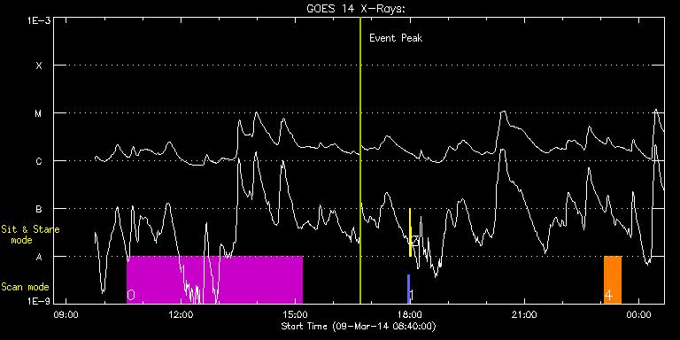 EIS Observation timeline overlay to GOES-Xray curve Code 1" 2" 40" 266" EIS Observations list for this event: STUDY ACRONYM ID DATE OBSERVED DESCRIPTION NOAA# TARGET 0 SK_CH_DIAG_320x384 | 39013 | 2014/03/09 10:35:25 | HOP206 at S-pole | | Coronal Hole TIMELINE ID DATE OBSERVED FITS FILE XCEN (+W/-E) YCEN (+N/-S) DUR ----------------------------------------------------------------------------------------------------------------- 39013 | 2014/03/09 10:35:25.000 | eis_l0_20140309_103525.fits.gz | -9873.96 | -9966.20 | 4h35m37s 1 PRY_slot_contextLITE | 39002 | 2014/03/09 17:56:32 | EIS-AIA alignment | 2000 | Active Region TIMELINE ID DATE OBSERVED FITS FILE XCEN (+W/-E) YCEN (+N/-S) DUR ----------------------------------------------------------------------------------------------------------------- 39002 | 2014/03/09 17:56:32.000 | eis_l0_20140309_175632.fits.gz | -15.21 | -0.35 | 2m56s 2 Alignment_266 | 39003 | 2014/03/09 17:59:46 | EIS-AIA alignment | 2000 | Quiet Sun TIMELINE ID DATE OBSERVED FITS FILE XCEN (+W/-E) YCEN (+N/-S) DUR ----------------------------------------------------------------------------------------------------------------- 39003 | 2014/03/09 17:59:46.000 | eis_l0_20140309_175946.fits.gz | -132.57 | -0.50 | 1m22s 3 XRT_synop_AIA | 39004 | 2014/03/09 18:02:19 | EIS-AIA alignment | 2000 | Quiet Sun TIMELINE ID DATE OBSERVED FITS FILE XCEN (+W/-E) YCEN (+N/-S) DUR ----------------------------------------------------------------------------------------------------------------- 39004 | 2014/03/09 18:02:19.000 | eis_l0_20140309_180219.fits.gz | -132.57 | -0.35 | 10s 4 PRY_footpoints_lite | 39014 | 2014/03/09 23:05:19 | IHOP246 (Hot Plasma in AR 11990 at W-l | 1990 | Active Region TIMELINE ID DATE OBSERVED FITS FILE XCEN (+W/-E) YCEN (+N/-S) DUR ----------------------------------------------------------------------------------------------------------------- 39014 | 2014/03/09 23:05:19.000 | eis_l0_20140309_230519.fits.gz | 911.71 | -211.53 | 26m21s : Check study information : Download file : View thumbnails For this event, also check for: