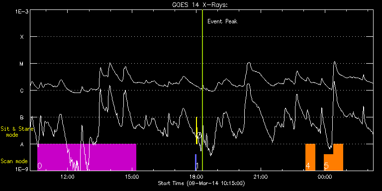 EIS Observation timeline overlay to GOES-Xray curve Code 1" 2" 40" 266" EIS Observations list for this event: STUDY ACRONYM ID DATE OBSERVED DESCRIPTION NOAA# TARGET 0 SK_CH_DIAG_320x384 | 39013 | 2014/03/09 10:35:25 | HOP206 at S-pole | | Coronal Hole TIMELINE ID DATE OBSERVED FITS FILE XCEN (+W/-E) YCEN (+N/-S) DUR ----------------------------------------------------------------------------------------------------------------- 39013 | 2014/03/09 10:35:25.000 | eis_l0_20140309_103525.fits.gz | -9873.96 | -9966.20 | 4h35m37s 1 PRY_slot_contextLITE | 39002 | 2014/03/09 17:56:32 | EIS-AIA alignment | 2000 | Active Region TIMELINE ID DATE OBSERVED FITS FILE XCEN (+W/-E) YCEN (+N/-S) DUR ----------------------------------------------------------------------------------------------------------------- 39002 | 2014/03/09 17:56:32.000 | eis_l0_20140309_175632.fits.gz | -15.21 | -0.35 | 2m56s 2 Alignment_266 | 39003 | 2014/03/09 17:59:46 | EIS-AIA alignment | 2000 | Quiet Sun TIMELINE ID DATE OBSERVED FITS FILE XCEN (+W/-E) YCEN (+N/-S) DUR ----------------------------------------------------------------------------------------------------------------- 39003 | 2014/03/09 17:59:46.000 | eis_l0_20140309_175946.fits.gz | -132.57 | -0.50 | 1m22s 3 XRT_synop_AIA | 39004 | 2014/03/09 18:02:19 | EIS-AIA alignment | 2000 | Quiet Sun TIMELINE ID DATE OBSERVED FITS FILE XCEN (+W/-E) YCEN (+N/-S) DUR ----------------------------------------------------------------------------------------------------------------- 39004 | 2014/03/09 18:02:19.000 | eis_l0_20140309_180219.fits.gz | -132.57 | -0.35 | 10s 4 PRY_footpoints_lite | 39014 | 2014/03/09 23:05:19 | IHOP246 (Hot Plasma in AR 11990 at W-l | 1990 | Active Region TIMELINE ID DATE OBSERVED FITS FILE XCEN (+W/-E) YCEN (+N/-S) DUR ----------------------------------------------------------------------------------------------------------------- 39014 | 2014/03/09 23:05:19.000 | eis_l0_20140309_230519.fits.gz | 911.71 | -211.53 | 26m21s 5 PRY_footpoints_lite | 39015 | 2014/03/09 23:57:12 | IHOP246 (Hot Plasma in AR 11990 at W-l | 1990 | Active Region TIMELINE ID DATE OBSERVED FITS FILE XCEN (+W/-E) YCEN (+N/-S) DUR ----------------------------------------------------------------------------------------------------------------- 39015 | 2014/03/09 23:57:12.000 | eis_l0_20140309_235712.fits.gz | 911.71 | -211.53 | 26m23s 39015 | 2014/03/10 00:23:38.000 | eis_l0_20140310_002338.fits.gz | 911.56 | -211.53 | 26m22s : Check study information : Download file : View thumbnails For this event, also check for: