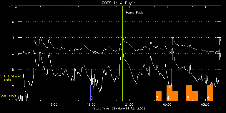 EIS Observation timeline overlay to GOES-Xray curve Code 1" 2" 40" 266" EIS Observations list for this event: STUDY ACRONYM ID DATE OBSERVED DESCRIPTION NOAA# TARGET 0 PRY_slot_contextLITE | 39002 | 2014/03/09 17:56:32 | EIS-AIA alignment | 2000 | Active Region TIMELINE ID DATE OBSERVED FITS FILE XCEN (+W/-E) YCEN (+N/-S) DUR ----------------------------------------------------------------------------------------------------------------- 39002 | 2014/03/09 17:56:32.000 | eis_l0_20140309_175632.fits.gz | -15.21 | -0.35 | 2m56s 1 Alignment_266 | 39003 | 2014/03/09 17:59:46 | EIS-AIA alignment | 2000 | Quiet Sun TIMELINE ID DATE OBSERVED FITS FILE XCEN (+W/-E) YCEN (+N/-S) DUR ----------------------------------------------------------------------------------------------------------------- 39003 | 2014/03/09 17:59:46.000 | eis_l0_20140309_175946.fits.gz | -132.57 | -0.50 | 1m22s 2 XRT_synop_AIA | 39004 | 2014/03/09 18:02:19 | EIS-AIA alignment | 2000 | Quiet Sun TIMELINE ID DATE OBSERVED FITS FILE XCEN (+W/-E) YCEN (+N/-S) DUR ----------------------------------------------------------------------------------------------------------------- 39004 | 2014/03/09 18:02:19.000 | eis_l0_20140309_180219.fits.gz | -132.57 | -0.35 | 10s 3 PRY_footpoints_lite | 39014 | 2014/03/09 23:05:19 | IHOP246 (Hot Plasma in AR 11990 at W-l | 1990 | Active Region TIMELINE ID DATE OBSERVED FITS FILE XCEN (+W/-E) YCEN (+N/-S) DUR ----------------------------------------------------------------------------------------------------------------- 39014 | 2014/03/09 23:05:19.000 | eis_l0_20140309_230519.fits.gz | 911.71 | -211.53 | 26m21s 4 PRY_footpoints_lite | 39015 | 2014/03/09 23:57:12 | IHOP246 (Hot Plasma in AR 11990 at W-l | 1990 | Active Region TIMELINE ID DATE OBSERVED FITS FILE XCEN (+W/-E) YCEN (+N/-S) DUR ----------------------------------------------------------------------------------------------------------------- 39015 | 2014/03/09 23:57:12.000 | eis_l0_20140309_235712.fits.gz | 911.71 | -211.53 | 26m23s 39015 | 2014/03/10 00:23:38.000 | eis_l0_20140310_002338.fits.gz | 911.56 | -211.53 | 26m22s 5 PRY_footpoints_lite | 39016 | 2014/03/10 01:30:38 | IHOP246 (Hot Plasma in AR 11990 at W-l | 1990 | Active Region TIMELINE ID DATE OBSERVED FITS FILE XCEN (+W/-E) YCEN (+N/-S) DUR ----------------------------------------------------------------------------------------------------------------- 39016 | 2014/03/10 01:30:38.000 | eis_l0_20140310_013038.fits.gz | 911.71 | -211.45 | 26m22s 39016 | 2014/03/10 01:57:03.000 | eis_l0_20140310_015703.fits.gz | 911.71 | -211.53 | 26m22s 6 PRY_footpoints_lite | 39017 | 2014/03/10 03:07:53 | IHOP246 (Hot Plasma in AR 11990 at W-l | 1990 | Active Region TIMELINE ID DATE OBSERVED FITS FILE XCEN (+W/-E) YCEN (+N/-S) DUR ----------------------------------------------------------------------------------------------------------------- 39017 | 2014/03/10 03:07:53.000 | eis_l0_20140310_030753.fits.gz | 911.79 | -211.60 | 26m22s : Check study information : Download file : View thumbnails For this event, also check for: