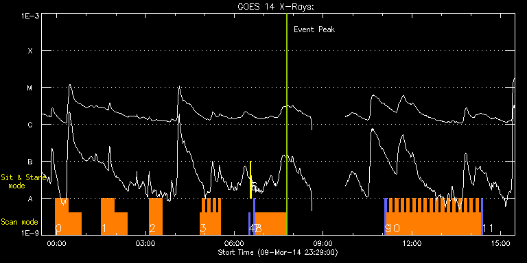 EIS Observation timeline overlay to GOES-Xray curve Code 1" 2" 40" 266" EIS Observations list for this event: STUDY ACRONYM ID DATE OBSERVED DESCRIPTION NOAA# TARGET 0 PRY_footpoints_lite | 39015 | 2014/03/09 23:57:12 | IHOP246 (Hot Plasma in AR 11990 at W-l | 1990 | Active Region TIMELINE ID DATE OBSERVED FITS FILE XCEN (+W/-E) YCEN (+N/-S) DUR ----------------------------------------------------------------------------------------------------------------- 39015 | 2014/03/09 23:57:12.000 | eis_l0_20140309_235712.fits.gz | 911.71 | -211.53 | 26m23s 39015 | 2014/03/10 00:23:38.000 | eis_l0_20140310_002338.fits.gz | 911.56 | -211.53 | 26m22s 1 PRY_footpoints_lite | 39016 | 2014/03/10 01:30:38 | IHOP246 (Hot Plasma in AR 11990 at W-l | 1990 | Active Region TIMELINE ID DATE OBSERVED FITS FILE XCEN (+W/-E) YCEN (+N/-S) DUR ----------------------------------------------------------------------------------------------------------------- 39016 | 2014/03/10 01:30:38.000 | eis_l0_20140310_013038.fits.gz | 911.71 | -211.45 | 26m22s 39016 | 2014/03/10 01:57:03.000 | eis_l0_20140310_015703.fits.gz | 911.71 | -211.53 | 26m22s 2 PRY_footpoints_lite | 39017 | 2014/03/10 03:07:53 | IHOP246 (Hot Plasma in AR 11990 at W-l | 1990 | Active Region TIMELINE ID DATE OBSERVED FITS FILE XCEN (+W/-E) YCEN (+N/-S) DUR ----------------------------------------------------------------------------------------------------------------- 39017 | 2014/03/10 03:07:53.000 | eis_l0_20140310_030753.fits.gz | 911.79 | -211.60 | 26m22s 3 HH_Flare+AR_180x152 | 39032 | 2014/03/10 04:49:53 | AR 11998 near disc center | 1998 | Flare TIMELINE ID DATE OBSERVED FITS FILE XCEN (+W/-E) YCEN (+N/-S) DUR ----------------------------------------------------------------------------------------------------------------- 39032 | 2014/03/10 04:49:53.000 | eis_l0_20140310_044953.fits.gz | -255.36 | -70.94 | 5m19s 39032 | 2014/03/10 04:55:15.000 | eis_l0_20140310_045515.fits.gz | -254.59 | -70.94 | 5m18s 39032 | 2014/03/10 05:00:36.000 | eis_l0_20140310_050036.fits.gz | -253.82 | -70.86 | 5m19s 39032 | 2014/03/10 05:05:57.000 | eis_l0_20140310_050557.fits.gz | -252.97 | -70.86 | 5m18s 39032 | 2014/03/10 05:11:18.000 | eis_l0_20140310_051118.fits.gz | -252.20 | -70.86 | 5m19s 39032 | 2014/03/10 05:16:39.000 | eis_l0_20140310_051639.fits.gz | -251.42 | -70.78 | 5m18s 39032 | 2014/03/10 05:22:00.000 | eis_l0_20140310_052200.fits.gz | -250.65 | -70.78 | 5m18s 39032 | 2014/03/10 05:27:21.000 | eis_l0_20140310_052721.fits.gz | -249.88 | -70.78 | 5m18s 4 PRY_slot_contextLITE | 39005 | 2014/03/10 06:28:48 | EIS-AIA alignment | 1998 | Active Region TIMELINE ID DATE OBSERVED FITS FILE XCEN (+W/-E) YCEN (+N/-S) DUR ----------------------------------------------------------------------------------------------------------------- 39005 | 2014/03/10 06:28:48.000 | eis_l0_20140310_062848.fits.gz | -15.21 | -0.35 | 2m57s 5 Alignment_266 | 39006 | 2014/03/10 06:32:03 | EIS-AIA alignment | 1998 | Quiet Sun TIMELINE ID DATE OBSERVED FITS FILE XCEN (+W/-E) YCEN (+N/-S) DUR ----------------------------------------------------------------------------------------------------------------- 39006 | 2014/03/10 06:32:03.000 | eis_l0_20140310_063203.fits.gz | -132.49 | -0.42 | 1m22s 6 XRT_synop_AIA | 39007 | 2014/03/10 06:34:36 | EIS-AIA alignment | 1998 | Quiet Sun TIMELINE ID DATE OBSERVED FITS FILE XCEN (+W/-E) YCEN (+N/-S) DUR ----------------------------------------------------------------------------------------------------------------- 39007 | 2014/03/10 06:34:36.000 | eis_l0_20140310_063436.fits.gz | -132.49 | -0.50 | 10s 7 PRY_slot_context_v3 | 39018 | 2014/03/10 06:38:55 | EIS spectral atlas, QS | 1999 | Active Region TIMELINE ID DATE OBSERVED FITS FILE XCEN (+W/-E) YCEN (+N/-S) DUR ----------------------------------------------------------------------------------------------------------------- 39018 | 2014/03/10 06:38:55.000 | eis_l0_20140310_063855.fits.gz | 434.18 | 26.63 | 2m56s 8 Atlas_60 | 39019 | 2014/03/10 06:42:44 | EIS spectral atlas, QS | | Quiet Sun TIMELINE ID DATE OBSERVED FITS FILE XCEN (+W/-E) YCEN (+N/-S) DUR ----------------------------------------------------------------------------------------------------------------- 39019 | 2014/03/10 06:42:44.000 | eis_l0_20140310_064244.fits.gz | 449.31 | 26.70 | 1h1m39s 9 PRY_slot_context_v3 | 39020 | 2014/03/10 11:05:18 | HOP243, QS, at S-pole | | Active Region TIMELINE ID DATE OBSERVED FITS FILE XCEN (+W/-E) YCEN (+N/-S) DUR ----------------------------------------------------------------------------------------------------------------- 39020 | 2014/03/10 11:05:18.000 | eis_l0_20140310_110518.fits.gz | -52.94 | -951.41 | 2m57s 10 Cor_Hole_Jet_v1 | 39021 | 2014/03/10 11:08:39 | HOP243, QS, at S-pole | | Quiet Sun TIMELINE ID DATE OBSERVED FITS FILE XCEN (+W/-E) YCEN (+N/-S) DUR ----------------------------------------------------------------------------------------------------------------- 39021 | 2014/03/10 11:08:39.000 | eis_l0_20140310_110839.fits.gz | -39.60 | -951.33 | 5m47s 39021 | 2014/03/10 11:14:29.000 | eis_l0_20140310_111429.fits.gz | -39.53 | -951.48 | 5m46s 39021 | 2014/03/10 11:20:18.000 | eis_l0_20140310_112018.fits.gz | -39.60 | -951.25 | 5m47s 39021 | 2014/03/10 11:26:08.000 | eis_l0_20140310_112608.fits.gz | -39.76 | -951.41 | 5m46s 39021 | 2014/03/10 11:31:57.000 | eis_l0_20140310_113157.fits.gz | -39.60 | -951.33 | 5m47s 39021 | 2014/03/10 11:37:47.000 | eis_l0_20140310_113747.fits.gz | -39.60 | -951.33 | 5m46s 39021 | 2014/03/10 11:43:36.000 | eis_l0_20140310_114336.fits.gz | -39.60 | -951.41 | 5m47s 39021 | 2014/03/10 11:49:26.000 | eis_l0_20140310_114926.fits.gz | -39.60 | -951.48 | 5m47s 39021 | 2014/03/10 11:55:16.000 | eis_l0_20140310_115516.fits.gz | -39.60 | -951.33 | 5m46s 39021 | 2014/03/10 12:01:05.000 | eis_l0_20140310_120105.fits.gz | -39.60 | -951.33 | 5m47s 39021 | 2014/03/10 12:06:55.000 | eis_l0_20140310_120655.fits.gz | -39.53 | -951.33 | 5m47s 39021 | 2014/03/10 12:12:45