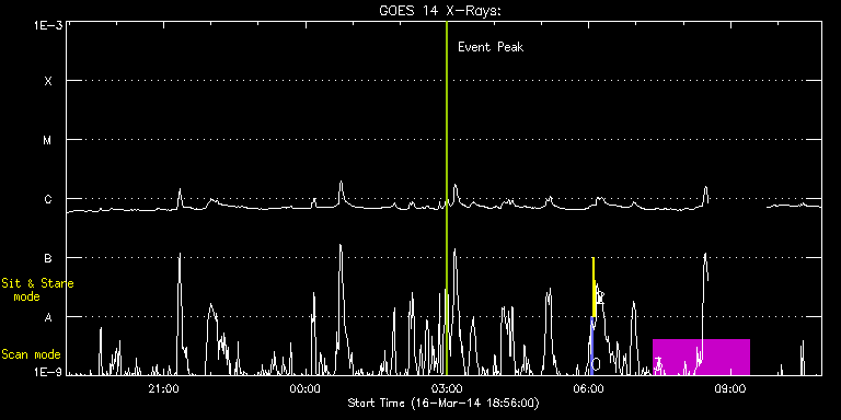 EIS Observation timeline overlay to GOES-Xray curve Code 1" 2" 40" 266" EIS Observations list for this event: STUDY ACRONYM ID DATE OBSERVED DESCRIPTION NOAA# TARGET 0 PRY_slot_contextLITE | 39179 | 2014/03/17 06:02:33 | Change of EIS pointing and alignment w | | Active Region TIMELINE ID DATE OBSERVED FITS FILE XCEN (+W/-E) YCEN (+N/-S) DUR ----------------------------------------------------------------------------------------------------------------- 39179 | 2014/03/17 06:02:33.000 | eis_l0_20140317_060233.fits.gz | -15.29 | -0.19 | 2m56s 1 Alignment_266 | 39180 | 2014/03/17 06:05:47 | Change of EIS pointing and alignment w | | Quiet Sun TIMELINE ID DATE OBSERVED FITS FILE XCEN (+W/-E) YCEN (+N/-S) DUR ----------------------------------------------------------------------------------------------------------------- 39180 | 2014/03/17 06:05:47.000 | eis_l0_20140317_060547.fits.gz | -132.49 | -0.42 | 1m22s 2 XRT_synop_AIA | 39181 | 2014/03/17 06:07:54 | Change of EIS pointing and alignment w | | Quiet Sun TIMELINE ID DATE OBSERVED FITS FILE XCEN (+W/-E) YCEN (+N/-S) DUR ----------------------------------------------------------------------------------------------------------------- 39181 | 2014/03/17 06:07:54.000 | eis_l0_20140317_060754.fits.gz | -132.49 | -0.42 | 10s 3 HPW021_VEL_240x512v1 | 39189 | 2014/03/17 07:21:03 | Tracking AR across disk. | 2005 | Active Region TIMELINE ID DATE OBSERVED FITS FILE XCEN (+W/-E) YCEN (+N/-S) DUR ----------------------------------------------------------------------------------------------------------------- 39189 | 2014/03/17 07:21:03.000 | eis_l0_20140317_072103.fits.gz | -353.38 | 306.35 | 2h3m47s : Check study information : Download file : View thumbnails For this event, also check for: