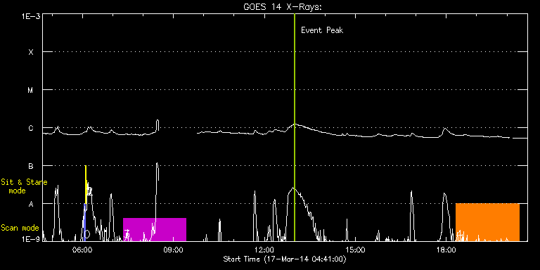 EIS Observation timeline overlay to GOES-Xray curve Code 1" 2" 40" 266" EIS Observations list for this event: STUDY ACRONYM ID DATE OBSERVED DESCRIPTION NOAA# TARGET 0 PRY_slot_contextLITE | 39179 | 2014/03/17 06:02:33 | Change of EIS pointing and alignment w | | Active Region TIMELINE ID DATE OBSERVED FITS FILE XCEN (+W/-E) YCEN (+N/-S) DUR ----------------------------------------------------------------------------------------------------------------- 39179 | 2014/03/17 06:02:33.000 | eis_l0_20140317_060233.fits.gz | -15.29 | -0.19 | 2m56s 1 Alignment_266 | 39180 | 2014/03/17 06:05:47 | Change of EIS pointing and alignment w | | Quiet Sun TIMELINE ID DATE OBSERVED FITS FILE XCEN (+W/-E) YCEN (+N/-S) DUR ----------------------------------------------------------------------------------------------------------------- 39180 | 2014/03/17 06:05:47.000 | eis_l0_20140317_060547.fits.gz | -132.49 | -0.42 | 1m22s 2 XRT_synop_AIA | 39181 | 2014/03/17 06:07:54 | Change of EIS pointing and alignment w | | Quiet Sun TIMELINE ID DATE OBSERVED FITS FILE XCEN (+W/-E) YCEN (+N/-S) DUR ----------------------------------------------------------------------------------------------------------------- 39181 | 2014/03/17 06:07:54.000 | eis_l0_20140317_060754.fits.gz | -132.49 | -0.42 | 10s 3 HPW021_VEL_240x512v1 | 39189 | 2014/03/17 07:21:03 | Tracking AR across disk. | 2005 | Active Region TIMELINE ID DATE OBSERVED FITS FILE XCEN (+W/-E) YCEN (+N/-S) DUR ----------------------------------------------------------------------------------------------------------------- 39189 | 2014/03/17 07:21:03.000 | eis_l0_20140317_072103.fits.gz | -353.38 | 306.35 | 2h3m47s 4 cam_ar_limb_lite_v2 | 39185 | 2014/03/17 18:18:25 | AR temperature diagnostic of limb AR. | | Active Region TIMELINE ID DATE OBSERVED FITS FILE XCEN (+W/-E) YCEN (+N/-S) DUR ----------------------------------------------------------------------------------------------------------------- 39185 | 2014/03/17 18:18:25.000 | eis_l0_20140317_181825.fits.gz | -9972.29 | -9910.20 | 2h6m1s : Check study information : Download file : View thumbnails For this event, also check for: