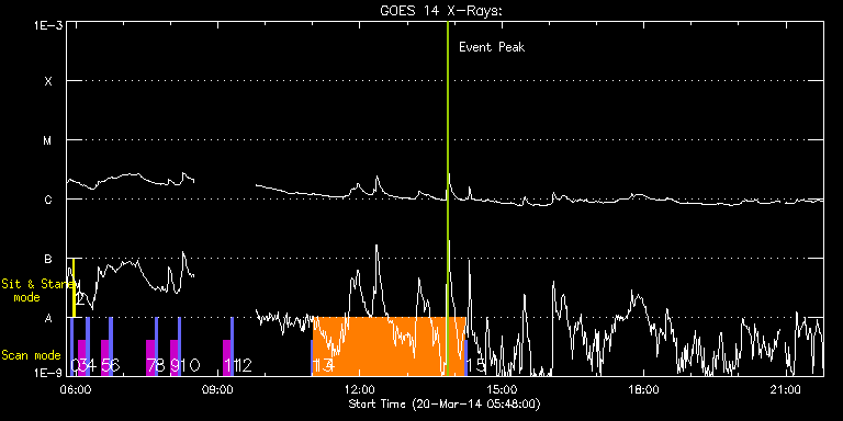 EIS Observation timeline overlay to GOES-Xray curve Code 1" 2" 40" 266" EIS Observations list for this event: STUDY ACRONYM ID DATE OBSERVED DESCRIPTION NOAA# TARGET 0 PRY_slot_contextLITE | 39200 | 2014/03/20 05:53:10 | Change of EIS pointing and alignment w | | Active Region TIMELINE ID DATE OBSERVED FITS FILE XCEN (+W/-E) YCEN (+N/-S) DUR ----------------------------------------------------------------------------------------------------------------- 39200 | 2014/03/20 05:53:10.000 | eis_l0_20140320_055310.fits.gz | -15.14 | -0.42 | 2m56s 1 Alignment_266 | 39201 | 2014/03/20 05:56:24 | Change of EIS pointing and alignment w | | Quiet Sun TIMELINE ID DATE OBSERVED FITS FILE XCEN (+W/-E) YCEN (+N/-S) DUR ----------------------------------------------------------------------------------------------------------------- 39201 | 2014/03/20 05:56:24.000 | eis_l0_20140320_055624.fits.gz | -132.49 | -0.50 | 1m22s 2 XRT_synop_AIA | 39202 | 2014/03/20 05:58:58 | Change of EIS pointing and alignment w | | Quiet Sun TIMELINE ID DATE OBSERVED FITS FILE XCEN (+W/-E) YCEN (+N/-S) DUR ----------------------------------------------------------------------------------------------------------------- 39202 | 2014/03/20 05:58:58.000 | eis_l0_20140320_055858.fits.gz | -132.57 | -0.35 | 11s 3 SK_DEEP_5x512_SLIT1 | 39233 | 2014/03/20 06:03:03 | Synoptic SOT Irradiance Scans | | Quiet Sun TIMELINE ID DATE OBSERVED FITS FILE XCEN (+W/-E) YCEN (+N/-S) DUR ----------------------------------------------------------------------------------------------------------------- 39233 | 2014/03/20 06:03:03.000 | eis_l0_20140320_060303.fits.gz | -7.97 | 542.40 | 10m7s 4 PRY_slot_contextLITE | 39234 | 2014/03/20 06:13:36 | Synoptic SOT Irradiance Scans | | Active Region TIMELINE ID DATE OBSERVED FITS FILE XCEN (+W/-E) YCEN (+N/-S) DUR ----------------------------------------------------------------------------------------------------------------- 39234 | 2014/03/20 06:13:36.000 | eis_l0_20140320_061336.fits.gz | -22.94 | 542.47 | 2m56s 5 SK_DEEP_5x512_SLIT1 | 39235 | 2014/03/20 06:32:19 | Synoptic SOT Irradiance Scans | | Quiet Sun TIMELINE ID DATE OBSERVED FITS FILE XCEN (+W/-E) YCEN (+N/-S) DUR ----------------------------------------------------------------------------------------------------------------- 39235 | 2014/03/20 06:32:19.000 | eis_l0_20140320_063219.fits.gz | -7.89 | 642.59 | 10m8s 6 PRY_slot_contextLITE | 39236 | 2014/03/20 06:42:52 | Synoptic SOT Irradiance Scans | | Active Region TIMELINE ID DATE OBSERVED FITS FILE XCEN (+W/-E) YCEN (+N/-S) DUR ----------------------------------------------------------------------------------------------------------------- 39236 | 2014/03/20 06:42:52.000 | eis_l0_20140320_064252.fits.gz | -22.87 | 642.51 | 2m57s 7 SK_DEEP_5x512_SLIT1 | 39237 | 2014/03/20 07:29:49 | Synoptic SOT Irradiance Scans | | Quiet Sun TIMELINE ID DATE OBSERVED FITS FILE XCEN (+W/-E) YCEN (+N/-S) DUR ----------------------------------------------------------------------------------------------------------------- 39237 | 2014/03/20 07:29:49.000 | eis_l0_20140320_072949.fits.gz | -7.89 | 742.47 | 10m8s 8 PRY_slot_contextLITE | 39238 | 2014/03/20 07:40:22 | Synoptic SOT Irradiance Scans | | Active Region TIMELINE ID DATE OBSERVED FITS FILE XCEN (+W/-E) YCEN (+N/-S) DUR ----------------------------------------------------------------------------------------------------------------- 39238 | 2014/03/20 07:40:22.000 | eis_l0_20140320_074022.fits.gz | -22.87 | 742.55 | 2m57s 9 SK_DEEP_5x512_SLIT1 | 39239 | 2014/03/20 07:59:49 | Synoptic SOT Irradiance Scans | | Quiet Sun TIMELINE ID DATE OBSERVED FITS FILE XCEN (+W/-E) YCEN (+N/-S) DUR ----------------------------------------------------------------------------------------------------------------- 39239 | 2014/03/20 07:59:49.000 | eis_l0_20140320_075949.fits.gz | -7.89 | 842.81 | 10m8s 10 PRY_slot_contextLITE | 39240 | 2014/03/20 08:10:22 | Synoptic SOT Irradiance Scans | | Active Region TIMELINE ID DATE OBSERVED FITS FILE XCEN (+W/-E) YCEN (+N/-S) DUR ----------------------------------------------------------------------------------------------------------------- 39240 | 2014/03/20 08:10:22.000 | eis_l0_20140320_081022.fits.gz | -22.87 | 842.58 | 2m56s 11 SK_DEEP_5x512_SLIT1 | 39241 | 2014/03/20 09:06:19 | Synoptic SOT Irradiance Scans | | Quiet Sun TIMELINE ID DATE OBSERVED FITS FILE XCEN (+W/-E) YCEN (+N/-S) DUR ----------------------------------------------------------------------------------------------------------------- 39241 | 2014/03/20 09:06:19.000 | eis_l0_20140320_090619.fits.gz | -7.89 | 942.31 | 10m8s 12 PRY_slot_contextLITE | 39242 | 2014/03/20 09:16:52 | Synoptic SOT Irradiance Scans | | Active Region TIMELINE ID DATE OBSERVED FITS FILE XCEN (+W/-E) YCEN (+N/-S) DUR ----------------------------------------------------------------------------------------------------------------- 39242 | 2014/03/20 09:16:52.000 | eis_l0_20140320_091652.fits.gz | -22.94 | 942.31 | 2m56s 13 PRY_slot_context_v3 | 39252 | 2014/03/20 10:58:13 | Hot plage/AR moss | 2005 | Active Region TIMELINE ID DATE OBSERVED FITS FILE XCEN (+W/-E) YCEN (+N/-S) DUR ----------------------------------------------------------------------------------------------------------------- 39252 | 2014/03/20 10:58:13.000 | eis_l0_20140320_105813.fits.gz | 256.51 | 306.82 | 2m56s 14 Fast_moss_scan | 39256 | 2014/03/20 11:01:35 | Hot plage/AR moss | | Active Region TIMELINE ID DATE OBSERVED FITS FILE XCEN (+W/-E) YCEN (+N/-S) DUR ----------------------------------------------------------------------------------------------------------------- 39256 | 2014/03/20 11:01:35.000 | eis_l0_20140320_110135.fits.gz | 270.04 | 306.98 | 18s 39256 | 2014/03/20 11:01:56.000 | eis_l0_20140320_110156.fits.gz | 270.04 | 306.90 | 19s 39256 | 2014/03/20 11:02:17.000 | eis_l0_20140320_110217.fits.gz | 270.12 | 306.82 | 19s 39256 | 2014/03/20 11:02:39.000 | eis_l0_20140320_110239.fits.gz | 270.12 | 306.90 | 18s 39256 | 