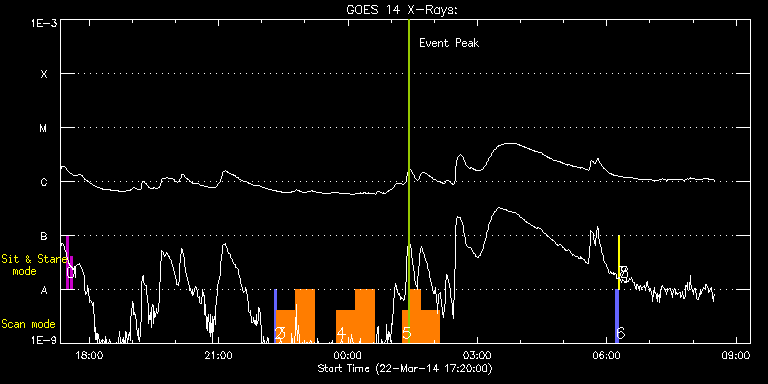 EIS Observation timeline overlay to GOES-Xray curve Code 1" 2" 40" 266" EIS Observations list for this event: STUDY ACRONYM ID DATE OBSERVED DESCRIPTION NOAA# TARGET 0 regcal071 | 39272 | 2014/03/22 17:27:41 | Dark exposures, CCD bottom rows (100s | | Engineering TIMELINE ID DATE OBSERVED FITS FILE XCEN (+W/-E) YCEN (+N/-S) DUR ----------------------------------------------------------------------------------------------------------------- 39272 | 2014/03/22 17:27:41.000 | eis_l0_20140322_172741.fits.gz | -619.77 | -451.81 | 3m22s 1 regcal072 | 39273 | 2014/03/22 17:34:01 | Dark exposures, top CCD rows (100s exp | | Engineering TIMELINE ID DATE OBSERVED FITS FILE XCEN (+W/-E) YCEN (+N/-S) DUR ----------------------------------------------------------------------------------------------------------------- 39273 | 2014/03/22 17:34:01.000 | eis_l0_20140322_173401.fits.gz | -619.15 | 59.27 | 3m22s 2 PRY_slot_context_v3 | 39333 | 2014/03/22 22:17:33 | Hot plasma in active regions | 2014 | Active Region TIMELINE ID DATE OBSERVED FITS FILE XCEN (+W/-E) YCEN (+N/-S) DUR ----------------------------------------------------------------------------------------------------------------- 39333 | 2014/03/22 22:17:33.000 | eis_l0_20140322_221733.fits.gz | -605.66 | -150.56 | 2m56s 3 PRY_footpoints_lite | 39334 | 2014/03/22 22:20:55 | Hot plasma in active regions | | Active Region TIMELINE ID DATE OBSERVED FITS FILE XCEN (+W/-E) YCEN (+N/-S) DUR ----------------------------------------------------------------------------------------------------------------- 39334 | 2014/03/22 22:20:55.000 | eis_l0_20140322_222055.fits.gz | -590.61 | -150.49 | 26m22s 39334 | 2014/03/22 22:47:20.000 | eis_l0_20140322_224720.fits.gz | -587.45 | -150.18 | 26m22s 4 PRY_footpoints_lite | 39339 | 2014/03/22 23:44:10 | Hot plasma in active regions | | Active Region TIMELINE ID DATE OBSERVED FITS FILE XCEN (+W/-E) YCEN (+N/-S) DUR ----------------------------------------------------------------------------------------------------------------- 39339 | 2014/03/22 23:44:10.000 | eis_l0_20140322_234410.fits.gz | -580.96 | -149.33 | 26m22s 39339 | 2014/03/23 00:10:35.000 | eis_l0_20140323_001035.fits.gz | -577.79 | -149.17 | 26m22s 5 PRY_footpoints_lite | 39341 | 2014/03/23 01:15:10 | Hot plasma in active regions | 2014 | Active Region TIMELINE ID DATE OBSERVED FITS FILE XCEN (+W/-E) YCEN (+N/-S) DUR ----------------------------------------------------------------------------------------------------------------- 39341 | 2014/03/23 01:15:10.000 | eis_l0_20140323_011510.fits.gz | -570.30 | -148.32 | 12m7s 39341 | 2014/03/23 01:26:46.000 | eis_l0_20140323_012646.fits.gz | -568.91 | -148.17 | 14m46s 39341 | 2014/03/23 01:41:35.000 | eis_l0_20140323_014135.fits.gz | -567.21 | -148.24 | 26m22s 6 PRY_slot_contextLITE | 39263 | 2014/03/23 06:12:49 | Change of EIS pointing and alignment w | 2010 | Active Region TIMELINE ID DATE OBSERVED FITS FILE XCEN (+W/-E) YCEN (+N/-S) DUR ----------------------------------------------------------------------------------------------------------------- 39263 | 2014/03/23 06:12:49.000 | eis_l0_20140323_061249.fits.gz | -15.14 | -0.27 | 2m57s 7 Alignment_266 | 39264 | 2014/03/23 06:16:04 | Change of EIS pointing and alignment w | 2010 | Quiet Sun TIMELINE ID DATE OBSERVED FITS FILE XCEN (+W/-E) YCEN (+N/-S) DUR ----------------------------------------------------------------------------------------------------------------- 39264 | 2014/03/23 06:16:04.000 | eis_l0_20140323_061604.fits.gz | -132.49 | -0.27 | 1m22s 8 XRT_synop_AIA | 39265 | 2014/03/23 06:18:11 | Change of EIS pointing and alignment w | 2010 | Quiet Sun TIMELINE ID DATE OBSERVED FITS FILE XCEN (+W/-E) YCEN (+N/-S) DUR ----------------------------------------------------------------------------------------------------------------- 39265 | 2014/03/23 06:18:11.000 | eis_l0_20140323_061811.fits.gz | -132.57 | -0.42 | 10s : Check study information : Download file : View thumbnails For this event, also check for: