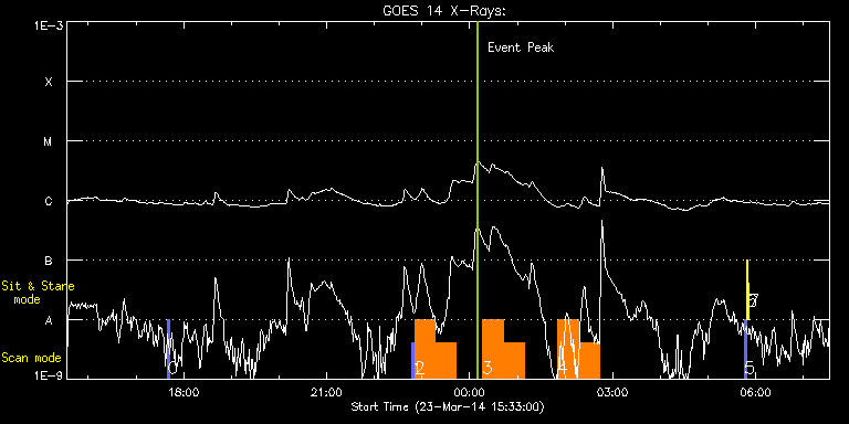 EIS Observation timeline overlay to GOES-Xray curve Code 1" 2" 40" 266" EIS Observations list for this event: STUDY ACRONYM ID DATE OBSERVED DESCRIPTION NOAA# TARGET 0 PRY_slot_context_v3 | 39329 | 2014/03/23 17:40:04 | Spectropolarimetry of flares | 2014 | Active Region TIMELINE ID DATE OBSERVED FITS FILE XCEN (+W/-E) YCEN (+N/-S) DUR ----------------------------------------------------------------------------------------------------------------- 39329 | 2014/03/23 17:40:04.000 | eis_l0_20140323_174004.fits.gz | -462.21 | -139.82 | 2m57s 1 PRY_slot_context_v3 | 39335 | 2014/03/23 22:47:12 | Hot plasma in active regions | 2014 | Active Region TIMELINE ID DATE OBSERVED FITS FILE XCEN (+W/-E) YCEN (+N/-S) DUR ----------------------------------------------------------------------------------------------------------------- 39335 | 2014/03/23 22:47:12.000 | eis_l0_20140323_224712.fits.gz | -421.35 | -136.35 | 2m56s 2 PRY_footpoints_lite | 39336 | 2014/03/23 22:50:34 | Hot plasma in active regions | | Active Region TIMELINE ID DATE OBSERVED FITS FILE XCEN (+W/-E) YCEN (+N/-S) DUR ----------------------------------------------------------------------------------------------------------------- 39336 | 2014/03/23 22:50:34.000 | eis_l0_20140323_225034.fits.gz | -406.22 | -136.20 | 26m22s 39336 | 2014/03/23 23:16:59.000 | eis_l0_20140323_231659.fits.gz | -402.67 | -136.04 | 26m22s 3 PRY_footpoints_lite | 39342 | 2014/03/24 00:15:42 | Hot plasma in active regions | | Active Region TIMELINE ID DATE OBSERVED FITS FILE XCEN (+W/-E) YCEN (+N/-S) DUR ----------------------------------------------------------------------------------------------------------------- 39342 | 2014/03/24 00:15:42.000 | eis_l0_20140324_001542.fits.gz | -394.71 | -135.50 | 26m22s 39342 | 2014/03/24 00:42:07.000 | eis_l0_20140324_004207.fits.gz | -391.16 | -135.42 | 26m23s 4 PRY_footpoints_lite | 39344 | 2014/03/24 01:50:12 | Hot plasma in active regions | | Active Region TIMELINE ID DATE OBSERVED FITS FILE XCEN (+W/-E) YCEN (+N/-S) DUR ----------------------------------------------------------------------------------------------------------------- 39344 | 2014/03/24 01:50:12.000 | eis_l0_20140324_015012.fits.gz | -381.81 | -134.96 | 26m22s 39344 | 2014/03/24 02:16:38.000 | eis_l0_20140324_021638.fits.gz | -378.18 | -134.80 | 26m22s 5 PRY_slot_contextLITE | 39266 | 2014/03/24 05:45:49 | Change of EIS pointing and alignment w | 2010 | Active Region TIMELINE ID DATE OBSERVED FITS FILE XCEN (+W/-E) YCEN (+N/-S) DUR ----------------------------------------------------------------------------------------------------------------- 39266 | 2014/03/24 05:45:49.000 | eis_l0_20140324_054549.fits.gz | -15.21 | -0.35 | 2m56s 6 Alignment_266 | 39267 | 2014/03/24 05:49:03 | Change of EIS pointing and alignment w | | Quiet Sun TIMELINE ID DATE OBSERVED FITS FILE XCEN (+W/-E) YCEN (+N/-S) DUR ----------------------------------------------------------------------------------------------------------------- 39267 | 2014/03/24 05:49:03.000 | eis_l0_20140324_054903.fits.gz | -132.57 | -0.35 | 1m22s 7 XRT_synop_AIA | 39268 | 2014/03/24 05:51:37 | Change of EIS pointing and alignment w | | Quiet Sun TIMELINE ID DATE OBSERVED FITS FILE XCEN (+W/-E) YCEN (+N/-S) DUR ----------------------------------------------------------------------------------------------------------------- 39268 | 2014/03/24 05:51:37.000 | eis_l0_20140324_055137.fits.gz | -132.57 | -0.50 | 10s : Check study information : Download file : View thumbnails For this event, also check for: