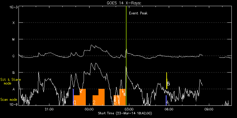EIS Observation timeline overlay to GOES-Xray curve Code 1" 2" 40" 266" EIS Observations list for this event: STUDY ACRONYM ID DATE OBSERVED DESCRIPTION NOAA# TARGET 0 PRY_slot_context_v3 | 39335 | 2014/03/23 22:47:12 | Hot plasma in active regions | 2014 | Active Region TIMELINE ID DATE OBSERVED FITS FILE XCEN (+W/-E) YCEN (+N/-S) DUR ----------------------------------------------------------------------------------------------------------------- 39335 | 2014/03/23 22:47:12.000 | eis_l0_20140323_224712.fits.gz | -421.35 | -136.35 | 2m56s 1 PRY_footpoints_lite | 39336 | 2014/03/23 22:50:34 | Hot plasma in active regions | | Active Region TIMELINE ID DATE OBSERVED FITS FILE XCEN (+W/-E) YCEN (+N/-S) DUR ----------------------------------------------------------------------------------------------------------------- 39336 | 2014/03/23 22:50:34.000 | eis_l0_20140323_225034.fits.gz | -406.22 | -136.20 | 26m22s 39336 | 2014/03/23 23:16:59.000 | eis_l0_20140323_231659.fits.gz | -402.67 | -136.04 | 26m22s 2 PRY_footpoints_lite | 39342 | 2014/03/24 00:15:42 | Hot plasma in active regions | | Active Region TIMELINE ID DATE OBSERVED FITS FILE XCEN (+W/-E) YCEN (+N/-S) DUR ----------------------------------------------------------------------------------------------------------------- 39342 | 2014/03/24 00:15:42.000 | eis_l0_20140324_001542.fits.gz | -394.71 | -135.50 | 26m22s 39342 | 2014/03/24 00:42:07.000 | eis_l0_20140324_004207.fits.gz | -391.16 | -135.42 | 26m23s 3 PRY_footpoints_lite | 39344 | 2014/03/24 01:50:12 | Hot plasma in active regions | | Active Region TIMELINE ID DATE OBSERVED FITS FILE XCEN (+W/-E) YCEN (+N/-S) DUR ----------------------------------------------------------------------------------------------------------------- 39344 | 2014/03/24 01:50:12.000 | eis_l0_20140324_015012.fits.gz | -381.81 | -134.96 | 26m22s 39344 | 2014/03/24 02:16:38.000 | eis_l0_20140324_021638.fits.gz | -378.18 | -134.80 | 26m22s 4 PRY_slot_contextLITE | 39266 | 2014/03/24 05:45:49 | Change of EIS pointing and alignment w | 2010 | Active Region TIMELINE ID DATE OBSERVED FITS FILE XCEN (+W/-E) YCEN (+N/-S) DUR ----------------------------------------------------------------------------------------------------------------- 39266 | 2014/03/24 05:45:49.000 | eis_l0_20140324_054549.fits.gz | -15.21 | -0.35 | 2m56s 5 Alignment_266 | 39267 | 2014/03/24 05:49:03 | Change of EIS pointing and alignment w | | Quiet Sun TIMELINE ID DATE OBSERVED FITS FILE XCEN (+W/-E) YCEN (+N/-S) DUR ----------------------------------------------------------------------------------------------------------------- 39267 | 2014/03/24 05:49:03.000 | eis_l0_20140324_054903.fits.gz | -132.57 | -0.35 | 1m22s 6 XRT_synop_AIA | 39268 | 2014/03/24 05:51:37 | Change of EIS pointing and alignment w | | Quiet Sun TIMELINE ID DATE OBSERVED FITS FILE XCEN (+W/-E) YCEN (+N/-S) DUR ----------------------------------------------------------------------------------------------------------------- 39268 | 2014/03/24 05:51:37.000 | eis_l0_20140324_055137.fits.gz | -132.57 | -0.50 | 10s : Check study information : Download file : View thumbnails For this event, also check for: