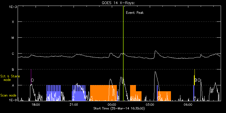 EIS Observation timeline overlay to GOES-Xray curve Code 1" 2" 40" 266" EIS Observations list for this event: STUDY ACRONYM ID DATE OBSERVED DESCRIPTION NOAA# TARGET 0 regcal077 | 39408 | 2014/03/25 17:37:22 | Flatfield, 2 exposures, led 80ms, full | | Engineering TIMELINE ID DATE OBSERVED FITS FILE XCEN (+W/-E) YCEN (+N/-S) DUR ----------------------------------------------------------------------------------------------------------------- 39408 | 2014/03/25 17:37:22.000 | eis_l0_20140325_173722.fits.gz | -5.03 | -170.47 | 4s 1 Alignment_modify_v2 | 39348 | 2014/03/25 18:52:01 | Hinode coalignment (N-limb) | | Quiet Sun TIMELINE ID DATE OBSERVED FITS FILE XCEN (+W/-E) YCEN (+N/-S) DUR ----------------------------------------------------------------------------------------------------------------- 39348 | 2014/03/25 18:52:01.000 | eis_l0_20140325_185201.fits.gz | -9.47 | 944.55 | 2m34s 39348 | 2014/03/25 18:55:09.000 | eis_l0_20140325_185509.fits.gz | -9.55 | 944.39 | 2m34s 39348 | 2014/03/25 18:58:16.000 | eis_l0_20140325_185816.fits.gz | -9.47 | 944.62 | 2m34s 39348 | 2014/03/25 19:01:24.000 | eis_l0_20140325_190124.fits.gz | -9.55 | 944.62 | 2m34s 39348 | 2014/03/25 19:04:31.000 | eis_l0_20140325_190431.fits.gz | -9.55 | 944.55 | 2m34s 39348 | 2014/03/25 19:07:39.000 | eis_l0_20140325_190739.fits.gz | -9.47 | 944.47 | 2m34s 39348 | 2014/03/25 19:10:46.000 | eis_l0_20140325_191046.fits.gz | -9.47 | 944.55 | 2m34s 39348 | 2014/03/25 19:13:54.000 | eis_l0_20140325_191354.fits.gz | -9.55 | 944.55 | 2m34s 39348 | 2014/03/25 19:17:01.000 | eis_l0_20140325_191701.fits.gz | -9.55 | 944.55 | 2m34s 39348 | 2014/03/25 19:20:09.000 | eis_l0_20140325_192009.fits.gz | -9.55 | 944.47 | 2m34s 39348 | 2014/03/25 19:23:16.000 | eis_l0_20140325_192316.fits.gz | -9.47 | 944.55 | 2m34s 39348 | 2014/03/25 19:26:24.000 | eis_l0_20140325_192624.fits.gz | -9.47 | 944.47 | 2m34s 39348 | 2014/03/25 19:29:31.000 | eis_l0_20140325_192931.fits.gz | -9.55 | 944.62 | 2m34s 39348 | 2014/03/25 19:32:39.000 | eis_l0_20140325_193239.fits.gz | -9.47 | 944.47 | 2m34s 39348 | 2014/03/25 19:35:47.000 | eis_l0_20140325_193547.fits.gz | -9.47 | 944.55 | 2m33s 39348 | 2014/03/25 19:38:54.000 | eis_l0_20140325_193854.fits.gz | -9.55 | 944.55 | 2m34s 39348 | 2014/03/25 19:42:02.000 | eis_l0_20140325_194202.fits.gz | -9.47 | 944.39 | 2m33s 39348 | 2014/03/25 19:45:09.000 | eis_l0_20140325_194509.fits.gz | -9.55 | 944.55 | 2m34s 39348 | 2014/03/25 19:48:17.000 | eis_l0_20140325_194817.fits.gz | -9.63 | 944.70 | 2m34s 39348 | 2014/03/25 19:51:24.000 | eis_l0_20140325_195124.fits.gz | -9.55 | 944.62 | 2m34s 39348 | 2014/03/25 19:54:32.000 | eis_l0_20140325_195432.fits.gz | -9.47 | 944.55 | 2m34s 2 Alignment_modify_v2 | 39349 | 2014/03/25 20:51:19 | Hinode coalignment (E-limb) | | Quiet Sun TIMELINE ID DATE OBSERVED FITS FILE XCEN (+W/-E) YCEN (+N/-S) DUR ----------------------------------------------------------------------------------------------------------------- 39349 | 2014/03/25 20:51:19.000 | eis_l0_20140325_205119.fits.gz | -9893.92 | -9963.20 | 2m34s 39349 | 2014/03/25 20:54:26.000 | eis_l0_20140325_205426.fits.gz | -9893.92 | -9963.20 | 2m34s 39349 | 2014/03/25 20:57:34.000 | eis_l0_20140325_205734.fits.gz | -9893.92 | -9963.20 | 2m34s 39349 | 2014/03/25 21:00:41.000 | eis_l0_20140325_210041.fits.gz | -9893.92 | -9963.20 | 2m34s 39349 | 2014/03/25 21:03:49.000 | eis_l0_20140325_210349.fits.gz | -9893.92 | -9963.20 | 2m34s 39349 | 2014/03/25 21:06:56.000 | eis_l0_20140325_210656.fits.gz | -9893.92 | -9963.20 | 2m34s 39349 | 2014/03/25 21:10:04.000 | eis_l0_20140325_211004.fits.gz | -9893.92 | -9963.20 | 2m34s 39349 | 2014/03/25 21:13:11.000 | eis_l0_20140325_211311.fits.gz | -9893.92 | -9963.20 | 2m34s 39349 | 2014/03/25 21:16:19.000 | eis_l0_20140325_211619.fits.gz | -9893.92 | -9963.20 | 2m34s 39349 | 2014/03/25 21:19:26.000 | eis_l0_20140325_211926.fits.gz | -9893.92 | -9963.20 | 2m34s 39349 | 2014/03/25 21:22:34.000 | eis_l0_20140325_212234.fits.gz | -9893.92 | -9963.20 | 2m34s 39349 | 2014/03/25 21:25:41.000 | eis_l0_20140325_212541.fits.gz | -9893.92 | -9963.20 | 2m34s 39349 | 2014/03/25 21:28:49.000 | eis_l0_20140325_212849.fits.gz | -9893.92 | -9963.20 | 2m34s 39349 | 2014/03/25 21:31:56.000 | eis_l0_20140325_213156.fits.gz | -9893.92 | -9963.20 | 2m34s 39349 | 2014/03/25 21:35:04.000 | eis_l0_20140325_213504.fits.gz | -9893.92 | -9963.20 | 2m34s 39349 | 2014/03/25 21:38:12.000 | eis_l0_20140325_213812.fits.gz | -9893.92 | -9963.20 | 2m34s 39349 | 2014/03/25 21:41:19.000 | eis_l0_20140325_214119.fits.gz | -9893.92 | -9963.20 | 2m34s 39349 | 2014/03/25 21:44:27.000 | eis_l0_20140325_214427.fits.gz | -9893.92 | -9963.20 | 2m34s 39349 | 2014/03/25 21:47:34.000 | eis_l0_20140325_214734.fits.gz | -9893.92 | -9963.20 | 2m34s 39349 | 2014/03/25 21:50:42.000 | eis_l0_20140325_215042.fits.gz | -9893.92 | -9963.20 | 2m34s 39349 | 2014/03/25 21:53:50.000 | eis_l0_20140325_215350.fits.gz | -9893.92 | -9963.20 | 2m34s 3 cam_ar_limb_lite_v2 | 39350 | 2014/03/25 22:17:03 | SE-limb AR temperature diagnostics | | Active Region TIMELINE ID DATE OBSERVED FITS FILE XCEN (+W/-E) YCEN (+N/-S) DUR ----------------------------------------------------------------------------------------------------------------- 39350 | 2014/03/25 22:17:03.000 | eis_l0_20140325_221703.fits.gz | -9931.10 | -9966.20 | 2h6m1s 4 PRY_slot_context_v3 | 39351 | 2014/03/26 00:23:15 | SE-limb AR temperature diagnostics | | Active Region TIMELINE ID DATE OBSERVED FITS FILE XCEN (+W/-E) YCEN (+N/-S) DUR ----------------------------------------------------------------------------------------------------------------- 39351 | 2014/03/26 00:23:15.000 | eis_l0_20140326_002315.fits.gz | -9906.90 | -9946.20 | 2m56s 5 PRY_footpoints_lite | 39389 | 2014/03/26 01:26:03 | HOP246 (AR 12014; hot plasma) | 2014 | Active Region TIMELINE ID DATE OBSERVED FITS FILE XCEN (+W/-E) YCEN (+N/-S) DUR --------------------------------------------------------------------------------------------