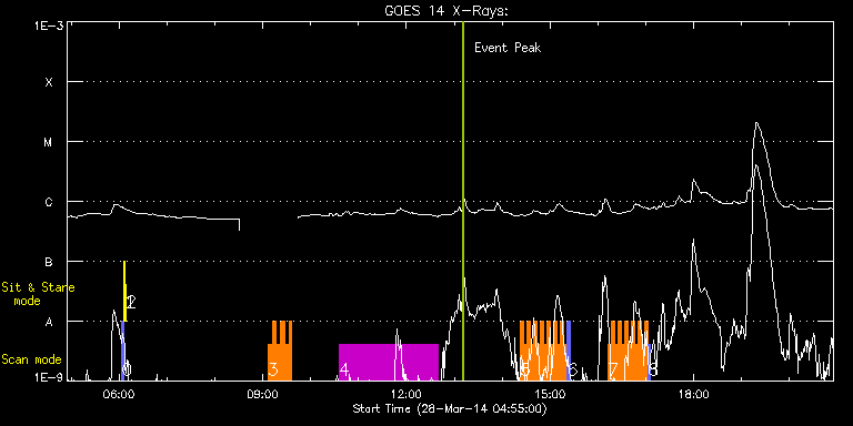 EIS Observation timeline overlay to GOES-Xray curve Code 1" 2" 40" 266" EIS Observations list for this event: STUDY ACRONYM ID DATE OBSERVED DESCRIPTION NOAA# TARGET 0 PRY_slot_contextLITE | 39410 | 2014/03/28 06:03:20 | EIS-AIA alignment | 2018 | Active Region TIMELINE ID DATE OBSERVED FITS FILE XCEN (+W/-E) YCEN (+N/-S) DUR ----------------------------------------------------------------------------------------------------------------- 39410 | 2014/03/28 06:03:20.000 | eis_l0_20140328_060320.fits.gz | -15.29 | -0.27 | 2m57s 1 Alignment_266 | 39411 | 2014/03/28 06:06:35 | EIS-AIA alignment | | Quiet Sun TIMELINE ID DATE OBSERVED FITS FILE XCEN (+W/-E) YCEN (+N/-S) DUR ----------------------------------------------------------------------------------------------------------------- 39411 | 2014/03/28 06:06:35.000 | eis_l0_20140328_060635.fits.gz | -132.57 | -0.35 | 1m22s 2 XRT_synop_AIA | 39412 | 2014/03/28 06:09:09 | EIS-AIA alignment | | Quiet Sun TIMELINE ID DATE OBSERVED FITS FILE XCEN (+W/-E) YCEN (+N/-S) DUR ----------------------------------------------------------------------------------------------------------------- 39412 | 2014/03/28 06:09:09.000 | eis_l0_20140328_060909.fits.gz | -132.57 | -0.58 | 10s 3 HH_Flare+AR_180x152 | 39429 | 2014/03/28 09:06:37 | AR 12014 obs | 2014 | Flare TIMELINE ID DATE OBSERVED FITS FILE XCEN (+W/-E) YCEN (+N/-S) DUR ----------------------------------------------------------------------------------------------------------------- 39429 | 2014/03/28 09:06:37.000 | eis_l0_20140328_090637.fits.gz | 533.98 | -155.37 | 5m17s 39429 | 2014/03/28 09:11:57.000 | eis_l0_20140328_091157.fits.gz | 534.52 | -155.45 | 5m17s 39429 | 2014/03/28 09:17:17.000 | eis_l0_20140328_091717.fits.gz | 535.14 | -155.53 | 5m18s 39429 | 2014/03/28 09:22:38.000 | eis_l0_20140328_092238.fits.gz | 535.91 | -155.60 | 5m18s 39429 | 2014/03/28 09:27:59.000 | eis_l0_20140328_092759.fits.gz | 536.53 | -155.68 | 5m18s 39429 | 2014/03/28 09:33:20.000 | eis_l0_20140328_093320.fits.gz | 537.22 | -155.68 | 3m10s 4 HPW021_VEL_240x512v1 | 39426 | 2014/03/28 10:35:27 | AR12014 raster scan obs (velocity map) | 2014 | Active Region TIMELINE ID DATE OBSERVED FITS FILE XCEN (+W/-E) YCEN (+N/-S) DUR ----------------------------------------------------------------------------------------------------------------- 39426 | 2014/03/28 10:35:27.000 | eis_l0_20140328_103527.fits.gz | 546.95 | -156.30 | 2h3m47s 5 HH_Flare_162x152 | 39420 | 2014/03/28 14:22:27 | IHOP251 (AR12014, flare region) with I | 2014 | Flare TIMELINE ID DATE OBSERVED FITS FILE XCEN (+W/-E) YCEN (+N/-S) DUR ----------------------------------------------------------------------------------------------------------------- 39420 | 2014/03/28 14:22:27.000 | eis_l0_20140328_142227.fits.gz | 574.17 | -159.77 | 4m10s 39420 | 2014/03/28 14:26:40.000 | eis_l0_20140328_142640.fits.gz | 574.71 | -159.77 | 4m11s 39420 | 2014/03/28 14:30:54.000 | eis_l0_20140328_143054.fits.gz | 575.18 | -159.85 | 4m10s 39420 | 2014/03/28 14:35:07.000 | eis_l0_20140328_143507.fits.gz | 575.72 | -159.85 | 4m11s 39420 | 2014/03/28 14:39:20.000 | eis_l0_20140328_143920.fits.gz | 576.18 | -160.00 | 4m11s 39420 | 2014/03/28 14:43:34.000 | eis_l0_20140328_144334.fits.gz | 576.72 | -160.08 | 4m10s 39420 | 2014/03/28 14:47:47.000 | eis_l0_20140328_144747.fits.gz | 577.18 | -160.00 | 4m11s 39420 | 2014/03/28 14:52:01.000 | eis_l0_20140328_145201.fits.gz | 577.57 | -160.08 | 4m10s 39420 | 2014/03/28 14:56:14.000 | eis_l0_20140328_145614.fits.gz | 578.11 | -160.16 | 4m11s 39420 | 2014/03/28 15:00:28.000 | eis_l0_20140328_150028.fits.gz | 578.58 | -160.23 | 4m10s 39420 | 2014/03/28 15:04:41.000 | eis_l0_20140328_150441.fits.gz | 579.12 | -160.23 | 4m10s 39420 | 2014/03/28 15:08:54.000 | eis_l0_20140328_150854.fits.gz | 579.58 | -160.23 | 4m11s 39420 | 2014/03/28 15:13:08.000 | eis_l0_20140328_151308.fits.gz | 580.04 | -160.31 | 4m10s 39420 | 2014/03/28 15:17:21.000 | eis_l0_20140328_151721.fits.gz | 580.58 | -160.31 | 4m11s 6 PRY_slot_context_v3 | 39435 | 2014/03/28 15:21:43 | IHOP251 (AR12014) | 2014 | Active Region TIMELINE ID DATE OBSERVED FITS FILE XCEN (+W/-E) YCEN (+N/-S) DUR ----------------------------------------------------------------------------------------------------------------- 39435 | 2014/03/28 15:21:43.000 | eis_l0_20140328_152143.fits.gz | 565.81 | -159.39 | 2m56s 7 HH_Flare_162x152 | 39421 | 2014/03/28 16:12:04 | IHOP251 (AR12014, flare region) with I | | Flare TIMELINE ID DATE OBSERVED FITS FILE XCEN (+W/-E) YCEN (+N/-S) DUR ----------------------------------------------------------------------------------------------------------------- 39421 | 2014/03/28 16:12:04.000 | eis_l0_20140328_161204.fits.gz | 587.00 | -161.01 | 4m10s 39421 | 2014/03/28 16:16:17.000 | eis_l0_20140328_161617.fits.gz | 587.46 | -161.16 | 4m10s 39421 | 2014/03/28 16:20:30.000 | eis_l0_20140328_162030.fits.gz | 587.85 | -161.01 | 4m11s 39421 | 2014/03/28 16:24:44.000 | eis_l0_20140328_162444.fits.gz | 588.46 | -161.08 | 4m11s 39421 | 2014/03/28 16:28:57.000 | eis_l0_20140328_162857.fits.gz | 588.85 | -161.24 | 4m11s 39421 | 2014/03/28 16:33:11.000 | eis_l0_20140328_163311.fits.gz | 589.39 | -161.16 | 4m10s 39421 | 2014/03/28 16:37:24.000 | eis_l0_20140328_163724.fits.gz | 589.93 | -161.24 | 4m11s 39421 | 2014/03/28 16:41:38.000 | eis_l0_20140328_164138.fits.gz | 590.40 | -161.32 | 4m10s 39421 | 2014/03/28 16:45:51.000 | eis_l0_20140328_164551.fits.gz | 590.86 | -161.55 | 4m10s 39421 | 2014/03/28 16:50:04.000 | eis_l0_20140328_165004.fits.gz | 591.32 | -161.32 | 4m11s 39421 | 2014/03/28 16:54:18.000 | eis_l0_20140328_165418.fits.gz | 591.94 | -161.62 | 4m10s 39421 | 2014/03/28 16:58:31.000 | eis_l0_20140328_165831.fits.gz | 592.33 | -161.47 | 4m11s 8 PRY_slot_context_v3 | 39436 | 2014/03/28 17:02:53 | IHOP251 (AR12014) | 2014 | Active Region TIMELINE ID DATE OBSERVED FITS FILE XCEN (+W/-E) YCEN (+N/-S) DUR ------------------------------------------------------------------------------