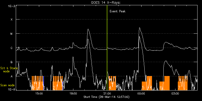 EIS Observation timeline overlay to GOES-Xray curve Code 1" 2" 40" 266" EIS Observations list for this event: STUDY ACRONYM ID DATE OBSERVED DESCRIPTION NOAA# TARGET 0 HH_Flare_162x152 | 39420 | 2014/03/28 14:22:27 | IHOP251 (AR12014, flare region) with I | 2014 | Flare TIMELINE ID DATE OBSERVED FITS FILE XCEN (+W/-E) YCEN (+N/-S) DUR ----------------------------------------------------------------------------------------------------------------- 39420 | 2014/03/28 14:22:27.000 | eis_l0_20140328_142227.fits.gz | 574.17 | -159.77 | 4m10s 39420 | 2014/03/28 14:26:40.000 | eis_l0_20140328_142640.fits.gz | 574.71 | -159.77 | 4m11s 39420 | 2014/03/28 14:30:54.000 | eis_l0_20140328_143054.fits.gz | 575.18 | -159.85 | 4m10s 39420 | 2014/03/28 14:35:07.000 | eis_l0_20140328_143507.fits.gz | 575.72 | -159.85 | 4m11s 39420 | 2014/03/28 14:39:20.000 | eis_l0_20140328_143920.fits.gz | 576.18 | -160.00 | 4m11s 39420 | 2014/03/28 14:43:34.000 | eis_l0_20140328_144334.fits.gz | 576.72 | -160.08 | 4m10s 39420 | 2014/03/28 14:47:47.000 | eis_l0_20140328_144747.fits.gz | 577.18 | -160.00 | 4m11s 39420 | 2014/03/28 14:52:01.000 | eis_l0_20140328_145201.fits.gz | 577.57 | -160.08 | 4m10s 39420 | 2014/03/28 14:56:14.000 | eis_l0_20140328_145614.fits.gz | 578.11 | -160.16 | 4m11s 39420 | 2014/03/28 15:00:28.000 | eis_l0_20140328_150028.fits.gz | 578.58 | -160.23 | 4m10s 39420 | 2014/03/28 15:04:41.000 | eis_l0_20140328_150441.fits.gz | 579.12 | -160.23 | 4m10s 39420 | 2014/03/28 15:08:54.000 | eis_l0_20140328_150854.fits.gz | 579.58 | -160.23 | 4m11s 39420 | 2014/03/28 15:13:08.000 | eis_l0_20140328_151308.fits.gz | 580.04 | -160.31 | 4m10s 39420 | 2014/03/28 15:17:21.000 | eis_l0_20140328_151721.fits.gz | 580.58 | -160.31 | 4m11s 1 PRY_slot_context_v3 | 39435 | 2014/03/28 15:21:43 | IHOP251 (AR12014) | 2014 | Active Region TIMELINE ID DATE OBSERVED FITS FILE XCEN (+W/-E) YCEN (+N/-S) DUR ----------------------------------------------------------------------------------------------------------------- 39435 | 2014/03/28 15:21:43.000 | eis_l0_20140328_152143.fits.gz | 565.81 | -159.39 | 2m56s 2 HH_Flare_162x152 | 39421 | 2014/03/28 16:12:04 | IHOP251 (AR12014, flare region) with I | | Flare TIMELINE ID DATE OBSERVED FITS FILE XCEN (+W/-E) YCEN (+N/-S) DUR ----------------------------------------------------------------------------------------------------------------- 39421 | 2014/03/28 16:12:04.000 | eis_l0_20140328_161204.fits.gz | 587.00 | -161.01 | 4m10s 39421 | 2014/03/28 16:16:17.000 | eis_l0_20140328_161617.fits.gz | 587.46 | -161.16 | 4m10s 39421 | 2014/03/28 16:20:30.000 | eis_l0_20140328_162030.fits.gz | 587.85 | -161.01 | 4m11s 39421 | 2014/03/28 16:24:44.000 | eis_l0_20140328_162444.fits.gz | 588.46 | -161.08 | 4m11s 39421 | 2014/03/28 16:28:57.000 | eis_l0_20140328_162857.fits.gz | 588.85 | -161.24 | 4m11s 39421 | 2014/03/28 16:33:11.000 | eis_l0_20140328_163311.fits.gz | 589.39 | -161.16 | 4m10s 39421 | 2014/03/28 16:37:24.000 | eis_l0_20140328_163724.fits.gz | 589.93 | -161.24 | 4m11s 39421 | 2014/03/28 16:41:38.000 | eis_l0_20140328_164138.fits.gz | 590.40 | -161.32 | 4m10s 39421 | 2014/03/28 16:45:51.000 | eis_l0_20140328_164551.fits.gz | 590.86 | -161.55 | 4m10s 39421 | 2014/03/28 16:50:04.000 | eis_l0_20140328_165004.fits.gz | 591.32 | -161.32 | 4m11s 39421 | 2014/03/28 16:54:18.000 | eis_l0_20140328_165418.fits.gz | 591.94 | -161.62 | 4m10s 39421 | 2014/03/28 16:58:31.000 | eis_l0_20140328_165831.fits.gz | 592.33 | -161.47 | 4m11s 3 PRY_slot_context_v3 | 39436 | 2014/03/28 17:02:53 | IHOP251 (AR12014) | 2014 | Active Region TIMELINE ID DATE OBSERVED FITS FILE XCEN (+W/-E) YCEN (+N/-S) DUR ----------------------------------------------------------------------------------------------------------------- 39436 | 2014/03/28 17:02:53.000 | eis_l0_20140328_170253.fits.gz | 578.30 | -161.62 | 2m56s 4 HH_Flare+AR_180x152 | 39431 | 2014/03/28 21:08:19 | AR 12014 obs | | Flare TIMELINE ID DATE OBSERVED FITS FILE XCEN (+W/-E) YCEN (+N/-S) DUR ----------------------------------------------------------------------------------------------------------------- 39431 | 2014/03/28 21:08:19.000 | eis_l0_20140328_210819.fits.gz | 619.02 | -164.25 | 5m18s 39431 | 2014/03/28 21:13:40.000 | eis_l0_20140328_211340.fits.gz | 619.57 | -164.33 | 5m18s 39431 | 2014/03/28 21:19:01.000 | eis_l0_20140328_211901.fits.gz | 620.26 | -164.56 | 5m18s 39431 | 2014/03/28 21:24:22.000 | eis_l0_20140328_212422.fits.gz | 620.80 | -164.56 | 5m18s 39431 | 2014/03/28 21:29:43.000 | eis_l0_20140328_212943.fits.gz | 621.42 | -164.56 | 5m17s 39431 | 2014/03/28 21:35:03.000 | eis_l0_20140328_213503.fits.gz | 621.96 | -164.48 | 5m18s 39431 | 2014/03/28 21:40:24.000 | eis_l0_20140328_214024.fits.gz | 622.65 | -164.79 | 5m18s 5 PRY_footpoints_lite | 39423 | 2014/03/29 00:03:40 | IHOP246 (AR12014, hot plasma) | 2014 | Active Region TIMELINE ID DATE OBSERVED FITS FILE XCEN (+W/-E) YCEN (+N/-S) DUR ----------------------------------------------------------------------------------------------------------------- 39423 | 2014/03/29 00:03:40.000 | eis_l0_20140329_000340.fits.gz | 639.41 | -165.95 | 26m22s 39423 | 2014/03/29 00:30:06.000 | eis_l0_20140329_003006.fits.gz | 642.26 | -166.34 | 26m22s 6 PRY_footpoints_lite | 39424 | 2014/03/29 01:36:43 | IHOP246 (AR12014, hot plasma) | 2014 | Active Region TIMELINE ID DATE OBSERVED FITS FILE XCEN (+W/-E) YCEN (+N/-S) DUR ----------------------------------------------------------------------------------------------------------------- 39424 | 2014/03/29 01:36:43.000 | eis_l0_20140329_013643.fits.gz | 649.45 | -167.11 | 26m22s 39424 | 2014/03/29 02:03:08.000 | eis_l0_20140329_020308.fits.gz | 652.23 | -167.49 | 26m23s 7 HH_Flare_162x152 | 39430 | 2014/03/29 03:13:43 | IHOP246 (AR12014, hot plasma) | 2014 | Flare TIMELINE ID DATE OBSERVED FITS FILE XCEN (+W/-E) YCEN (+N/-S) DUR ----------------------------------------------------------------------------------------------------------------- 39430 | 2014/03/29 0