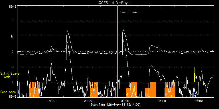 EIS Observation timeline overlay to GOES-Xray curve Code 1" 2" 40" 266" EIS Observations list for this event: STUDY ACRONYM ID DATE OBSERVED DESCRIPTION NOAA# TARGET 0 PRY_slot_context_v3 | 39435 | 2014/03/28 15:21:43 | IHOP251 (AR12014) | 2014 | Active Region TIMELINE ID DATE OBSERVED FITS FILE XCEN (+W/-E) YCEN (+N/-S) DUR ----------------------------------------------------------------------------------------------------------------- 39435 | 2014/03/28 15:21:43.000 | eis_l0_20140328_152143.fits.gz | 565.81 | -159.39 | 2m56s 1 HH_Flare_162x152 | 39421 | 2014/03/28 16:12:04 | IHOP251 (AR12014, flare region) with I | | Flare TIMELINE ID DATE OBSERVED FITS FILE XCEN (+W/-E) YCEN (+N/-S) DUR ----------------------------------------------------------------------------------------------------------------- 39421 | 2014/03/28 16:12:04.000 | eis_l0_20140328_161204.fits.gz | 587.00 | -161.01 | 4m10s 39421 | 2014/03/28 16:16:17.000 | eis_l0_20140328_161617.fits.gz | 587.46 | -161.16 | 4m10s 39421 | 2014/03/28 16:20:30.000 | eis_l0_20140328_162030.fits.gz | 587.85 | -161.01 | 4m11s 39421 | 2014/03/28 16:24:44.000 | eis_l0_20140328_162444.fits.gz | 588.46 | -161.08 | 4m11s 39421 | 2014/03/28 16:28:57.000 | eis_l0_20140328_162857.fits.gz | 588.85 | -161.24 | 4m11s 39421 | 2014/03/28 16:33:11.000 | eis_l0_20140328_163311.fits.gz | 589.39 | -161.16 | 4m10s 39421 | 2014/03/28 16:37:24.000 | eis_l0_20140328_163724.fits.gz | 589.93 | -161.24 | 4m11s 39421 | 2014/03/28 16:41:38.000 | eis_l0_20140328_164138.fits.gz | 590.40 | -161.32 | 4m10s 39421 | 2014/03/28 16:45:51.000 | eis_l0_20140328_164551.fits.gz | 590.86 | -161.55 | 4m10s 39421 | 2014/03/28 16:50:04.000 | eis_l0_20140328_165004.fits.gz | 591.32 | -161.32 | 4m11s 39421 | 2014/03/28 16:54:18.000 | eis_l0_20140328_165418.fits.gz | 591.94 | -161.62 | 4m10s 39421 | 2014/03/28 16:58:31.000 | eis_l0_20140328_165831.fits.gz | 592.33 | -161.47 | 4m11s 2 PRY_slot_context_v3 | 39436 | 2014/03/28 17:02:53 | IHOP251 (AR12014) | 2014 | Active Region TIMELINE ID DATE OBSERVED FITS FILE XCEN (+W/-E) YCEN (+N/-S) DUR ----------------------------------------------------------------------------------------------------------------- 39436 | 2014/03/28 17:02:53.000 | eis_l0_20140328_170253.fits.gz | 578.30 | -161.62 | 2m56s 3 HH_Flare+AR_180x152 | 39431 | 2014/03/28 21:08:19 | AR 12014 obs | | Flare TIMELINE ID DATE OBSERVED FITS FILE XCEN (+W/-E) YCEN (+N/-S) DUR ----------------------------------------------------------------------------------------------------------------- 39431 | 2014/03/28 21:08:19.000 | eis_l0_20140328_210819.fits.gz | 619.02 | -164.25 | 5m18s 39431 | 2014/03/28 21:13:40.000 | eis_l0_20140328_211340.fits.gz | 619.57 | -164.33 | 5m18s 39431 | 2014/03/28 21:19:01.000 | eis_l0_20140328_211901.fits.gz | 620.26 | -164.56 | 5m18s 39431 | 2014/03/28 21:24:22.000 | eis_l0_20140328_212422.fits.gz | 620.80 | -164.56 | 5m18s 39431 | 2014/03/28 21:29:43.000 | eis_l0_20140328_212943.fits.gz | 621.42 | -164.56 | 5m17s 39431 | 2014/03/28 21:35:03.000 | eis_l0_20140328_213503.fits.gz | 621.96 | -164.48 | 5m18s 39431 | 2014/03/28 21:40:24.000 | eis_l0_20140328_214024.fits.gz | 622.65 | -164.79 | 5m18s 4 PRY_footpoints_lite | 39423 | 2014/03/29 00:03:40 | IHOP246 (AR12014, hot plasma) | 2014 | Active Region TIMELINE ID DATE OBSERVED FITS FILE XCEN (+W/-E) YCEN (+N/-S) DUR ----------------------------------------------------------------------------------------------------------------- 39423 | 2014/03/29 00:03:40.000 | eis_l0_20140329_000340.fits.gz | 639.41 | -165.95 | 26m22s 39423 | 2014/03/29 00:30:06.000 | eis_l0_20140329_003006.fits.gz | 642.26 | -166.34 | 26m22s 5 PRY_footpoints_lite | 39424 | 2014/03/29 01:36:43 | IHOP246 (AR12014, hot plasma) | 2014 | Active Region TIMELINE ID DATE OBSERVED FITS FILE XCEN (+W/-E) YCEN (+N/-S) DUR ----------------------------------------------------------------------------------------------------------------- 39424 | 2014/03/29 01:36:43.000 | eis_l0_20140329_013643.fits.gz | 649.45 | -167.11 | 26m22s 39424 | 2014/03/29 02:03:08.000 | eis_l0_20140329_020308.fits.gz | 652.23 | -167.49 | 26m23s 6 HH_Flare_162x152 | 39430 | 2014/03/29 03:13:43 | IHOP246 (AR12014, hot plasma) | 2014 | Flare TIMELINE ID DATE OBSERVED FITS FILE XCEN (+W/-E) YCEN (+N/-S) DUR ----------------------------------------------------------------------------------------------------------------- 39430 | 2014/03/29 03:13:43.000 | eis_l0_20140329_031343.fits.gz | 659.15 | -168.27 | 4m11s 39430 | 2014/03/29 03:17:57.000 | eis_l0_20140329_031757.fits.gz | 659.61 | -168.50 | 4m10s 39430 | 2014/03/29 03:22:10.000 | eis_l0_20140329_032210.fits.gz | 660.15 | -168.42 | 4m11s 39430 | 2014/03/29 03:26:23.000 | eis_l0_20140329_032623.fits.gz | 660.46 | -168.50 | 4m11s 39430 | 2014/03/29 03:30:37.000 | eis_l0_20140329_033037.fits.gz | 660.92 | -168.50 | 4m11s 39430 | 2014/03/29 03:34:51.000 | eis_l0_20140329_033451.fits.gz | 661.46 | -168.58 | 4m10s 39430 | 2014/03/29 03:39:04.000 | eis_l0_20140329_033904.fits.gz | 661.93 | -168.65 | 4m10s 39430 | 2014/03/29 03:43:17.000 | eis_l0_20140329_034317.fits.gz | 662.31 | -168.73 | 4m11s 39430 | 2014/03/29 03:47:31.000 | eis_l0_20140329_034731.fits.gz | 662.78 | -168.73 | 4m10s 39430 | 2014/03/29 03:51:44.000 | eis_l0_20140329_035144.fits.gz | 663.24 | -168.89 | 4m11s 39430 | 2014/03/29 03:55:57.000 | eis_l0_20140329_035557.fits.gz | 663.62 | -168.81 | 4m11s 39430 | 2014/03/29 04:00:11.000 | eis_l0_20140329_040011.fits.gz | 664.01 | -168.96 | 4m11s 7 PRY_slot_contextLITE | 39413 | 2014/03/29 05:33:20 | EIS-AIA alignment | | Active Region TIMELINE ID DATE OBSERVED FITS FILE XCEN (+W/-E) YCEN (+N/-S) DUR ----------------------------------------------------------------------------------------------------------------- 39413 | 2014/03/29 05:33:20.000 | eis_l0_20140329_053320.fits.gz | -15.29 | -0.50 | 2m56s 8 Alignment_266 | 39414 | 2014/03/29 05:36:35 | EIS-AIA alignment | | Quiet Sun TIMELINE ID DATE OBSERVED FITS FILE XCEN (+W/-E)
