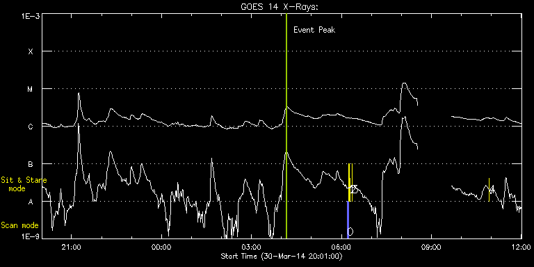 EIS Observation timeline overlay to GOES-Xray curve Code 1" 2" 40" 266" EIS Observations list for this event: STUDY ACRONYM ID DATE OBSERVED DESCRIPTION NOAA# TARGET 0 PRY_slot_contextLITE | 39449 | 2014/03/31 06:11:33 | EIS-AIA alignment | 2020 | Active Region TIMELINE ID DATE OBSERVED FITS FILE XCEN (+W/-E) YCEN (+N/-S) DUR ----------------------------------------------------------------------------------------------------------------- 39449 | 2014/03/31 06:11:33.000 | eis_l0_20140331_061133.fits.gz | -15.29 | -0.42 | 2m56s 1 Alignment_266 | 39450 | 2014/03/31 06:14:47 | EIS-AIA alignment | | Quiet Sun TIMELINE ID DATE OBSERVED FITS FILE XCEN (+W/-E) YCEN (+N/-S) DUR ----------------------------------------------------------------------------------------------------------------- 39450 | 2014/03/31 06:14:47.000 | eis_l0_20140331_061447.fits.gz | -132.49 | -0.65 | 1m22s 2 XRT_synop_AIA | 39451 | 2014/03/31 06:16:55 | EIS-AIA alignment | | Quiet Sun TIMELINE ID DATE OBSERVED FITS FILE XCEN (+W/-E) YCEN (+N/-S) DUR ----------------------------------------------------------------------------------------------------------------- 39451 | 2014/03/31 06:16:55.000 | eis_l0_20140331_061655.fits.gz | -132.49 | -0.42 | 10s 3 Flare266_Hunter03 | 39468 | 2014/03/31 06:21:12 | Flare hunter study | 2017 | Flare TIMELINE ID DATE OBSERVED FITS FILE XCEN (+W/-E) YCEN (+N/-S) DUR ----------------------------------------------------------------------------------------------------------------- 39468 | 2014/03/31 06:21:12.000 | eis_l0_20140331_062112.fits.gz | 598.28 | 220.74 | 5s 4 Flare266_Hunter03 | 39469 | 2014/03/31 10:55:19 | Flare hunter study | 2017 | Flare TIMELINE ID DATE OBSERVED FITS FILE XCEN (+W/-E) YCEN (+N/-S) DUR ----------------------------------------------------------------------------------------------------------------- 39469 | 2014/03/31 10:55:19.000 | eis_l0_20140331_105519.fits.gz | 624.15 | 216.64 | 5s : Check study information : Download file : View thumbnails For this event, also check for: