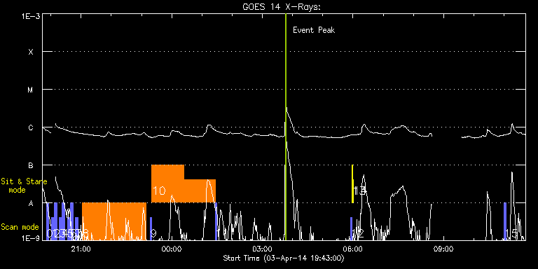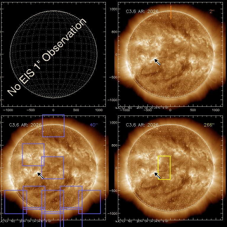 EIS Observation timeline overlay to GOES-Xray curve Code 1" 2" 40" 266" EIS Observations list for this event: STUDY ACRONYM ID DATE OBSERVED DESCRIPTION NOAA# TARGET 0 full_sun_slot_scan_2 | 39518 | 2014/04/03 19:50:43 | HOP 130 - multi-temperature full disk | | Quiet Sun TIMELINE ID DATE OBSERVED FITS FILE XCEN (+W/-E) YCEN (+N/-S) DUR ----------------------------------------------------------------------------------------------------------------- 39518 | 2014/04/03 19:50:43.000 | eis_l0_20140403_195043.fits.gz | 798.98 | -757.02 | 5m26s 1 full_sun_slot_scan_2 | 39519 | 2014/04/03 20:00:43 | HOP 130 - multi-temperature full disk | | Quiet Sun TIMELINE ID DATE OBSERVED FITS FILE XCEN (+W/-E) YCEN (+N/-S) DUR ----------------------------------------------------------------------------------------------------------------- 39519 | 2014/04/03 20:00:43.000 | eis_l0_20140403_200043.fits.gz | 395.82 | -661.60 | 5m27s 2 full_sun_slot_scan_2 | 39520 | 2014/04/03 20:06:15 | HOP 130 - multi-temperature full disk | | Quiet Sun TIMELINE ID DATE OBSERVED FITS FILE XCEN (+W/-E) YCEN (+N/-S) DUR ----------------------------------------------------------------------------------------------------------------- 39520 | 2014/04/03 20:06:15.000 | eis_l0_20140403_200615.fits.gz | 395.98 | -1133.52 | 5m27s 3 full_sun_slot_scan_2 | 39521 | 2014/04/03 20:16:43 | HOP 130 - multi-temperature full disk | | Quiet Sun TIMELINE ID DATE OBSERVED FITS FILE XCEN (+W/-E) YCEN (+N/-S) DUR ----------------------------------------------------------------------------------------------------------------- 39521 | 2014/04/03 20:16:43.000 | eis_l0_20140403_201643.fits.gz | -15.29 | -755.68 | 5m27s 4 full_sun_slot_scan_2 | 39522 | 2014/04/03 20:22:15 | HOP 130 - multi-temperature full disk | | Quiet Sun TIMELINE ID DATE OBSERVED FITS FILE XCEN (+W/-E) YCEN (+N/-S) DUR ----------------------------------------------------------------------------------------------------------------- 39522 | 2014/04/03 20:22:15.000 | eis_l0_20140403_202215.fits.gz | -15.37 | -1227.38 | 5m27s 5 full_sun_slot_scan_2 | 39523 | 2014/04/03 20:32:43 | HOP 130 - multi-temperature full disk | | Quiet Sun TIMELINE ID DATE OBSERVED FITS FILE XCEN (+W/-E) YCEN (+N/-S) DUR ----------------------------------------------------------------------------------------------------------------- 39523 | 2014/04/03 20:32:43.000 | eis_l0_20140403_203243.fits.gz | -426.40 | -661.21 | 5m27s 6 full_sun_slot_scan_2 | 39524 | 2014/04/03 20:38:15 | HOP 130 - multi-temperature full disk | | Quiet Sun TIMELINE ID DATE OBSERVED FITS FILE XCEN (+W/-E) YCEN (+N/-S) DUR ----------------------------------------------------------------------------------------------------------------- 39524 | 2014/04/03 20:38:15.000 | eis_l0_20140403_203815.fits.gz | -426.40 | -1133.44 | 5m28s 7 full_sun_slot_scan_2 | 39525 | 2014/04/03 20:48:43 | HOP 130 - multi-temperature full disk | | Quiet Sun TIMELINE ID DATE OBSERVED FITS FILE XCEN (+W/-E) YCEN (+N/-S) DUR ----------------------------------------------------------------------------------------------------------------- 39525 | 2014/04/03 20:48:43.000 | eis_l0_20140403_204843.fits.gz | -830.25 | -757.25 | 5m27s 8 DHB_006_v2 | 39494 | 2014/04/03 21:02:33 | HOP 253 - active region loop expansion | | Active Region TIMELINE ID DATE OBSERVED FITS FILE XCEN (+W/-E) YCEN (+N/-S) DUR ----------------------------------------------------------------------------------------------------------------- 39494 | 2014/04/03 21:02:33.000 | eis_l0_20140403_210233.fits.gz | -9916.88 | -9980.20 | 2h6m55s 9 PRY_slot_context_v3 | 39536 | 2014/04/03 23:17:20 | HOP 249 - spicule evolution | | Active Region TIMELINE ID DATE OBSERVED FITS FILE XCEN (+W/-E) YCEN (+N/-S) DUR ----------------------------------------------------------------------------------------------------------------- 39536 | 2014/04/03 23:17:20.000 | eis_l0_20140403_231720.fits.gz | 0.08 | 924.39 | 2m56s 10 vhh_slowar_sas_1h6m | 39537 | 2014/04/03 23:20:41 | HOP 249 - spicule evolution | | Active Region TIMELINE ID DATE OBSERVED FITS FILE XCEN (+W/-E) YCEN (+N/-S) DUR ----------------------------------------------------------------------------------------------------------------- 39537 | 2014/04/03 23:20:41.000 | eis_l0_20140403_232041.fits.gz | 14.59 | 924.54 | 1h2m48s 39537 | 2014/04/04 00:23:32.000 | eis_l0_20140404_002332.fits.gz | 14.59 | 924.31 | 1h2m49s 11 PRY_slot_context_v3 | 39538 | 2014/04/04 01:26:32 | HOP 249 - spicule evolution | | Active Region TIMELINE ID DATE OBSERVED FITS FILE XCEN (+W/-E) YCEN (+N/-S) DUR ----------------------------------------------------------------------------------------------------------------- 39538 | 2014/04/04 01:26:32.000 | eis_l0_20140404_012632.fits.gz | -0.07 | 924.39 | 2m57s 12 PRY_slot_contextLITE | 39495 | 2014/04/04 05:55:13 | EIS-AIA alignment | | Active Region TIMELINE ID DATE OBSERVED FITS FILE XCEN (+W/-E) YCEN (+N/-S) DUR ----------------------------------------------------------------------------------------------------------------- 39495 | 2014/04/04 05:55:13.000 | eis_l0_20140404_055513.fits.gz | -15.14 | -0.50 | 2m57s 13 Alignment_266 | 39496 | 2014/04/04 05:58:28 | EIS-AIA alignment | | Quiet Sun TIMELINE ID DATE OBSERVED FITS FILE XCEN (+W/-E) YCEN (+N/-S) DUR ----------------------------------------------------------------------------------------------------------------- 39496 | 2014/04/04 05:58:28.000 | eis_l0_20140404_055828.fits.gz | -132.49 | -0.50 | 1m22s 14 XRT_synop_AIA | 39497 | 2014/04/04 06:01:02 | EIS-AIA alignment | | Quiet Sun TIMELINE ID DATE OBSERVED FITS FILE XCEN (+W/-E) YCEN (+N/-S) DUR ----------------------------------------------------------------------------------------------------------------- 39497 | 2014/04/04 06:01:02.000 | eis_l0_20140404_060102.fits.gz | -132.57 | -0.58 | 10s 15 PRY_slot_context_v3 | 39531 | 2014/04/04 11:00:27 | HOP 245 - microflares (with IRIS) | 2027 | Active Region TIMELINE ID DATE OBSERVED FITS FILE 