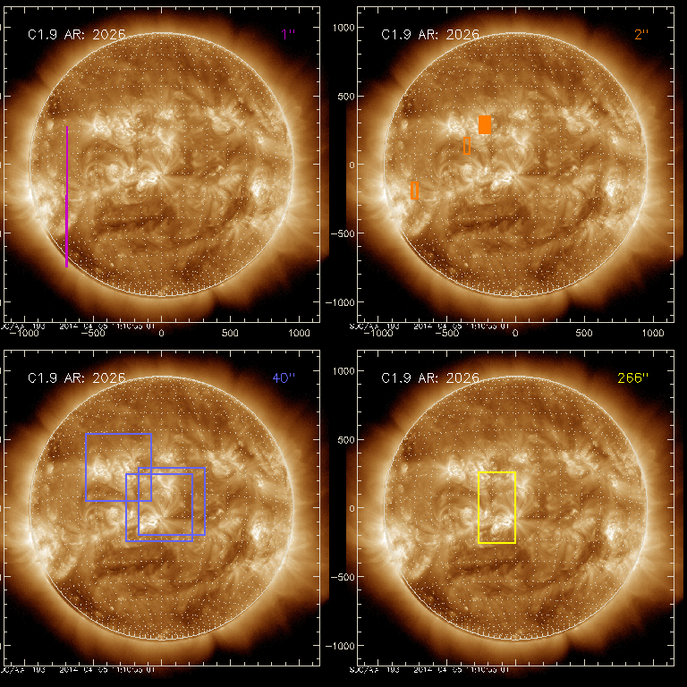 EIS Observation timeline overlay to GOES-Xray curve Code 1" 2" 40" 266" EIS Observations list for this event: STUDY ACRONYM ID DATE OBSERVED DESCRIPTION NOAA# TARGET 0 PRY_slot_context_v3 | 39543 | 2014/04/05 02:41:05 | HOP 245 - microflares (with IRIS) | 2027 | Active Region TIMELINE ID DATE OBSERVED FITS FILE XCEN (+W/-E) YCEN (+N/-S) DUR ----------------------------------------------------------------------------------------------------------------- 39543 | 2014/04/05 02:41:05.000 | eis_l0_20140405_024105.fits.gz | -311.69 | 291.34 | 2m56s 1 PRY_slot_contextLITE | 39499 | 2014/04/05 06:02:39 | EIS-AIA alignment | 2026 | Active Region TIMELINE ID DATE OBSERVED FITS FILE XCEN (+W/-E) YCEN (+N/-S) DUR ----------------------------------------------------------------------------------------------------------------- 39499 | 2014/04/05 06:02:39.000 | eis_l0_20140405_060239.fits.gz | -15.14 | -0.50 | 2m56s 2 Alignment_266 | 39500 | 2014/04/05 06:05:54 | EIS-AIA alignment | 2026 | Quiet Sun TIMELINE ID DATE OBSERVED FITS FILE XCEN (+W/-E) YCEN (+N/-S) DUR ----------------------------------------------------------------------------------------------------------------- 39500 | 2014/04/05 06:05:54.000 | eis_l0_20140405_060554.fits.gz | -132.49 | -0.50 | 1m22s 3 XRT_synop_AIA | 39501 | 2014/04/05 06:08:01 | EIS-AIA alignment | 2026 | Quiet Sun TIMELINE ID DATE OBSERVED FITS FILE XCEN (+W/-E) YCEN (+N/-S) DUR ----------------------------------------------------------------------------------------------------------------- 39501 | 2014/04/05 06:08:01.000 | eis_l0_20140405_060801.fits.gz | -132.49 | -0.42 | 10s 4 Cam_flare_diag | 39573 | 2014/04/05 11:00:20 | Joint IRIS/Hinode observations of smal | | Flare TIMELINE ID DATE OBSERVED FITS FILE XCEN (+W/-E) YCEN (+N/-S) DUR ----------------------------------------------------------------------------------------------------------------- 39573 | 2014/04/05 11:00:20.000 | eis_l0_20140405_110020.fits.gz | -237.74 | 285.43 | 2m12s 39573 | 2014/04/05 11:02:35.000 | eis_l0_20140405_110235.fits.gz | -237.43 | 285.50 | 2m11s 39573 | 2014/04/05 11:04:49.000 | eis_l0_20140405_110449.fits.gz | -237.12 | 285.27 | 2m12s 39573 | 2014/04/05 11:07:03.000 | eis_l0_20140405_110703.fits.gz | -236.73 | 285.35 | 2m12s 39573 | 2014/04/05 11:09:17.000 | eis_l0_20140405_110917.fits.gz | -236.43 | 285.35 | 2m12s 39573 | 2014/04/05 11:11:32.000 | eis_l0_20140405_111132.fits.gz | -236.12 | 285.35 | 2m12s 39573 | 2014/04/05 11:13:46.000 | eis_l0_20140405_111346.fits.gz | -235.81 | 285.35 | 2m12s 39573 | 2014/04/05 11:16:01.000 | eis_l0_20140405_111601.fits.gz | -235.50 | 285.35 | 2m11s 39573 | 2014/04/05 11:18:15.000 | eis_l0_20140405_111815.fits.gz | -235.11 | 285.20 | 2m12s 39573 | 2014/04/05 11:20:29.000 | eis_l0_20140405_112029.fits.gz | -234.88 | 285.35 | 2m12s 39573 | 2014/04/05 11:22:44.000 | eis_l0_20140405_112244.fits.gz | -234.49 | 285.43 | 2m12s 39573 | 2014/04/05 11:24:58.000 | eis_l0_20140405_112458.fits.gz | -234.18 | 285.12 | 2m12s 39573 | 2014/04/05 11:27:13.000 | eis_l0_20140405_112713.fits.gz | -233.80 | 285.20 | 2m12s 39573 | 2014/04/05 11:29:27.000 | eis_l0_20140405_112927.fits.gz | -233.49 | 285.43 | 2m12s 39573 | 2014/04/05 11:31:42.000 | eis_l0_20140405_113142.fits.gz | -233.10 | 285.58 | 2m12s 39573 | 2014/04/05 11:33:57.000 | eis_l0_20140405_113357.fits.gz | -232.87 | 285.50 | 2m12s 39573 | 2014/04/05 11:36:11.000 | eis_l0_20140405_113611.fits.gz | -232.41 | 285.43 | 2m13s 39573 | 2014/04/05 11:38:26.000 | eis_l0_20140405_113826.fits.gz | -232.18 | 285.43 | 2m12s 39573 | 2014/04/05 11:40:41.000 | eis_l0_20140405_114041.fits.gz | -231.87 | 285.50 | 2m12s 39573 | 2014/04/05 11:42:55.000 | eis_l0_20140405_114255.fits.gz | -231.48 | 285.43 | 2m12s 39573 | 2014/04/05 11:45:10.000 | eis_l0_20140405_114510.fits.gz | -231.17 | 285.50 | 2m11s 39573 | 2014/04/05 11:47:24.000 | eis_l0_20140405_114724.fits.gz | -230.79 | 285.43 | 2m12s 39573 | 2014/04/05 11:49:39.000 | eis_l0_20140405_114939.fits.gz | -230.48 | 285.66 | 2m12s 39573 | 2014/04/05 11:51:53.000 | eis_l0_20140405_115153.fits.gz | -230.17 | 285.43 | 2m12s 39573 | 2014/04/05 11:54:08.000 | eis_l0_20140405_115408.fits.gz | -229.78 | 285.43 | 2m12s 39573 | 2014/04/05 11:56:23.000 | eis_l0_20140405_115623.fits.gz | -229.47 | 285.43 | 2m12s 39573 | 2014/04/05 11:58:37.000 | eis_l0_20140405_115837.fits.gz | -229.16 | 285.43 | 2m12s 39573 | 2014/04/05 12:00:52.000 | eis_l0_20140405_120052.fits.gz | -228.85 | 285.35 | 2m12s 39573 | 2014/04/05 12:03:07.000 | eis_l0_20140405_120307.fits.gz | -228.47 | 285.50 | 2m12s 39573 | 2014/04/05 12:05:21.000 | eis_l0_20140405_120521.fits.gz | -228.24 | 285.58 | 2m12s 39573 | 2014/04/05 12:07:36.000 | eis_l0_20140405_120736.fits.gz | -227.85 | 285.66 | 2m12s 39573 | 2014/04/05 12:09:50.000 | eis_l0_20140405_120950.fits.gz | -227.46 | 285.50 | 2m12s 39573 | 2014/04/05 12:12:05.000 | eis_l0_20140405_121205.fits.gz | -227.15 | 285.66 | 2m12s 39573 | 2014/04/05 12:14:19.000 | eis_l0_20140405_121419.fits.gz | -226.85 | 285.58 | 2m12s 39573 | 2014/04/05 12:16:34.000 | eis_l0_20140405_121634.fits.gz | -226.46 | 285.66 | 2m11s 39573 | 2014/04/05 12:18:48.000 | eis_l0_20140405_121848.fits.gz | -226.23 | 285.66 | 2m12s 39573 | 2014/04/05 12:21:03.000 | eis_l0_20140405_122103.fits.gz | -225.76 | 285.66 | 2m12s 39573 | 2014/04/05 12:23:17.000 | eis_l0_20140405_122317.fits.gz | -225.53 | 285.74 | 2m12s 39573 | 2014/04/05 12:25:32.000 | eis_l0_20140405_122532.fits.gz | -225.15 | 285.58 | 2m12s 39573 | 2014/04/05 12:27:46.000 | eis_l0_20140405_122746.fits.gz | -224.91 | 285.66 | 2m12s 39573 | 2014/04/05 12:30:01.000 | eis_l0_20140405_123001.fits.gz | -224.61 | 285.66 | 2m11s 39573 | 2014/04/05 12:32:15.000 | eis_l0_20140405_123215.fits.gz | -224.30 | 285.74 | 2m12s 39573 | 2014/04/05 12:34:29.000 | eis_l0_20140405_123429.fits.gz | -223.91 | 285.81 | 2m13s 39573 | 2014/04/05 12:36:44.000 | eis_l0_20140405_123644.fits.gz | -223.52 | 285.66 | 2m12s 39573 | 2014/04/05 12:38:59.000 | eis_l0_20140405