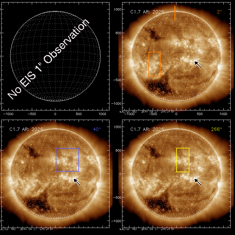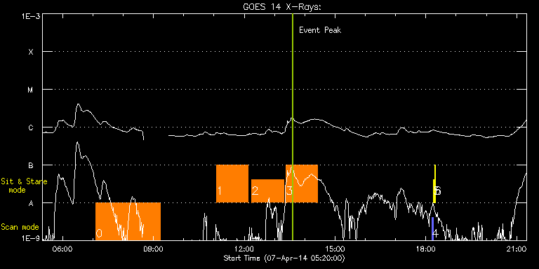 EIS Observation timeline overlay to GOES-Xray curve Code 1" 2" 40" 266" EIS Observations list for this event: STUDY ACRONYM ID DATE OBSERVED DESCRIPTION NOAA# TARGET 0 DHB_006_v2 | 39564 | 2014/04/07 07:06:13 | Active Region Expansion | | Active Region TIMELINE ID DATE OBSERVED FITS FILE XCEN (+W/-E) YCEN (+N/-S) DUR ----------------------------------------------------------------------------------------------------------------- 39564 | 2014/04/07 07:06:13.000 | eis_l0_20140407_070613.fits.gz | -461.83 | -170.49 | 2h6m54s 1 vhh_slowar_sas_1h6m | 39565 | 2014/04/07 11:05:13 | Spicule evolution | | Active Region TIMELINE ID DATE OBSERVED FITS FILE XCEN (+W/-E) YCEN (+N/-S) DUR ----------------------------------------------------------------------------------------------------------------- 39565 | 2014/04/07 11:05:13.000 | eis_l0_20140407_110513.fits.gz | -28.59 | 911.67 | 1h2m48s 2 vhh_slowar_sas_1h6m | 39571 | 2014/04/07 12:15:12 | Spicule evolution | | Active Region TIMELINE ID DATE OBSERVED FITS FILE XCEN (+W/-E) YCEN (+N/-S) DUR ----------------------------------------------------------------------------------------------------------------- 39571 | 2014/04/07 12:15:12.000 | eis_l0_20140407_121512.fits.gz | -28.59 | 911.67 | 1h2m49s 3 vhh_slowar_sas_1h6m | 39572 | 2014/04/07 13:23:13 | Spicule evolution | | Active Region TIMELINE ID DATE OBSERVED FITS FILE XCEN (+W/-E) YCEN (+N/-S) DUR ----------------------------------------------------------------------------------------------------------------- 39572 | 2014/04/07 13:23:13.000 | eis_l0_20140407_132313.fits.gz | -28.59 | 911.60 | 1h2m48s 4 PRY_slot_contextLITE | 39557 | 2014/04/07 18:12:19 | Change of EIS pointing and alignment w | 2027 | Active Region TIMELINE ID DATE OBSERVED FITS FILE XCEN (+W/-E) YCEN (+N/-S) DUR ----------------------------------------------------------------------------------------------------------------- 39557 | 2014/04/07 18:12:19.000 | eis_l0_20140407_181219.fits.gz | 256.85 | 289.57 | 2m56s 5 Alignment_266 | 39558 | 2014/04/07 18:15:33 | Change of EIS pointing and alignment w | 2027 | Quiet Sun TIMELINE ID DATE OBSERVED FITS FILE XCEN (+W/-E) YCEN (+N/-S) DUR ----------------------------------------------------------------------------------------------------------------- 39558 | 2014/04/07 18:15:33.000 | eis_l0_20140407_181533.fits.gz | 139.96 | 289.33 | 1m22s 6 XRT_synop_AIA | 39559 | 2014/04/07 18:18:17 | Change of EIS pointing and alignment w | 2027 | Quiet Sun TIMELINE ID DATE OBSERVED FITS FILE XCEN (+W/-E) YCEN (+N/-S) DUR ----------------------------------------------------------------------------------------------------------------- 39559 | 2014/04/07 18:18:17.000 | eis_l0_20140407_181817.fits.gz | 140.35 | 289.33 | 10s : Check study information : Download file : View thumbnails For this event, also check for: