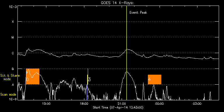 EIS Observation timeline overlay to GOES-Xray curve Code 1" 2" 40" 266" EIS Observations list for this event: STUDY ACRONYM ID DATE OBSERVED DESCRIPTION NOAA# TARGET 0 vhh_slowar_sas_1h6m | 39572 | 2014/04/07 13:23:13 | Spicule evolution | | Active Region TIMELINE ID DATE OBSERVED FITS FILE XCEN (+W/-E) YCEN (+N/-S) DUR ----------------------------------------------------------------------------------------------------------------- 39572 | 2014/04/07 13:23:13.000 | eis_l0_20140407_132313.fits.gz | -28.59 | 911.60 | 1h2m48s 1 PRY_slot_contextLITE | 39557 | 2014/04/07 18:12:19 | Change of EIS pointing and alignment w | 2027 | Active Region TIMELINE ID DATE OBSERVED FITS FILE XCEN (+W/-E) YCEN (+N/-S) DUR ----------------------------------------------------------------------------------------------------------------- 39557 | 2014/04/07 18:12:19.000 | eis_l0_20140407_181219.fits.gz | 256.85 | 289.57 | 2m56s 2 Alignment_266 | 39558 | 2014/04/07 18:15:33 | Change of EIS pointing and alignment w | 2027 | Quiet Sun TIMELINE ID DATE OBSERVED FITS FILE XCEN (+W/-E) YCEN (+N/-S) DUR ----------------------------------------------------------------------------------------------------------------- 39558 | 2014/04/07 18:15:33.000 | eis_l0_20140407_181533.fits.gz | 139.96 | 289.33 | 1m22s 3 XRT_synop_AIA | 39559 | 2014/04/07 18:18:17 | Change of EIS pointing and alignment w | 2027 | Quiet Sun TIMELINE ID DATE OBSERVED FITS FILE XCEN (+W/-E) YCEN (+N/-S) DUR ----------------------------------------------------------------------------------------------------------------- 39559 | 2014/04/07 18:18:17.000 | eis_l0_20140407_181817.fits.gz | 140.35 | 289.33 | 10s 4 vhh_slowar_sas_1h6m | 39563 | 2014/04/07 23:05:19 | Spicule evolution | | Active Region TIMELINE ID DATE OBSERVED FITS FILE XCEN (+W/-E) YCEN (+N/-S) DUR ----------------------------------------------------------------------------------------------------------------- 39563 | 2014/04/07 23:05:19.000 | eis_l0_20140407_230519.fits.gz | -28.67 | 911.60 | 1h2m48s : Check study information : Download file : View thumbnails For this event, also check for: