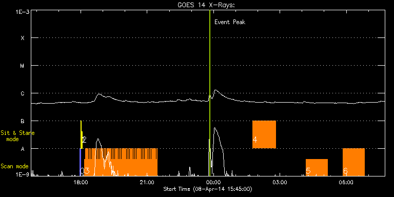 EIS Observation timeline overlay to GOES-Xray curve Code 1" 2" 40" 266" EIS Observations list for this event: STUDY ACRONYM ID DATE OBSERVED DESCRIPTION NOAA# TARGET 0 PRY_slot_contextLITE | 39574 | 2014/04/08 17:57:21 | Change of EIS pointing and alignment w | | Active Region TIMELINE ID DATE OBSERVED FITS FILE XCEN (+W/-E) YCEN (+N/-S) DUR ----------------------------------------------------------------------------------------------------------------- 39574 | 2014/04/08 17:57:21.000 | eis_l0_20140408_175721.fits.gz | -15.37 | -0.42 | 2m56s 1 Alignment_266 | 39575 | 2014/04/08 18:00:35 | Change of EIS pointing and aligment wi | | Quiet Sun TIMELINE ID DATE OBSERVED FITS FILE XCEN (+W/-E) YCEN (+N/-S) DUR ----------------------------------------------------------------------------------------------------------------- 39575 | 2014/04/08 18:00:35.000 | eis_l0_20140408_180035.fits.gz | -132.49 | -0.65 | 1m22s 2 XRT_synop_AIA | 39576 | 2014/04/08 18:03:17 | Change of EIS pointing and aligment wi | | Quiet Sun TIMELINE ID DATE OBSERVED FITS FILE XCEN (+W/-E) YCEN (+N/-S) DUR ----------------------------------------------------------------------------------------------------------------- 39576 | 2014/04/08 18:03:17.000 | eis_l0_20140408_180317.fits.gz | -132.57 | -0.42 | 10s 3 Cam_flare_diag | 39592 | 2014/04/08 18:10:20 | Joint IRIS/Hinode observations of smal | | Flare TIMELINE ID DATE OBSERVED FITS FILE XCEN (+W/-E) YCEN (+N/-S) DUR ----------------------------------------------------------------------------------------------------------------- 39592 | 2014/04/08 18:10:20.000 | eis_l0_20140408_181020.fits.gz | 457.18 | 270.14 | 2m11s 39592 | 2014/04/08 18:12:34.000 | eis_l0_20140408_181234.fits.gz | 457.49 | 269.90 | 2m12s 39592 | 2014/04/08 18:14:49.000 | eis_l0_20140408_181449.fits.gz | 457.80 | 269.98 | 2m11s 39592 | 2014/04/08 18:17:03.000 | eis_l0_20140408_181703.fits.gz | 457.95 | 269.83 | 2m12s 39592 | 2014/04/08 18:19:18.000 | eis_l0_20140408_181918.fits.gz | 458.34 | 269.98 | 2m11s 39592 | 2014/04/08 18:21:32.000 | eis_l0_20140408_182132.fits.gz | 458.57 | 269.90 | 2m12s 39592 | 2014/04/08 18:23:47.000 | eis_l0_20140408_182347.fits.gz | 458.96 | 269.83 | 2m11s 39592 | 2014/04/08 18:26:01.000 | eis_l0_20140408_182601.fits.gz | 459.19 | 269.83 | 2m12s 39592 | 2014/04/08 18:28:16.000 | eis_l0_20140408_182816.fits.gz | 459.58 | 269.98 | 2m12s 39592 | 2014/04/08 18:30:31.000 | eis_l0_20140408_183031.fits.gz | 459.89 | 269.75 | 2m11s 39592 | 2014/04/08 18:32:45.000 | eis_l0_20140408_183245.fits.gz | 460.04 | 269.98 | 2m12s 39592 | 2014/04/08 18:35:00.000 | eis_l0_20140408_183500.fits.gz | 460.43 | 269.75 | 2m12s 39592 | 2014/04/08 18:37:15.000 | eis_l0_20140408_183715.fits.gz | 460.66 | 269.98 | 2m11s 39592 | 2014/04/08 18:39:29.000 | eis_l0_20140408_183929.fits.gz | 460.97 | 269.83 | 2m12s 39592 | 2014/04/08 18:41:44.000 | eis_l0_20140408_184144.fits.gz | 461.28 | 269.67 | 2m11s 39592 | 2014/04/08 18:43:58.000 | eis_l0_20140408_184358.fits.gz | 461.58 | 269.83 | 2m11s 39592 | 2014/04/08 18:46:12.000 | eis_l0_20140408_184612.fits.gz | 461.89 | 269.60 | 2m12s 39592 | 2014/04/08 18:48:26.000 | eis_l0_20140408_184826.fits.gz | 462.12 | 269.67 | 2m12s 39592 | 2014/04/08 18:50:41.000 | eis_l0_20140408_185041.fits.gz | 462.43 | 269.60 | 2m12s 39592 | 2014/04/08 18:52:56.000 | eis_l0_20140408_185256.fits.gz | 462.67 | 269.67 | 2m12s 39592 | 2014/04/08 18:55:10.000 | eis_l0_20140408_185510.fits.gz | 463.05 | 269.67 | 2m12s 39592 | 2014/04/08 18:57:25.000 | eis_l0_20140408_185725.fits.gz | 463.28 | 269.60 | 2m12s 39592 | 2014/04/08 18:59:40.000 | eis_l0_20140408_185940.fits.gz | 463.44 | 269.60 | 2m11s 39592 | 2014/04/08 19:01:54.000 | eis_l0_20140408_190154.fits.gz | 463.83 | 269.60 | 2m12s 39592 | 2014/04/08 19:04:08.000 | eis_l0_20140408_190408.fits.gz | 464.06 | 269.52 | 2m12s 39592 | 2014/04/08 19:06:23.000 | eis_l0_20140408_190623.fits.gz | 464.44 | 269.60 | 2m12s 39592 | 2014/04/08 19:08:38.000 | eis_l0_20140408_190838.fits.gz | 464.67 | 269.60 | 2m11s 39592 | 2014/04/08 19:10:52.000 | eis_l0_20140408_191052.fits.gz | 465.06 | 269.52 | 2m12s 39592 | 2014/04/08 19:13:07.000 | eis_l0_20140408_191307.fits.gz | 465.37 | 269.52 | 2m11s 39592 | 2014/04/08 19:15:21.000 | eis_l0_20140408_191521.fits.gz | 465.60 | 269.44 | 2m12s 39592 | 2014/04/08 19:17:36.000 | eis_l0_20140408_191736.fits.gz | 465.83 | 269.36 | 2m11s 39592 | 2014/04/08 19:19:50.000 | eis_l0_20140408_191950.fits.gz | 466.14 | 269.44 | 2m12s 39592 | 2014/04/08 19:22:04.000 | eis_l0_20140408_192204.fits.gz | 466.45 | 269.36 | 2m12s 39592 | 2014/04/08 19:24:19.000 | eis_l0_20140408_192419.fits.gz | 466.84 | 269.52 | 2m11s 39592 | 2014/04/08 19:26:33.000 | eis_l0_20140408_192633.fits.gz | 467.15 | 269.29 | 2m11s 39592 | 2014/04/08 19:28:47.000 | eis_l0_20140408_192847.fits.gz | 467.45 | 269.29 | 2m12s 39592 | 2014/04/08 19:31:02.000 | eis_l0_20140408_193102.fits.gz | 467.69 | 269.13 | 2m12s 39592 | 2014/04/08 19:33:16.000 | eis_l0_20140408_193316.fits.gz | 467.92 | 269.29 | 2m11s 39592 | 2014/04/08 19:35:30.000 | eis_l0_20140408_193530.fits.gz | 468.15 | 269.44 | 2m12s 39592 | 2014/04/08 19:37:45.000 | eis_l0_20140408_193745.fits.gz | 468.46 | 269.21 | 2m11s 39592 | 2014/04/08 19:39:59.000 | eis_l0_20140408_193959.fits.gz | 468.85 | 269.05 | 2m12s 39592 | 2014/04/08 19:42:14.000 | eis_l0_20140408_194214.fits.gz | 469.15 | 269.13 | 2m12s 39592 | 2014/04/08 19:44:28.000 | eis_l0_20140408_194428.fits.gz | 469.46 | 269.29 | 2m12s 39592 | 2014/04/08 19:46:43.000 | eis_l0_20140408_194643.fits.gz | 469.70 | 269.13 | 2m12s 39592 | 2014/04/08 19:48:57.000 | eis_l0_20140408_194857.fits.gz | 470.00 | 269.21 | 2m12s 39592 | 2014/04/08 19:51:12.000 | eis_l0_20140408_195112.fits.gz | 470.24 | 268.90 | 2m12s 39592 | 2014/04/08 19:53:27.000 | eis_l0_20140408_195327.fits.gz | 470.55 | 269.13 | 2m11s 39592 | 2014/04/08 19:55:41.000 | eis_l0_20140408_195541.fits.gz | 470.85 | 269.05 | 2m12s 39592 | 2014/04/08 19:57:56.000 | eis_l0_20140408_195756.fits.gz