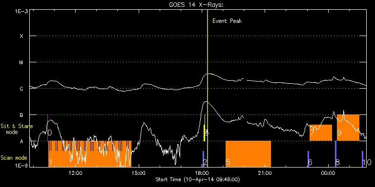 EIS Observation timeline overlay to GOES-Xray curve Code 1" 2" 40" 266" EIS Observations list for this event: STUDY ACRONYM ID DATE OBSERVED DESCRIPTION NOAA# TARGET 0 regcal076 | 39598 | 2014/04/10 10:40:12 | Flatfield, 1 exposure, led 100ms, ccd | | Engineering TIMELINE ID DATE OBSERVED FITS FILE XCEN (+W/-E) YCEN (+N/-S) DUR ----------------------------------------------------------------------------------------------------------------- 39598 | 2014/04/10 10:40:12.000 | eis_l0_20140410_104012.fits.gz | 848.17 | -199.66 | 2s 1 Cam_flare_diag | 39599 | 2014/04/10 10:42:41 | Joint IRIS/Hinode observations of smal | 2026 | Flare TIMELINE ID DATE OBSERVED FITS FILE XCEN (+W/-E) YCEN (+N/-S) DUR ----------------------------------------------------------------------------------------------------------------- 39599 | 2014/04/10 10:42:41.000 | eis_l0_20140410_104241.fits.gz | 827.85 | -157.51 | 2m12s 39599 | 2014/04/10 10:44:56.000 | eis_l0_20140410_104456.fits.gz | 828.00 | -157.66 | 2m12s 39599 | 2014/04/10 10:47:11.000 | eis_l0_20140410_104711.fits.gz | 828.08 | -157.82 | 2m12s 39599 | 2014/04/10 10:49:25.000 | eis_l0_20140410_104925.fits.gz | 828.23 | -157.82 | 2m12s 39599 | 2014/04/10 10:51:40.000 | eis_l0_20140410_105140.fits.gz | 828.39 | -157.74 | 2m11s 39599 | 2014/04/10 10:53:54.000 | eis_l0_20140410_105354.fits.gz | 828.54 | -157.97 | 2m12s 39599 | 2014/04/10 10:56:09.000 | eis_l0_20140410_105609.fits.gz | 828.77 | -157.90 | 2m11s 39599 | 2014/04/10 10:58:23.000 | eis_l0_20140410_105823.fits.gz | 828.85 | -158.05 | 2m12s 39599 | 2014/04/10 11:00:38.000 | eis_l0_20140410_110038.fits.gz | 829.01 | -157.90 | 2m12s 39599 | 2014/04/10 11:02:53.000 | eis_l0_20140410_110253.fits.gz | 829.24 | -157.90 | 2m11s 39599 | 2014/04/10 11:05:07.000 | eis_l0_20140410_110507.fits.gz | 829.31 | -158.05 | 2m12s 39599 | 2014/04/10 11:07:22.000 | eis_l0_20140410_110722.fits.gz | 829.47 | -158.05 | 2m11s 39599 | 2014/04/10 11:09:36.000 | eis_l0_20140410_110936.fits.gz | 829.55 | -158.05 | 2m12s 39599 | 2014/04/10 11:11:51.000 | eis_l0_20140410_111151.fits.gz | 829.70 | -157.97 | 2m11s 39599 | 2014/04/10 11:14:05.000 | eis_l0_20140410_111405.fits.gz | 830.01 | -158.05 | 2m12s 39599 | 2014/04/10 11:16:20.000 | eis_l0_20140410_111620.fits.gz | 830.09 | -158.05 | 2m11s 39599 | 2014/04/10 11:18:34.000 | eis_l0_20140410_111834.fits.gz | 830.16 | -158.13 | 2m12s 39599 | 2014/04/10 11:20:49.000 | eis_l0_20140410_112049.fits.gz | 830.40 | -158.13 | 2m11s 39599 | 2014/04/10 11:23:03.000 | eis_l0_20140410_112303.fits.gz | 830.47 | -158.44 | 2m12s 39599 | 2014/04/10 11:25:17.000 | eis_l0_20140410_112517.fits.gz | 830.70 | -158.36 | 2m12s 39599 | 2014/04/10 11:27:32.000 | eis_l0_20140410_112732.fits.gz | 830.86 | -158.28 | 2m12s 39599 | 2014/04/10 11:29:46.000 | eis_l0_20140410_112946.fits.gz | 830.94 | -158.36 | 2m12s 39599 | 2014/04/10 11:32:01.000 | eis_l0_20140410_113201.fits.gz | 831.09 | -158.36 | 2m12s 39599 | 2014/04/10 11:34:16.000 | eis_l0_20140410_113416.fits.gz | 831.32 | -158.44 | 2m11s 39599 | 2014/04/10 11:36:30.000 | eis_l0_20140410_113630.fits.gz | 831.48 | -158.36 | 2m12s 39599 | 2014/04/10 11:38:45.000 | eis_l0_20140410_113845.fits.gz | 831.63 | -158.51 | 2m12s 39599 | 2014/04/10 11:41:00.000 | eis_l0_20140410_114100.fits.gz | 831.71 | -158.51 | 2m11s 39599 | 2014/04/10 11:43:14.000 | eis_l0_20140410_114314.fits.gz | 831.86 | -158.51 | 2m12s 39599 | 2014/04/10 11:45:28.000 | eis_l0_20140410_114528.fits.gz | 832.02 | -158.59 | 2m12s 39599 | 2014/04/10 11:47:43.000 | eis_l0_20140410_114743.fits.gz | 832.17 | -158.67 | 2m12s 39599 | 2014/04/10 11:49:57.000 | eis_l0_20140410_114957.fits.gz | 832.33 | -158.67 | 2m12s 39599 | 2014/04/10 11:52:12.000 | eis_l0_20140410_115212.fits.gz | 832.48 | -158.67 | 2m12s 39599 | 2014/04/10 11:54:27.000 | eis_l0_20140410_115427.fits.gz | 832.64 | -158.59 | 2m11s 39599 | 2014/04/10 11:56:41.000 | eis_l0_20140410_115641.fits.gz | 832.87 | -158.75 | 2m11s 39599 | 2014/04/10 11:58:55.000 | eis_l0_20140410_115855.fits.gz | 833.02 | -158.75 | 2m12s 39599 | 2014/04/10 12:01:09.000 | eis_l0_20140410_120109.fits.gz | 833.10 | -158.75 | 2m12s 39599 | 2014/04/10 12:03:24.000 | eis_l0_20140410_120324.fits.gz | 833.25 | -158.90 | 2m11s 39599 | 2014/04/10 12:05:38.000 | eis_l0_20140410_120538.fits.gz | 833.41 | -158.90 | 2m11s 39599 | 2014/04/10 12:07:52.000 | eis_l0_20140410_120752.fits.gz | 833.56 | -158.75 | 2m12s 39599 | 2014/04/10 12:10:07.000 | eis_l0_20140410_121007.fits.gz | 833.72 | -158.98 | 2m12s 39599 | 2014/04/10 12:12:21.000 | eis_l0_20140410_121221.fits.gz | 833.79 | -158.90 | 2m13s 39599 | 2014/04/10 12:14:36.000 | eis_l0_20140410_121436.fits.gz | 833.95 | -158.98 | 2m12s 39599 | 2014/04/10 12:16:51.000 | eis_l0_20140410_121651.fits.gz | 834.26 | -158.98 | 2m11s 39599 | 2014/04/10 12:19:05.000 | eis_l0_20140410_121905.fits.gz | 834.34 | -158.90 | 2m11s 39599 | 2014/04/10 12:21:19.000 | eis_l0_20140410_122119.fits.gz | 834.41 | -159.06 | 2m12s 39599 | 2014/04/10 12:23:34.000 | eis_l0_20140410_122334.fits.gz | 834.57 | -159.13 | 2m11s 39599 | 2014/04/10 12:25:48.000 | eis_l0_20140410_122548.fits.gz | 834.80 | -159.06 | 2m12s 39599 | 2014/04/10 12:28:03.000 | eis_l0_20140410_122803.fits.gz | 834.95 | -159.21 | 2m12s 39599 | 2014/04/10 12:30:17.000 | eis_l0_20140410_123017.fits.gz | 835.11 | -159.29 | 2m12s 39599 | 2014/04/10 12:32:32.000 | eis_l0_20140410_123232.fits.gz | 835.18 | -159.29 | 2m11s 39599 | 2014/04/10 12:34:46.000 | eis_l0_20140410_123446.fits.gz | 835.34 | -159.29 | 2m12s 39599 | 2014/04/10 12:37:01.000 | eis_l0_20140410_123701.fits.gz | 835.49 | -159.37 | 2m11s 39599 | 2014/04/10 12:39:15.000 | eis_l0_20140410_123915.fits.gz | 835.65 | -159.29 | 2m12s 39599 | 2014/04/10 12:41:30.000 | eis_l0_20140410_124130.fits.gz | 835.80 | -159.44 | 2m12s 39599 | 2014/04/10 12:43:45.000 | eis_l0_20140410_124345.fits.gz | 835.96 | -159.52 | 2m11s 39599 | 2014/04/10 12:45:59.000 | eis_l0_20140410_124559.fits.gz | 836.11 | -159.44 | 2m12s 39599 | 2014/04/10 12:48:14.000 