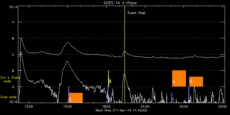 EIS Observation timeline overlay to GOES-Xray curve Code 1" 2" 40" 266" EIS Observations list for this event: STUDY ACRONYM ID DATE OBSERVED DESCRIPTION NOAA# TARGET 0 PRY_slot_context_v3 | 39623 | 2014/04/11 15:03:34 | EIS spectral atlas synoptic program | 2026 | Active Region TIMELINE ID DATE OBSERVED FITS FILE XCEN (+W/-E) YCEN (+N/-S) DUR ----------------------------------------------------------------------------------------------------------------- 39623 | 2014/04/11 15:03:34.000 | eis_l0_20140411_150334.fits.gz | 889.97 | -195.63 | 2m57s 1 Atlas_60 | 39624 | 2014/04/11 15:07:33 | EIS spectral atlas synoptic programme | 2026 | Quiet Sun TIMELINE ID DATE OBSERVED FITS FILE XCEN (+W/-E) YCEN (+N/-S) DUR ----------------------------------------------------------------------------------------------------------------- 39624 | 2014/04/11 15:07:33.000 | eis_l0_20140411_150733.fits.gz | 904.56 | -195.55 | 1h1m39s 2 PRY_slot_contextLITE | 39604 | 2014/04/11 18:05:20 | Change of IIS pointing and alignment w | | Active Region TIMELINE ID DATE OBSERVED FITS FILE XCEN (+W/-E) YCEN (+N/-S) DUR ----------------------------------------------------------------------------------------------------------------- 39604 | 2014/04/11 18:05:20.000 | eis_l0_20140411_180520.fits.gz | -15.21 | -0.42 | 2m56s 3 Alignment_266 | 39605 | 2014/04/11 18:08:34 | Change of EIS pointing and aligment wi | | Quiet Sun TIMELINE ID DATE OBSERVED FITS FILE XCEN (+W/-E) YCEN (+N/-S) DUR ----------------------------------------------------------------------------------------------------------------- 39605 | 2014/04/11 18:08:34.000 | eis_l0_20140411_180834.fits.gz | -132.49 | -0.50 | 1m22s 4 XRT_synop_AIA | 39606 | 2014/04/11 18:11:44 | Change of EIS pointing and alignment w | | Quiet Sun TIMELINE ID DATE OBSERVED FITS FILE XCEN (+W/-E) YCEN (+N/-S) DUR ----------------------------------------------------------------------------------------------------------------- 39606 | 2014/04/11 18:11:44.000 | eis_l0_20140411_181144.fits.gz | -132.49 | -0.35 | 10s 5 PRY_slot_context_v2 | 39617 | 2014/04/11 23:02:26 | Spicule evolution | | Active Region TIMELINE ID DATE OBSERVED FITS FILE XCEN (+W/-E) YCEN (+N/-S) DUR ----------------------------------------------------------------------------------------------------------------- 39617 | 2014/04/11 23:02:26.000 | eis_l0_20140411_230226.fits.gz | -39.17 | 899.67 | 2m33s 6 vhh_slowar_sas_1h6m | 39618 | 2014/04/11 23:06:33 | Spicule evolution | | Active Region TIMELINE ID DATE OBSERVED FITS FILE XCEN (+W/-E) YCEN (+N/-S) DUR ----------------------------------------------------------------------------------------------------------------- 39618 | 2014/04/11 23:06:33.000 | eis_l0_20140411_230633.fits.gz | -28.75 | 899.51 | 1h2m49s 7 PRY_slot_context_v2 | 39619 | 2014/04/12 00:21:49 | Spicule evolution | | Active Region TIMELINE ID DATE OBSERVED FITS FILE XCEN (+W/-E) YCEN (+N/-S) DUR ----------------------------------------------------------------------------------------------------------------- 39619 | 2014/04/12 00:21:49.000 | eis_l0_20140412_002149.fits.gz | -39.09 | 899.59 | 2m33s 8 vhh_slowar_sas_1h6m | 39620 | 2014/04/12 00:26:03 | Spicule evolution | | Active Region TIMELINE ID DATE OBSERVED FITS FILE XCEN (+W/-E) YCEN (+N/-S) DUR ----------------------------------------------------------------------------------------------------------------- 39620 | 2014/04/12 00:26:03.000 | eis_l0_20140412_002603.fits.gz | -28.59 | 899.51 | 1h2m49s : Check study information : Download file : View thumbnails For this event, also check for:
