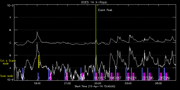 EIS Observation timeline overlay to GOES-Xray curve Code 1" 2" 40" 266" EIS Observations list for this event: STUDY ACRONYM ID DATE OBSERVED DESCRIPTION NOAA# TARGET 0 PRY_slot_context_v3 | 39668 | 2014/04/15 16:33:20 | AR 12036 obs. | 2036 | Active Region TIMELINE ID DATE OBSERVED FITS FILE XCEN (+W/-E) YCEN (+N/-S) DUR ----------------------------------------------------------------------------------------------------------------- 39668 | 2014/04/15 16:33:20.000 | eis_l0_20140415_163320.fits.gz | -86.05 | -198.18 | 2m56s 1 PRY_slot_contextLITE | 39660 | 2014/04/15 18:03:15 | EIS pointing alignment | 2036 | Active Region TIMELINE ID DATE OBSERVED FITS FILE XCEN (+W/-E) YCEN (+N/-S) DUR ----------------------------------------------------------------------------------------------------------------- 39660 | 2014/04/15 18:03:15.000 | eis_l0_20140415_180315.fits.gz | -15.21 | -0.42 | 2m56s 2 Alignment_266 | 39661 | 2014/04/15 18:07:07 | EIS pointing alignment | 2034 | Quiet Sun TIMELINE ID DATE OBSERVED FITS FILE XCEN (+W/-E) YCEN (+N/-S) DUR ----------------------------------------------------------------------------------------------------------------- 39661 | 2014/04/15 18:07:07.000 | eis_l0_20140415_180707.fits.gz | -132.49 | -0.50 | 1m22s 3 XRT_synop_AIA | 39662 | 2014/04/15 18:10:11 | EIS pointing alignment | 2034 | Quiet Sun TIMELINE ID DATE OBSERVED FITS FILE XCEN (+W/-E) YCEN (+N/-S) DUR ----------------------------------------------------------------------------------------------------------------- 39662 | 2014/04/15 18:10:11.000 | eis_l0_20140415_181011.fits.gz | -132.41 | -0.58 | 10s 4 PRY_slot_contextLITE | 39696 | 2014/04/15 19:05:49 | HOP 79: solar irradiance scan (N-S) | | Active Region TIMELINE ID DATE OBSERVED FITS FILE XCEN (+W/-E) YCEN (+N/-S) DUR ----------------------------------------------------------------------------------------------------------------- 39696 | 2014/04/15 19:05:49.000 | eis_l0_20140415_190549.fits.gz | -9869.46 | -9943.20 | 2m56s 5 SK_DEEP_5x512_SLIT1 | 39697 | 2014/04/15 19:14:00 | HOP 79: solar irradiance scan (N-S) | | Quiet Sun TIMELINE ID DATE OBSERVED FITS FILE XCEN (+W/-E) YCEN (+N/-S) DUR ----------------------------------------------------------------------------------------------------------------- 39697 | 2014/04/15 19:14:00.000 | eis_l0_20140415_191400.fits.gz | -9854.49 | -9943.20 | 10m8s 6 PRY_slot_contextLITE | 39698 | 2014/04/15 20:43:47 | HOP 79: solar irradiance scan (N-S) | | Active Region TIMELINE ID DATE OBSERVED FITS FILE XCEN (+W/-E) YCEN (+N/-S) DUR ----------------------------------------------------------------------------------------------------------------- 39698 | 2014/04/15 20:43:47.000 | eis_l0_20140415_204347.fits.gz | -15.30 | -845.60 | 2m56s 7 SK_DEEP_5x512_SLIT1 | 39699 | 2014/04/15 20:51:50 | HOP 79: solar irradiance scan (N-S) | | Quiet Sun TIMELINE ID DATE OBSERVED FITS FILE XCEN (+W/-E) YCEN (+N/-S) DUR ----------------------------------------------------------------------------------------------------------------- 39699 | 2014/04/15 20:51:50.000 | eis_l0_20140415_205150.fits.gz | -0.23 | -845.60 | 10m8s 8 PRY_slot_contextLITE | 39700 | 2014/04/15 22:18:20 | HOP 79: solar irradiance scan (N-S) | | Active Region TIMELINE ID DATE OBSERVED FITS FILE XCEN (+W/-E) YCEN (+N/-S) DUR ----------------------------------------------------------------------------------------------------------------- 39700 | 2014/04/15 22:18:20.000 | eis_l0_20140415_221820.fits.gz | -15.38 | -745.41 | 2m56s 9 SK_DEEP_5x512_SLIT1 | 39701 | 2014/04/15 22:26:23 | HOP 79: solar irradiance scan (N-S) | | Quiet Sun TIMELINE ID DATE OBSERVED FITS FILE XCEN (+W/-E) YCEN (+N/-S) DUR ----------------------------------------------------------------------------------------------------------------- 39701 | 2014/04/15 22:26:23.000 | eis_l0_20140415_222623.fits.gz | -0.15 | -745.41 | 10m8s 10 PRY_slot_contextLITE | 39702 | 2014/04/15 23:36:17 | HOP 79: solar irradiance scan (N-S) | | Active Region TIMELINE ID DATE OBSERVED FITS FILE XCEN (+W/-E) YCEN (+N/-S) DUR ----------------------------------------------------------------------------------------------------------------- 39702 | 2014/04/15 23:36:17.000 | eis_l0_20140415_233617.fits.gz | -15.45 | -645.37 | 2m56s 11 SK_DEEP_5x512_SLIT1 | 39703 | 2014/04/15 23:44:20 | HOP 79: solar irradiance scan (N-S) | | Quiet Sun TIMELINE ID DATE OBSERVED FITS FILE XCEN (+W/-E) YCEN (+N/-S) DUR ----------------------------------------------------------------------------------------------------------------- 39703 | 2014/04/15 23:44:20.000 | eis_l0_20140415_234420.fits.gz | -0.15 | -645.29 | 10m8s 12 PRY_slot_contextLITE | 39704 | 2014/04/16 00:09:27 | HOP 79: solar irradiance scan (N-S) | | Active Region TIMELINE ID DATE OBSERVED FITS FILE XCEN (+W/-E) YCEN (+N/-S) DUR ----------------------------------------------------------------------------------------------------------------- 39704 | 2014/04/16 00:09:27.000 | eis_l0_20140416_000927.fits.gz | -15.38 | -545.41 | 2m56s 13 SK_DEEP_5x512_SLIT1 | 39705 | 2014/04/16 00:17:30 | HOP 79: solar irradiance scan (N-S) | | Quiet Sun TIMELINE ID DATE OBSERVED FITS FILE XCEN (+W/-E) YCEN (+N/-S) DUR ----------------------------------------------------------------------------------------------------------------- 39705 | 2014/04/16 00:17:30.000 | eis_l0_20140416_001730.fits.gz | -0.15 | -545.26 | 10m7s 14 PRY_slot_contextLITE | 39706 | 2014/04/16 01:07:31 | HOP 79: solar irradiance scan (N-S) | 2036 | Active Region TIMELINE ID DATE OBSERVED FITS FILE XCEN (+W/-E) YCEN (+N/-S) DUR ----------------------------------------------------------------------------------------------------------------- 39706 | 2014/04/16 01:07:31.000 | eis_l0_20140416_010731.fits.gz | -15.38 | -445.53 | 2m56s 15 SK_DEEP_5x512_SLIT1 | 39707 | 2014/04/16 01:15:34 | HOP 79: solar irradiance scan (N-S) | | Quiet Sun TIMELINE ID DATE OBSERVED FITS FILE XCEN (+W/-E) YCEN (+N/-S) DUR -------------------------------