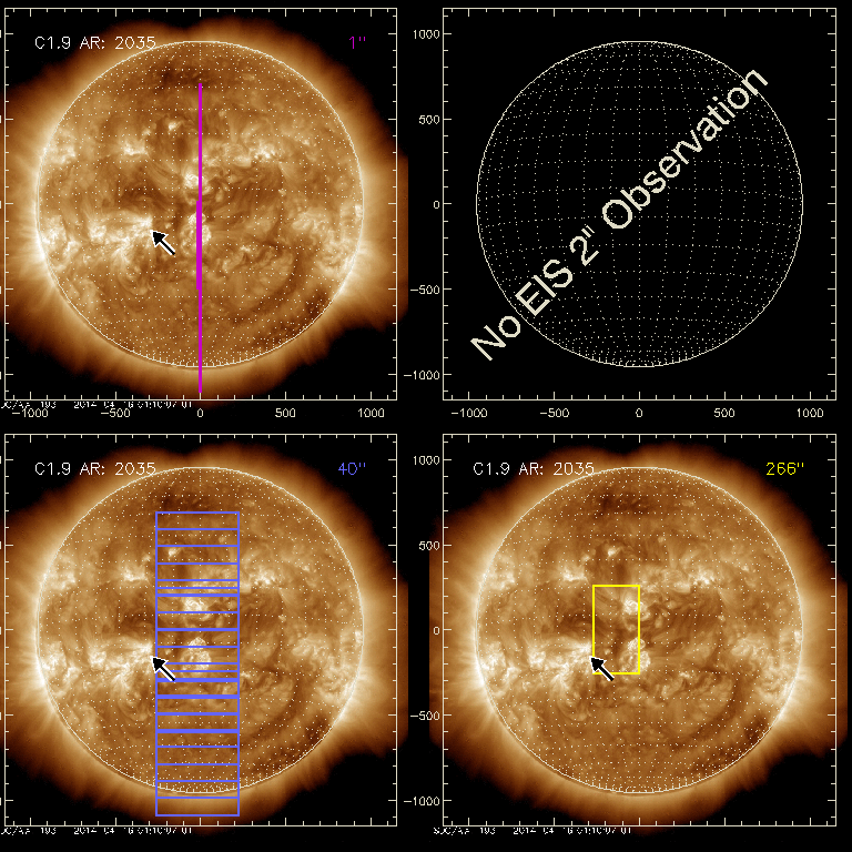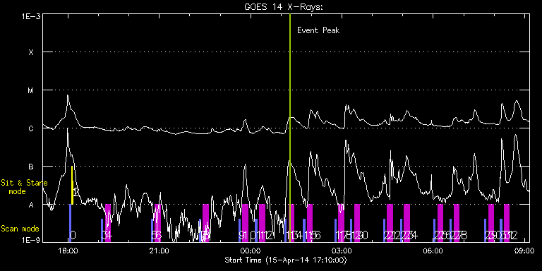 EIS Observation timeline overlay to GOES-Xray curve Code 1" 2" 40" 266" EIS Observations list for this event: STUDY ACRONYM ID DATE OBSERVED DESCRIPTION NOAA# TARGET 0 PRY_slot_contextLITE | 39660 | 2014/04/15 18:03:15 | EIS pointing alignment | 2036 | Active Region TIMELINE ID DATE OBSERVED FITS FILE XCEN (+W/-E) YCEN (+N/-S) DUR ----------------------------------------------------------------------------------------------------------------- 39660 | 2014/04/15 18:03:15.000 | eis_l0_20140415_180315.fits.gz | -15.21 | -0.42 | 2m56s 1 Alignment_266 | 39661 | 2014/04/15 18:07:07 | EIS pointing alignment | 2034 | Quiet Sun TIMELINE ID DATE OBSERVED FITS FILE XCEN (+W/-E) YCEN (+N/-S) DUR ----------------------------------------------------------------------------------------------------------------- 39661 | 2014/04/15 18:07:07.000 | eis_l0_20140415_180707.fits.gz | -132.49 | -0.50 | 1m22s 2 XRT_synop_AIA | 39662 | 2014/04/15 18:10:11 | EIS pointing alignment | 2034 | Quiet Sun TIMELINE ID DATE OBSERVED FITS FILE XCEN (+W/-E) YCEN (+N/-S) DUR ----------------------------------------------------------------------------------------------------------------- 39662 | 2014/04/15 18:10:11.000 | eis_l0_20140415_181011.fits.gz | -132.41 | -0.58 | 10s 3 PRY_slot_contextLITE | 39696 | 2014/04/15 19:05:49 | HOP 79: solar irradiance scan (N-S) | | Active Region TIMELINE ID DATE OBSERVED FITS FILE XCEN (+W/-E) YCEN (+N/-S) DUR ----------------------------------------------------------------------------------------------------------------- 39696 | 2014/04/15 19:05:49.000 | eis_l0_20140415_190549.fits.gz | -9869.46 | -9943.20 | 2m56s 4 SK_DEEP_5x512_SLIT1 | 39697 | 2014/04/15 19:14:00 | HOP 79: solar irradiance scan (N-S) | | Quiet Sun TIMELINE ID DATE OBSERVED FITS FILE XCEN (+W/-E) YCEN (+N/-S) DUR ----------------------------------------------------------------------------------------------------------------- 39697 | 2014/04/15 19:14:00.000 | eis_l0_20140415_191400.fits.gz | -9854.49 | -9943.20 | 10m8s 5 PRY_slot_contextLITE | 39698 | 2014/04/15 20:43:47 | HOP 79: solar irradiance scan (N-S) | | Active Region TIMELINE ID DATE OBSERVED FITS FILE XCEN (+W/-E) YCEN (+N/-S) DUR ----------------------------------------------------------------------------------------------------------------- 39698 | 2014/04/15 20:43:47.000 | eis_l0_20140415_204347.fits.gz | -15.30 | -845.60 | 2m56s 6 SK_DEEP_5x512_SLIT1 | 39699 | 2014/04/15 20:51:50 | HOP 79: solar irradiance scan (N-S) | | Quiet Sun TIMELINE ID DATE OBSERVED FITS FILE XCEN (+W/-E) YCEN (+N/-S) DUR ----------------------------------------------------------------------------------------------------------------- 39699 | 2014/04/15 20:51:50.000 | eis_l0_20140415_205150.fits.gz | -0.23 | -845.60 | 10m8s 7 PRY_slot_contextLITE | 39700 | 2014/04/15 22:18:20 | HOP 79: solar irradiance scan (N-S) | | Active Region TIMELINE ID DATE OBSERVED FITS FILE XCEN (+W/-E) YCEN (+N/-S) DUR ----------------------------------------------------------------------------------------------------------------- 39700 | 2014/04/15 22:18:20.000 | eis_l0_20140415_221820.fits.gz | -15.38 | -745.41 | 2m56s 8 SK_DEEP_5x512_SLIT1 | 39701 | 2014/04/15 22:26:23 | HOP 79: solar irradiance scan (N-S) | | Quiet Sun TIMELINE ID DATE OBSERVED FITS FILE XCEN (+W/-E) YCEN (+N/-S) DUR ----------------------------------------------------------------------------------------------------------------- 39701 | 2014/04/15 22:26:23.000 | eis_l0_20140415_222623.fits.gz | -0.15 | -745.41 | 10m8s 9 PRY_slot_contextLITE | 39702 | 2014/04/15 23:36:17 | HOP 79: solar irradiance scan (N-S) | | Active Region TIMELINE ID DATE OBSERVED FITS FILE XCEN (+W/-E) YCEN (+N/-S) DUR ----------------------------------------------------------------------------------------------------------------- 39702 | 2014/04/15 23:36:17.000 | eis_l0_20140415_233617.fits.gz | -15.45 | -645.37 | 2m56s 10 SK_DEEP_5x512_SLIT1 | 39703 | 2014/04/15 23:44:20 | HOP 79: solar irradiance scan (N-S) | | Quiet Sun TIMELINE ID DATE OBSERVED FITS FILE XCEN (+W/-E) YCEN (+N/-S) DUR ----------------------------------------------------------------------------------------------------------------- 39703 | 2014/04/15 23:44:20.000 | eis_l0_20140415_234420.fits.gz | -0.15 | -645.29 | 10m8s 11 PRY_slot_contextLITE | 39704 | 2014/04/16 00:09:27 | HOP 79: solar irradiance scan (N-S) | | Active Region TIMELINE ID DATE OBSERVED FITS FILE XCEN (+W/-E) YCEN (+N/-S) DUR ----------------------------------------------------------------------------------------------------------------- 39704 | 2014/04/16 00:09:27.000 | eis_l0_20140416_000927.fits.gz | -15.38 | -545.41 | 2m56s 12 SK_DEEP_5x512_SLIT1 | 39705 | 2014/04/16 00:17:30 | HOP 79: solar irradiance scan (N-S) | | Quiet Sun TIMELINE ID DATE OBSERVED FITS FILE XCEN (+W/-E) YCEN (+N/-S) DUR ----------------------------------------------------------------------------------------------------------------- 39705 | 2014/04/16 00:17:30.000 | eis_l0_20140416_001730.fits.gz | -0.15 | -545.26 | 10m7s 13 PRY_slot_contextLITE | 39706 | 2014/04/16 01:07:31 | HOP 79: solar irradiance scan (N-S) | 2036 | Active Region TIMELINE ID DATE OBSERVED FITS FILE XCEN (+W/-E) YCEN (+N/-S) DUR ----------------------------------------------------------------------------------------------------------------- 39706 | 2014/04/16 01:07:31.000 | eis_l0_20140416_010731.fits.gz | -15.38 | -445.53 | 2m56s 14 SK_DEEP_5x512_SLIT1 | 39707 | 2014/04/16 01:15:34 | HOP 79: solar irradiance scan (N-S) | | Quiet Sun TIMELINE ID DATE OBSERVED FITS FILE XCEN (+W/-E) YCEN (+N/-S) DUR ----------------------------------------------------------------------------------------------------------------- 39707 | 2014/04/16 01:15:34.000 | eis_l0_20140416_011534.fits.gz | -0.15 | -445.61 | 10m7s 15 PRY_slot_contextLITE | 39708 | 2014/04/16 01:44:00 | HOP 79: solar irradiance scan (N-S) | 2036 | Active Region TIMELINE ID DATE OBSERVED FITS FILE XCEN (+W/-E) YCEN (+N/-S) DUR ---------