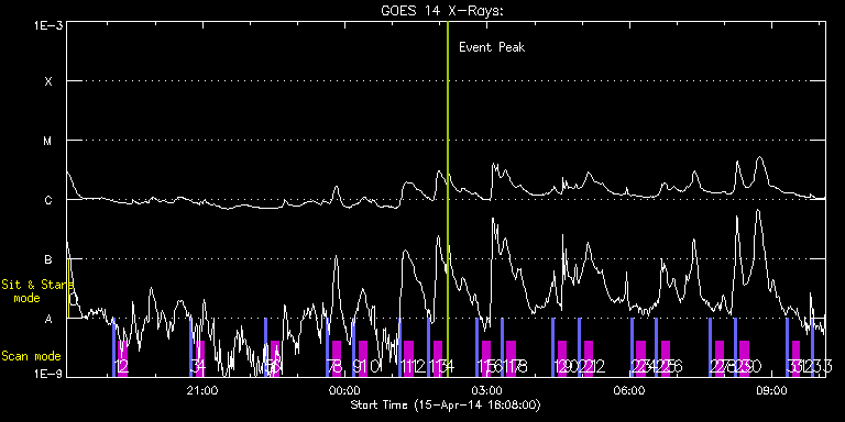EIS Observation timeline overlay to GOES-Xray curve Code 1" 2" 40" 266" EIS Observations list for this event: STUDY ACRONYM ID DATE OBSERVED DESCRIPTION NOAA# TARGET 0 XRT_synop_AIA | 39662 | 2014/04/15 18:10:11 | EIS pointing alignment | 2034 | Quiet Sun TIMELINE ID DATE OBSERVED FITS FILE XCEN (+W/-E) YCEN (+N/-S) DUR ----------------------------------------------------------------------------------------------------------------- 39662 | 2014/04/15 18:10:11.000 | eis_l0_20140415_181011.fits.gz | -132.41 | -0.58 | 10s 1 PRY_slot_contextLITE | 39696 | 2014/04/15 19:05:49 | HOP 79: solar irradiance scan (N-S) | | Active Region TIMELINE ID DATE OBSERVED FITS FILE XCEN (+W/-E) YCEN (+N/-S) DUR ----------------------------------------------------------------------------------------------------------------- 39696 | 2014/04/15 19:05:49.000 | eis_l0_20140415_190549.fits.gz | -9869.46 | -9943.20 | 2m56s 2 SK_DEEP_5x512_SLIT1 | 39697 | 2014/04/15 19:14:00 | HOP 79: solar irradiance scan (N-S) | | Quiet Sun TIMELINE ID DATE OBSERVED FITS FILE XCEN (+W/-E) YCEN (+N/-S) DUR ----------------------------------------------------------------------------------------------------------------- 39697 | 2014/04/15 19:14:00.000 | eis_l0_20140415_191400.fits.gz | -9854.49 | -9943.20 | 10m8s 3 PRY_slot_contextLITE | 39698 | 2014/04/15 20:43:47 | HOP 79: solar irradiance scan (N-S) | | Active Region TIMELINE ID DATE OBSERVED FITS FILE XCEN (+W/-E) YCEN (+N/-S) DUR ----------------------------------------------------------------------------------------------------------------- 39698 | 2014/04/15 20:43:47.000 | eis_l0_20140415_204347.fits.gz | -15.30 | -845.60 | 2m56s 4 SK_DEEP_5x512_SLIT1 | 39699 | 2014/04/15 20:51:50 | HOP 79: solar irradiance scan (N-S) | | Quiet Sun TIMELINE ID DATE OBSERVED FITS FILE XCEN (+W/-E) YCEN (+N/-S) DUR ----------------------------------------------------------------------------------------------------------------- 39699 | 2014/04/15 20:51:50.000 | eis_l0_20140415_205150.fits.gz | -0.23 | -845.60 | 10m8s 5 PRY_slot_contextLITE | 39700 | 2014/04/15 22:18:20 | HOP 79: solar irradiance scan (N-S) | | Active Region TIMELINE ID DATE OBSERVED FITS FILE XCEN (+W/-E) YCEN (+N/-S) DUR ----------------------------------------------------------------------------------------------------------------- 39700 | 2014/04/15 22:18:20.000 | eis_l0_20140415_221820.fits.gz | -15.38 | -745.41 | 2m56s 6 SK_DEEP_5x512_SLIT1 | 39701 | 2014/04/15 22:26:23 | HOP 79: solar irradiance scan (N-S) | | Quiet Sun TIMELINE ID DATE OBSERVED FITS FILE XCEN (+W/-E) YCEN (+N/-S) DUR ----------------------------------------------------------------------------------------------------------------- 39701 | 2014/04/15 22:26:23.000 | eis_l0_20140415_222623.fits.gz | -0.15 | -745.41 | 10m8s 7 PRY_slot_contextLITE | 39702 | 2014/04/15 23:36:17 | HOP 79: solar irradiance scan (N-S) | | Active Region TIMELINE ID DATE OBSERVED FITS FILE XCEN (+W/-E) YCEN (+N/-S) DUR ----------------------------------------------------------------------------------------------------------------- 39702 | 2014/04/15 23:36:17.000 | eis_l0_20140415_233617.fits.gz | -15.45 | -645.37 | 2m56s 8 SK_DEEP_5x512_SLIT1 | 39703 | 2014/04/15 23:44:20 | HOP 79: solar irradiance scan (N-S) | | Quiet Sun TIMELINE ID DATE OBSERVED FITS FILE XCEN (+W/-E) YCEN (+N/-S) DUR ----------------------------------------------------------------------------------------------------------------- 39703 | 2014/04/15 23:44:20.000 | eis_l0_20140415_234420.fits.gz | -0.15 | -645.29 | 10m8s 9 PRY_slot_contextLITE | 39704 | 2014/04/16 00:09:27 | HOP 79: solar irradiance scan (N-S) | | Active Region TIMELINE ID DATE OBSERVED FITS FILE XCEN (+W/-E) YCEN (+N/-S) DUR ----------------------------------------------------------------------------------------------------------------- 39704 | 2014/04/16 00:09:27.000 | eis_l0_20140416_000927.fits.gz | -15.38 | -545.41 | 2m56s 10 SK_DEEP_5x512_SLIT1 | 39705 | 2014/04/16 00:17:30 | HOP 79: solar irradiance scan (N-S) | | Quiet Sun TIMELINE ID DATE OBSERVED FITS FILE XCEN (+W/-E) YCEN (+N/-S) DUR ----------------------------------------------------------------------------------------------------------------- 39705 | 2014/04/16 00:17:30.000 | eis_l0_20140416_001730.fits.gz | -0.15 | -545.26 | 10m7s 11 PRY_slot_contextLITE | 39706 | 2014/04/16 01:07:31 | HOP 79: solar irradiance scan (N-S) | 2036 | Active Region TIMELINE ID DATE OBSERVED FITS FILE XCEN (+W/-E) YCEN (+N/-S) DUR ----------------------------------------------------------------------------------------------------------------- 39706 | 2014/04/16 01:07:31.000 | eis_l0_20140416_010731.fits.gz | -15.38 | -445.53 | 2m56s 12 SK_DEEP_5x512_SLIT1 | 39707 | 2014/04/16 01:15:34 | HOP 79: solar irradiance scan (N-S) | | Quiet Sun TIMELINE ID DATE OBSERVED FITS FILE XCEN (+W/-E) YCEN (+N/-S) DUR ----------------------------------------------------------------------------------------------------------------- 39707 | 2014/04/16 01:15:34.000 | eis_l0_20140416_011534.fits.gz | -0.15 | -445.61 | 10m7s 13 PRY_slot_contextLITE | 39708 | 2014/04/16 01:44:00 | HOP 79: solar irradiance scan (N-S) | 2036 | Active Region TIMELINE ID DATE OBSERVED FITS FILE XCEN (+W/-E) YCEN (+N/-S) DUR ----------------------------------------------------------------------------------------------------------------- 39708 | 2014/04/16 01:44:00.000 | eis_l0_20140416_014400.fits.gz | -15.38 | -345.34 | 2m56s 14 SK_DEEP_5x512_SLIT1 | 39709 | 2014/04/16 01:52:03 | HOP 79: solar irradiance scan (N-S) | | Quiet Sun TIMELINE ID DATE OBSERVED FITS FILE XCEN (+W/-E) YCEN (+N/-S) DUR ----------------------------------------------------------------------------------------------------------------- 39709 | 2014/04/16 01:52:03.000 | eis_l0_20140416_015203.fits.gz | -0.15 | -345.49 | 10m7s 15 PRY_slot_contextLITE | 39710 | 2014/04/16 02:45:22 | HOP 79: solar irradiance scan (N-S) | 2036 | Active Region TIMELINE ID DATE OBSERVED FITS FILE XCEN (+W/-