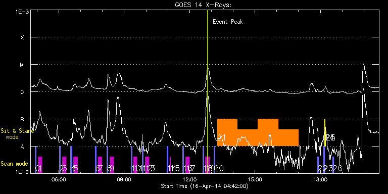 EIS Observation timeline overlay to GOES-Xray curve Code 1" 2" 40" 266" EIS Observations list for this event: STUDY ACRONYM ID DATE OBSERVED DESCRIPTION NOAA# TARGET 0 PRY_slot_contextLITE | 39716 | 2014/04/16 04:54:44 | HOP 79: solar irradiance scan (N-S) | 2034 | Active Region TIMELINE ID DATE OBSERVED FITS FILE XCEN (+W/-E) YCEN (+N/-S) DUR ----------------------------------------------------------------------------------------------------------------- 39716 | 2014/04/16 04:54:44.000 | eis_l0_20140416_045444.fits.gz | -15.38 | 44.30 | 2m56s 1 SK_DEEP_5x512_SLIT1 | 39717 | 2014/04/16 05:02:47 | HOP 79: solar irradiance scan (N-S) | | Quiet Sun TIMELINE ID DATE OBSERVED FITS FILE XCEN (+W/-E) YCEN (+N/-S) DUR ----------------------------------------------------------------------------------------------------------------- 39717 | 2014/04/16 05:02:47.000 | eis_l0_20140416_050247.fits.gz | -0.23 | 44.37 | 10m8s 2 PRY_slot_contextLITE | 39718 | 2014/04/16 06:01:05 | HOP 79: solar irradiance scan (N-S) | 2034 | Active Region TIMELINE ID DATE OBSERVED FITS FILE XCEN (+W/-E) YCEN (+N/-S) DUR ----------------------------------------------------------------------------------------------------------------- 39718 | 2014/04/16 06:01:05.000 | eis_l0_20140416_060105.fits.gz | -15.38 | 144.41 | 2m56s 3 SK_DEEP_5x512_SLIT1 | 39719 | 2014/04/16 06:09:08 | HOP 79: solar irradiance scan (N-S) | | Quiet Sun TIMELINE ID DATE OBSERVED FITS FILE XCEN (+W/-E) YCEN (+N/-S) DUR ----------------------------------------------------------------------------------------------------------------- 39719 | 2014/04/16 06:09:08.000 | eis_l0_20140416_060908.fits.gz | -0.15 | 144.49 | 10m8s 4 PRY_slot_contextLITE | 39720 | 2014/04/16 06:32:36 | HOP 79: solar irradiance scan (N-S) | 2034 | Active Region TIMELINE ID DATE OBSERVED FITS FILE XCEN (+W/-E) YCEN (+N/-S) DUR ----------------------------------------------------------------------------------------------------------------- 39720 | 2014/04/16 06:32:36.000 | eis_l0_20140416_063236.fits.gz | -15.45 | 244.68 | 2m56s 5 SK_DEEP_5x512_SLIT1 | 39721 | 2014/04/16 06:40:39 | HOP 79: solar irradiance scan (N-S) | | Quiet Sun TIMELINE ID DATE OBSERVED FITS FILE XCEN (+W/-E) YCEN (+N/-S) DUR ----------------------------------------------------------------------------------------------------------------- 39721 | 2014/04/16 06:40:39.000 | eis_l0_20140416_064039.fits.gz | -0.15 | 244.60 | 10m7s 6 PRY_slot_contextLITE | 39722 | 2014/04/16 07:40:36 | HOP 79: solar irradiance scan (N-S) | 2034 | Active Region TIMELINE ID DATE OBSERVED FITS FILE XCEN (+W/-E) YCEN (+N/-S) DUR ----------------------------------------------------------------------------------------------------------------- 39722 | 2014/04/16 07:40:36.000 | eis_l0_20140416_074036.fits.gz | -15.38 | 344.56 | 2m56s 7 SK_DEEP_5x512_SLIT1 | 39723 | 2014/04/16 07:48:39 | HOP 79: solar irradiance scan (N-S) | | Quiet Sun TIMELINE ID DATE OBSERVED FITS FILE XCEN (+W/-E) YCEN (+N/-S) DUR ----------------------------------------------------------------------------------------------------------------- 39723 | 2014/04/16 07:48:39.000 | eis_l0_20140416_074839.fits.gz | -0.23 | 344.56 | 10m7s 8 PRY_slot_contextLITE | 39724 | 2014/04/16 08:12:06 | HOP 79: solar irradiance scan (N-S) | 2039 | Active Region TIMELINE ID DATE OBSERVED FITS FILE XCEN (+W/-E) YCEN (+N/-S) DUR ----------------------------------------------------------------------------------------------------------------- 39724 | 2014/04/16 08:12:06.000 | eis_l0_20140416_081206.fits.gz | -15.30 | 444.67 | 2m57s 9 SK_DEEP_5x512_SLIT1 | 39725 | 2014/04/16 08:20:10 | HOP 79: solar irradiance scan (N-S) | | Quiet Sun TIMELINE ID DATE OBSERVED FITS FILE XCEN (+W/-E) YCEN (+N/-S) DUR ----------------------------------------------------------------------------------------------------------------- 39725 | 2014/04/16 08:20:10.000 | eis_l0_20140416_082010.fits.gz | -0.15 | 444.75 | 10m7s 10 PRY_slot_contextLITE | 39726 | 2014/04/16 09:18:26 | HOP 79: solar irradiance scan (N-S) | 2039 | Active Region TIMELINE ID DATE OBSERVED FITS FILE XCEN (+W/-E) YCEN (+N/-S) DUR ----------------------------------------------------------------------------------------------------------------- 39726 | 2014/04/16 09:18:26.000 | eis_l0_20140416_091826.fits.gz | -15.45 | 544.40 | 2m57s 11 SK_DEEP_5x512_SLIT1 | 39727 | 2014/04/16 09:26:30 | HOP 79: solar irradiance scan (N-S) | | Quiet Sun TIMELINE ID DATE OBSERVED FITS FILE XCEN (+W/-E) YCEN (+N/-S) DUR ----------------------------------------------------------------------------------------------------------------- 39727 | 2014/04/16 09:26:30.000 | eis_l0_20140416_092630.fits.gz | -0.15 | 544.40 | 8m6s 12 PRY_slot_contextLITE | 39728 | 2014/04/16 09:49:57 | HOP 79: solar irradiance scan (N-S) | 2039 | Active Region TIMELINE ID DATE OBSERVED FITS FILE XCEN (+W/-E) YCEN (+N/-S) DUR ----------------------------------------------------------------------------------------------------------------- 39728 | 2014/04/16 09:49:57.000 | eis_l0_20140416_094957.fits.gz | -15.38 | 644.43 | 2m57s 13 SK_DEEP_5x512_SLIT1 | 39729 | 2014/04/16 09:58:01 | HOP 79: solar irradiance scan (N-S) | | Quiet Sun TIMELINE ID DATE OBSERVED FITS FILE XCEN (+W/-E) YCEN (+N/-S) DUR ----------------------------------------------------------------------------------------------------------------- 39729 | 2014/04/16 09:58:01.000 | eis_l0_20140416_095801.fits.gz | -0.23 | 644.43 | 10m8s 14 PRY_slot_contextLITE | 39730 | 2014/04/16 10:57:57 | HOP 79: solar irradiance scan (N-S) | | Active Region TIMELINE ID DATE OBSERVED FITS FILE XCEN (+W/-E) YCEN (+N/-S) DUR ----------------------------------------------------------------------------------------------------------------- 39730 | 2014/04/16 10:57:57.000 | eis_l0_20140416_105757.fits.gz | -15.38 | 744.55 | 2m57s 15 SK_DEEP_5x512_SLIT1 | 39731 | 2014/04/16 11:06:01 | HOP 79: solar irradiance scan (N-S) | | Quiet Sun TIMELINE ID DATE OBSERVED FITS FIL