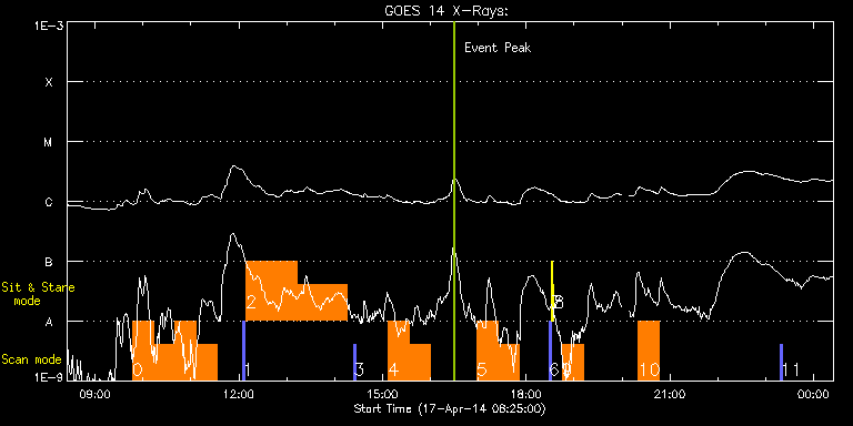 EIS Observation timeline overlay to GOES-Xray curve Code 1" 2" 40" 266" EIS Observations list for this event: STUDY ACRONYM ID DATE OBSERVED DESCRIPTION NOAA# TARGET 0 PRY_footpoints_lite | 39806 | 2014/04/17 09:46:34 | Active region plage | 2035 | Active Region TIMELINE ID DATE OBSERVED FITS FILE XCEN (+W/-E) YCEN (+N/-S) DUR ----------------------------------------------------------------------------------------------------------------- 39806 | 2014/04/17 09:46:34.000 | eis_l0_20140417_094634.fits.gz | -136.04 | -196.24 | 26m22s 39806 | 2014/04/17 10:12:59.000 | eis_l0_20140417_101259.fits.gz | -132.10 | -196.09 | 26m22s 39806 | 2014/04/17 10:39:24.000 | eis_l0_20140417_103924.fits.gz | -128.32 | -196.24 | 26m23s 39806 | 2014/04/17 11:05:50.000 | eis_l0_20140417_110550.fits.gz | -124.46 | -196.17 | 26m22s 1 PRY_slot_contextLITE | 39779 | 2014/04/17 12:05:20 | IHOP 249: spicules at north pole | | Active Region TIMELINE ID DATE OBSERVED FITS FILE XCEN (+W/-E) YCEN (+N/-S) DUR ----------------------------------------------------------------------------------------------------------------- 39779 | 2014/04/17 12:05:20.000 | eis_l0_20140417_120520.fits.gz | -20.20 | 969.60 | 2m57s 2 vhh_slowar_sas_1h6m | 39780 | 2014/04/17 12:09:34 | IHOP 249: spicules at north pole | | Active Region TIMELINE ID DATE OBSERVED FITS FILE XCEN (+W/-E) YCEN (+N/-S) DUR ----------------------------------------------------------------------------------------------------------------- 39780 | 2014/04/17 12:09:34.000 | eis_l0_20140417_120934.fits.gz | -5.63 | 969.60 | 1h2m49s 39780 | 2014/04/17 13:12:26.000 | eis_l0_20140417_131226.fits.gz | -5.63 | 969.67 | 1h2m50s 3 PRY_slot_contextLITE | 39781 | 2014/04/17 14:24:20 | IHOP 249: spicules at north pole | | Active Region TIMELINE ID DATE OBSERVED FITS FILE XCEN (+W/-E) YCEN (+N/-S) DUR ----------------------------------------------------------------------------------------------------------------- 39781 | 2014/04/17 14:24:20.000 | eis_l0_20140417_142420.fits.gz | -20.20 | 969.67 | 2m56s 4 PRY_footpoints_lite | 39807 | 2014/04/17 15:07:04 | Active region plage | | Active Region TIMELINE ID DATE OBSERVED FITS FILE XCEN (+W/-E) YCEN (+N/-S) DUR ----------------------------------------------------------------------------------------------------------------- 39807 | 2014/04/17 15:07:04.000 | eis_l0_20140417_150704.fits.gz | 348.76 | -170.19 | 26m22s 39807 | 2014/04/17 15:33:29.000 | eis_l0_20140417_153329.fits.gz | 352.24 | -170.42 | 26m22s 5 PRY_footpoints_lite | 39808 | 2014/04/17 16:58:13 | Active region plage | | Active Region TIMELINE ID DATE OBSERVED FITS FILE XCEN (+W/-E) YCEN (+N/-S) DUR ----------------------------------------------------------------------------------------------------------------- 39808 | 2014/04/17 16:58:13.000 | eis_l0_20140417_165813.fits.gz | 363.52 | -169.88 | 26m23s 39808 | 2014/04/17 17:24:39.000 | eis_l0_20140417_172439.fits.gz | 367.07 | -170.12 | 26m23s 6 PRY_slot_contextLITE | 39782 | 2014/04/17 18:28:21 | XRT synoptic | 2034 | Active Region TIMELINE ID DATE OBSERVED FITS FILE XCEN (+W/-E) YCEN (+N/-S) DUR ----------------------------------------------------------------------------------------------------------------- 39782 | 2014/04/17 18:28:21.000 | eis_l0_20140417_182821.fits.gz | -15.21 | -0.35 | 2m56s 7 Alignment_266 | 39783 | 2014/04/17 18:32:07 | XRT synoptic | 2035 | Quiet Sun TIMELINE ID DATE OBSERVED FITS FILE XCEN (+W/-E) YCEN (+N/-S) DUR ----------------------------------------------------------------------------------------------------------------- 39783 | 2014/04/17 18:32:07.000 | eis_l0_20140417_183207.fits.gz | -132.57 | -0.35 | 1m22s 8 XRT_synop_AIA | 39788 | 2014/04/17 18:34:33 | XRT synoptic | 2035 | Quiet Sun TIMELINE ID DATE OBSERVED FITS FILE XCEN (+W/-E) YCEN (+N/-S) DUR ----------------------------------------------------------------------------------------------------------------- 39788 | 2014/04/17 18:34:33.000 | eis_l0_20140417_183433.fits.gz | -132.57 | -0.35 | 10s 9 PRY_footpoints_lite | 39809 | 2014/04/17 18:45:20 | Active region plage | | Active Region TIMELINE ID DATE OBSERVED FITS FILE XCEN (+W/-E) YCEN (+N/-S) DUR ----------------------------------------------------------------------------------------------------------------- 39809 | 2014/04/17 18:45:20.000 | eis_l0_20140417_184520.fits.gz | 377.73 | -220.50 | 26m22s 10 PRY_footpoints_lite | 39810 | 2014/04/17 20:20:40 | Active region plage | | Active Region TIMELINE ID DATE OBSERVED FITS FILE XCEN (+W/-E) YCEN (+N/-S) DUR ----------------------------------------------------------------------------------------------------------------- 39810 | 2014/04/17 20:20:40.000 | eis_l0_20140417_202040.fits.gz | 390.24 | -221.04 | 26m22s 11 PRY_slot_context_v3 | 39789 | 2014/04/17 23:18:21 | IHOP 252: Filament | | Active Region TIMELINE ID DATE OBSERVED FITS FILE XCEN (+W/-E) YCEN (+N/-S) DUR ----------------------------------------------------------------------------------------------------------------- 39789 | 2014/04/17 23:18:21.000 | eis_l0_20140417_231821.fits.gz | 406.66 | -700.49 | 2m56s : Check study information : Download file : View thumbnails For this event, also check for: