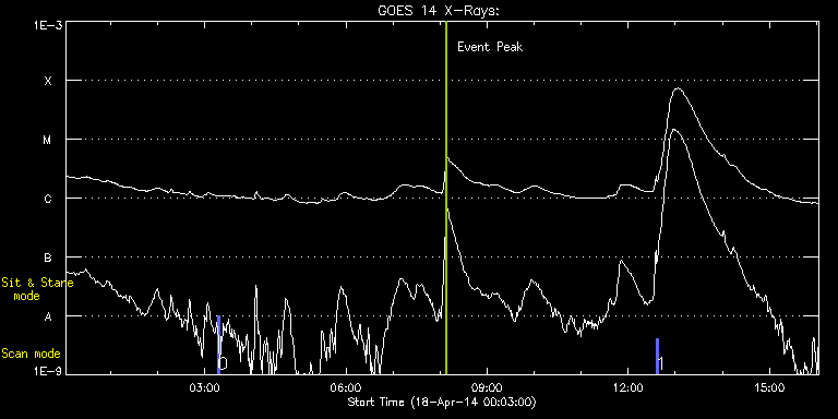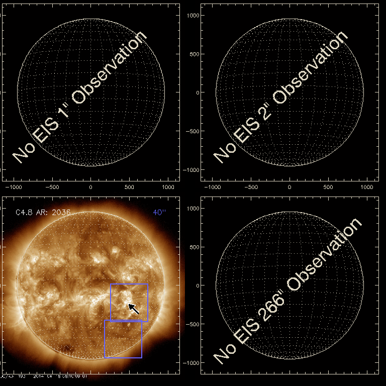 EIS Observation timeline overlay to GOES-Xray curve Code 1" 2" 40" 266" EIS Observations list for this event: STUDY ACRONYM ID DATE OBSERVED DESCRIPTION NOAA# TARGET 0 PRY_slot_context_v3 | 39791 | 2014/04/18 03:16:20 | IHOP 252: Filament | | Active Region TIMELINE ID DATE OBSERVED FITS FILE XCEN (+W/-E) YCEN (+N/-S) DUR ----------------------------------------------------------------------------------------------------------------- 39791 | 2014/04/18 03:16:20.000 | eis_l0_20140418_031620.fits.gz | 418.77 | -700.89 | 2m56s 1 PRY_slot_context_v3 | 39792 | 2014/04/18 12:35:13 | IHOP 241: Flare watch | 2036 | Active Region TIMELINE ID DATE OBSERVED FITS FILE XCEN (+W/-E) YCEN (+N/-S) DUR ----------------------------------------------------------------------------------------------------------------- 39792 | 2014/04/18 12:35:13.000 | eis_l0_20140418_123513.fits.gz | 497.56 | -228.46 | 2m56s : Check study information : Download file : View thumbnails For this event, also check for: