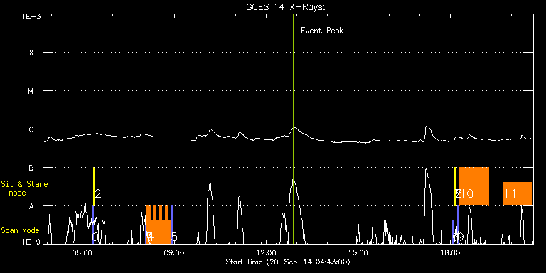 EIS Observation timeline overlay to GOES-Xray curve Code 1" 2" 40" 266" EIS Observations list for this event: STUDY ACRONYM ID DATE OBSERVED DESCRIPTION NOAA# TARGET 0 PRY_slot_contextLITE | 42828 | 2014/09/20 06:18:56 | EIS pointing monitoring | | Active Region TIMELINE ID DATE OBSERVED FITS FILE XCEN (+W/-E) YCEN (+N/-S) DUR ----------------------------------------------------------------------------------------------------------------- 42828 | 2014/09/20 06:18:56.000 | eis_l0_20140920_061856.fits.gz | -15.29 | -0.35 | 2m57s 1 Alignment_266 | 42829 | 2014/09/20 06:22:11 | EIS pointing monitoring | | Quiet Sun TIMELINE ID DATE OBSERVED FITS FILE XCEN (+W/-E) YCEN (+N/-S) DUR ----------------------------------------------------------------------------------------------------------------- 42829 | 2014/09/20 06:22:11.000 | eis_l0_20140920_062211.fits.gz | -132.57 | -0.50 | 1m22s 2 XRT_synop_AIA | 42830 | 2014/09/20 06:24:18 | EIS pointing monitoring | | Quiet Sun TIMELINE ID DATE OBSERVED FITS FILE XCEN (+W/-E) YCEN (+N/-S) DUR ----------------------------------------------------------------------------------------------------------------- 42830 | 2014/09/20 06:24:18.000 | eis_l0_20140920_062418.fits.gz | -132.49 | -0.27 | 10s 3 PRY_slot_context_v3 | 42816 | 2014/09/20 08:03:27 | Jets in CH/QS: CH/QS network | | Active Region TIMELINE ID DATE OBSERVED FITS FILE XCEN (+W/-E) YCEN (+N/-S) DUR ----------------------------------------------------------------------------------------------------------------- 42816 | 2014/09/20 08:03:27.000 | eis_l0_20140920_080327.fits.gz | -219.35 | 16.69 | 2m56s 4 Cor_Hole_Jet_v1 | 42817 | 2014/09/20 08:06:48 | Jets in CH/QS: CH/QS network | | Quiet Sun TIMELINE ID DATE OBSERVED FITS FILE XCEN (+W/-E) YCEN (+N/-S) DUR ----------------------------------------------------------------------------------------------------------------- 42817 | 2014/09/20 08:06:48.000 | eis_l0_20140920_080648.fits.gz | -204.99 | 16.62 | 5m47s 42817 | 2014/09/20 08:12:38.000 | eis_l0_20140920_081238.fits.gz | -204.14 | 16.69 | 5m47s 42817 | 2014/09/20 08:18:28.000 | eis_l0_20140920_081828.fits.gz | -203.29 | 16.69 | 5m47s 42817 | 2014/09/20 08:24:18.000 | eis_l0_20140920_082418.fits.gz | -202.36 | 16.46 | 5m46s 42817 | 2014/09/20 08:30:07.000 | eis_l0_20140920_083007.fits.gz | -201.59 | 16.62 | 5m47s 42817 | 2014/09/20 08:35:57.000 | eis_l0_20140920_083557.fits.gz | -200.66 | 16.62 | 5m46s 42817 | 2014/09/20 08:41:46.000 | eis_l0_20140920_084146.fits.gz | -199.73 | 16.38 | 5m47s 42817 | 2014/09/20 08:47:36.000 | eis_l0_20140920_084736.fits.gz | -198.96 | 16.46 | 5m47s 5 PRY_slot_context_v3 | 42818 | 2014/09/20 08:53:34 | Jets in CH/QS: CH/QS network | | Active Region TIMELINE ID DATE OBSERVED FITS FILE XCEN (+W/-E) YCEN (+N/-S) DUR ----------------------------------------------------------------------------------------------------------------- 42818 | 2014/09/20 08:53:34.000 | eis_l0_20140920_085334.fits.gz | -211.78 | 16.54 | 2m56s 6 PRY_slot_contextLITE | 42838 | 2014/09/20 18:04:14 | EIS pointing monitoring | | Active Region TIMELINE ID DATE OBSERVED FITS FILE XCEN (+W/-E) YCEN (+N/-S) DUR ----------------------------------------------------------------------------------------------------------------- 42838 | 2014/09/20 18:04:14.000 | eis_l0_20140920_180414.fits.gz | -15.14 | -0.11 | 2m56s 7 Alignment_266 | 42839 | 2014/09/20 18:07:58 | EIS pointing monitoring | | Quiet Sun TIMELINE ID DATE OBSERVED FITS FILE XCEN (+W/-E) YCEN (+N/-S) DUR ----------------------------------------------------------------------------------------------------------------- 42839 | 2014/09/20 18:07:58.000 | eis_l0_20140920_180758.fits.gz | -132.41 | -0.50 | 1m22s 8 XRT_synop_AIA | 42840 | 2014/09/20 18:10:20 | EIS pointing monitoring | | Quiet Sun TIMELINE ID DATE OBSERVED FITS FILE XCEN (+W/-E) YCEN (+N/-S) DUR ----------------------------------------------------------------------------------------------------------------- 42840 | 2014/09/20 18:10:20.000 | eis_l0_20140920_181020.fits.gz | -132.49 | -0.50 | 10s 9 PRY_slot_context_v3 | 42856 | 2014/09/20 18:14:27 | HOP 266 | 2169 | Active Region TIMELINE ID DATE OBSERVED FITS FILE XCEN (+W/-E) YCEN (+N/-S) DUR ----------------------------------------------------------------------------------------------------------------- 42856 | 2014/09/20 18:14:27.000 | eis_l0_20140920_181427.fits.gz | -571.54 | -216.95 | 2m56s 10 Cool_loop_stare | 42857 | 2014/09/20 18:18:37 | HOP 266 | | Quiet Sun TIMELINE ID DATE OBSERVED FITS FILE XCEN (+W/-E) YCEN (+N/-S) DUR ----------------------------------------------------------------------------------------------------------------- 42857 | 2014/09/20 18:18:37.000 | eis_l0_20140920_181837.fits.gz | -607.18 | -296.95 | 57m5s 11 Cool_loop_stare | 42881 | 2014/09/20 19:43:44 | HOP 266 | | Quiet Sun TIMELINE ID DATE OBSERVED FITS FILE XCEN (+W/-E) YCEN (+N/-S) DUR ----------------------------------------------------------------------------------------------------------------- 42881 | 2014/09/20 19:43:44.000 | eis_l0_20140920_194344.fits.gz | -597.21 | -297.72 | 57m6s : Check study information : Download file : View thumbnails For this event, also check for: