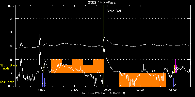 EIS Observation timeline overlay to GOES-Xray curve Code 1" 2" 40" 266" EIS Observations list for this event: STUDY ACRONYM ID DATE OBSERVED DESCRIPTION NOAA# TARGET 0 PRY_slot_contextLITE | 42907 | 2014/09/24 18:02:33 | EIS pointing monitoring | 2170 | Active Region TIMELINE ID DATE OBSERVED FITS FILE XCEN (+W/-E) YCEN (+N/-S) DUR ----------------------------------------------------------------------------------------------------------------- 42907 | 2014/09/24 18:02:33.000 | eis_l0_20140924_180233.fits.gz | -15.06 | -0.50 | 2m45s 1 Alignment_266 | 42908 | 2014/09/24 18:05:57 | EIS pointing monitoring | | Quiet Sun TIMELINE ID DATE OBSERVED FITS FILE XCEN (+W/-E) YCEN (+N/-S) DUR ----------------------------------------------------------------------------------------------------------------- 42908 | 2014/09/24 18:05:57.000 | eis_l0_20140924_180557.fits.gz | -132.41 | -0.50 | 1m22s 2 XRT_synop_AIA | 42909 | 2014/09/24 18:08:19 | EIS pointing monitoring | | Quiet Sun TIMELINE ID DATE OBSERVED FITS FILE XCEN (+W/-E) YCEN (+N/-S) DUR ----------------------------------------------------------------------------------------------------------------- 42909 | 2014/09/24 18:08:19.000 | eis_l0_20140924_180819.fits.gz | -132.49 | -0.27 | 10s 3 PRY_slot_context_v3 | 42957 | 2014/09/24 18:12:26 | HOP 266 | | Active Region TIMELINE ID DATE OBSERVED FITS FILE XCEN (+W/-E) YCEN (+N/-S) DUR ----------------------------------------------------------------------------------------------------------------- 42957 | 2014/09/24 18:12:26.000 | eis_l0_20140924_181226.fits.gz | 241.66 | -277.12 | 2m57s 4 Cool_loop_stare | 42956 | 2014/09/24 18:53:33 | HOP 266 | | Quiet Sun TIMELINE ID DATE OBSERVED FITS FILE XCEN (+W/-E) YCEN (+N/-S) DUR ----------------------------------------------------------------------------------------------------------------- 42956 | 2014/09/24 18:53:33.000 | eis_l0_20140924_185333.fits.gz | 260.60 | -255.82 | 57m6s 42956 | 2014/09/24 19:50:42.000 | eis_l0_20140924_195042.fits.gz | 269.09 | -255.51 | 57m8s 42956 | 2014/09/24 20:47:52.000 | eis_l0_20140924_204752.fits.gz | 277.59 | -255.20 | 57m8s 42956 | 2014/09/24 21:45:02.000 | eis_l0_20140924_214502.fits.gz | 286.01 | -254.96 | 57m9s 42956 | 2014/09/24 22:42:14.000 | eis_l0_20140924_224214.fits.gz | 294.43 | -254.81 | 57m7s 5 arm_line_width | 42958 | 2014/09/25 01:05:13 | HOP 270 | | Coronal Hole TIMELINE ID DATE OBSERVED FITS FILE XCEN (+W/-E) YCEN (+N/-S) DUR ----------------------------------------------------------------------------------------------------------------- 42958 | 2014/09/25 01:05:13.000 | eis_l0_20140925_010513.fits.gz | 308.63 | -300.96 | 4h15m42s 6 PRY_slot_contextLITE | 42910 | 2014/09/25 06:02:49 | EIS pointing monitoring | | Active Region TIMELINE ID DATE OBSERVED FITS FILE XCEN (+W/-E) YCEN (+N/-S) DUR ----------------------------------------------------------------------------------------------------------------- 42910 | 2014/09/25 06:02:49.000 | eis_l0_20140925_060249.fits.gz | -15.29 | -0.35 | 2m56s 7 XRT_synop_AIA | 42912 | 2014/09/25 06:08:49 | EIS pointing monitoring | | Quiet Sun TIMELINE ID DATE OBSERVED FITS FILE XCEN (+W/-E) YCEN (+N/-S) DUR ----------------------------------------------------------------------------------------------------------------- 42912 | 2014/09/25 06:08:49.000 | eis_l0_20140925_060849.fits.gz | -132.49 | -0.35 | 10s 8 regcal071 | 42966 | 2014/09/25 06:12:41 | Dark exposures, CCD bottom rows (100s | | Engineering TIMELINE ID DATE OBSERVED FITS FILE XCEN (+W/-E) YCEN (+N/-S) DUR ----------------------------------------------------------------------------------------------------------------- 42966 | 2014/09/25 06:12:41.000 | eis_l0_20140925_061241.fits.gz | -374.58 | -629.48 | 3m22s 9 regcal072 | 42969 | 2014/09/25 06:17:11 | Dark exposures, top CCD rows (100s exp | | Engineering TIMELINE ID DATE OBSERVED FITS FILE XCEN (+W/-E) YCEN (+N/-S) DUR ----------------------------------------------------------------------------------------------------------------- 42969 | 2014/09/25 06:17:11.000 | eis_l0_20140925_061711.fits.gz | -373.89 | -118.40 | 3m22s : Check study information : Download file : View thumbnails For this event, also check for: