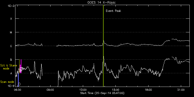 EIS Observation timeline overlay to GOES-Xray curve Code 1" 2" 40" 266" EIS Observations list for this event: STUDY ACRONYM ID DATE OBSERVED DESCRIPTION NOAA# TARGET 0 PRY_slot_contextLITE | 42910 | 2014/09/25 06:02:49 | EIS pointing monitoring | | Active Region TIMELINE ID DATE OBSERVED FITS FILE XCEN (+W/-E) YCEN (+N/-S) DUR ----------------------------------------------------------------------------------------------------------------- 42910 | 2014/09/25 06:02:49.000 | eis_l0_20140925_060249.fits.gz | -15.29 | -0.35 | 2m56s 1 XRT_synop_AIA | 42912 | 2014/09/25 06:08:49 | EIS pointing monitoring | | Quiet Sun TIMELINE ID DATE OBSERVED FITS FILE XCEN (+W/-E) YCEN (+N/-S) DUR ----------------------------------------------------------------------------------------------------------------- 42912 | 2014/09/25 06:08:49.000 | eis_l0_20140925_060849.fits.gz | -132.49 | -0.35 | 10s 2 regcal071 | 42966 | 2014/09/25 06:12:41 | Dark exposures, CCD bottom rows (100s | | Engineering TIMELINE ID DATE OBSERVED FITS FILE XCEN (+W/-E) YCEN (+N/-S) DUR ----------------------------------------------------------------------------------------------------------------- 42966 | 2014/09/25 06:12:41.000 | eis_l0_20140925_061241.fits.gz | -374.58 | -629.48 | 3m22s 3 regcal072 | 42969 | 2014/09/25 06:17:11 | Dark exposures, top CCD rows (100s exp | | Engineering TIMELINE ID DATE OBSERVED FITS FILE XCEN (+W/-E) YCEN (+N/-S) DUR ----------------------------------------------------------------------------------------------------------------- 42969 | 2014/09/25 06:17:11.000 | eis_l0_20140925_061711.fits.gz | -373.89 | -118.40 | 3m22s : Check study information : Download file : View thumbnails For this event, also check for: