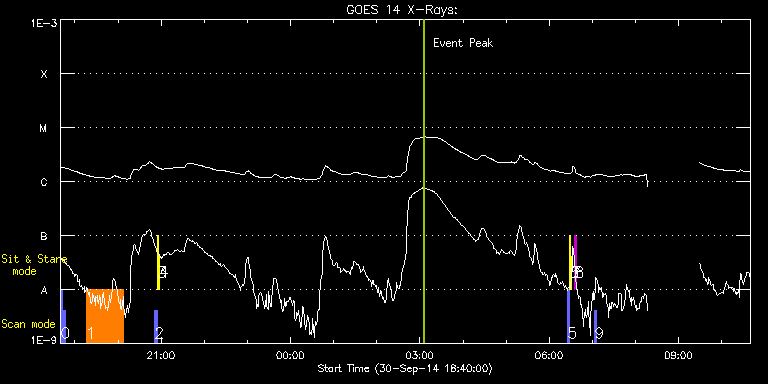 EIS Observation timeline overlay to GOES-Xray curve Code 1" 2" 40" 266" EIS Observations list for this event: STUDY ACRONYM ID DATE OBSERVED DESCRIPTION NOAA# TARGET 0 PRY_slot_context_v3 | 43053 | 2014/09/30 18:40:20 | HOP273 | | Active Region TIMELINE ID DATE OBSERVED FITS FILE XCEN (+W/-E) YCEN (+N/-S) DUR ----------------------------------------------------------------------------------------------------------------- 43053 | 2014/09/30 18:40:20.000 | eis_l0_20140930_184020.fits.gz | 731.98 | -235.61 | 2m56s 43053 | 2014/09/30 18:43:20.000 | eis_l0_20140930_184320.fits.gz | 732.29 | -235.54 | 2m57s 1 EUNIS_EIS_CrossCal | 43056 | 2014/09/30 19:15:34 | HOP273 | | Quiet Sun TIMELINE ID DATE OBSERVED FITS FILE XCEN (+W/-E) YCEN (+N/-S) DUR ----------------------------------------------------------------------------------------------------------------- 43056 | 2014/09/30 19:15:34.000 | eis_l0_20140930_191534.fits.gz | 741.98 | -235.15 | 52m44s 2 PRY_slot_context_v3 | 43085 | 2014/09/30 20:51:21 | alignemnt | | Active Region TIMELINE ID DATE OBSERVED FITS FILE XCEN (+W/-E) YCEN (+N/-S) DUR ----------------------------------------------------------------------------------------------------------------- 43085 | 2014/09/30 20:51:21.000 | eis_l0_20140930_205121.fits.gz | -20.11 | -5.35 | 2m56s 3 Alignment_266 | 43086 | 2014/09/30 20:54:36 | alignemnt | | Quiet Sun TIMELINE ID DATE OBSERVED FITS FILE XCEN (+W/-E) YCEN (+N/-S) DUR ----------------------------------------------------------------------------------------------------------------- 43086 | 2014/09/30 20:54:36.000 | eis_l0_20140930_205436.fits.gz | -137.23 | -5.50 | 1m22s 4 XRT_synop_AIA | 43087 | 2014/09/30 20:57:10 | alignemnt | | Quiet Sun TIMELINE ID DATE OBSERVED FITS FILE XCEN (+W/-E) YCEN (+N/-S) DUR ----------------------------------------------------------------------------------------------------------------- 43087 | 2014/09/30 20:57:10.000 | eis_l0_20140930_205710.fits.gz | -137.23 | -5.42 | 10s 5 PRY_slot_context_v3 | 43042 | 2014/10/01 06:25:27 | alignemnt | | Active Region TIMELINE ID DATE OBSERVED FITS FILE XCEN (+W/-E) YCEN (+N/-S) DUR ----------------------------------------------------------------------------------------------------------------- 43042 | 2014/10/01 06:25:27.000 | eis_l0_20141001_062527.fits.gz | -19.95 | -5.50 | 2m56s 6 Alignment_266 | 43043 | 2014/10/01 06:28:42 | alignemnt | | Quiet Sun TIMELINE ID DATE OBSERVED FITS FILE XCEN (+W/-E) YCEN (+N/-S) DUR ----------------------------------------------------------------------------------------------------------------- 43043 | 2014/10/01 06:28:42.000 | eis_l0_20141001_062842.fits.gz | -137.23 | -5.50 | 1m22s 7 XRT_synop_AIA | 43044 | 2014/10/01 06:31:16 | alignemnt | | Quiet Sun TIMELINE ID DATE OBSERVED FITS FILE XCEN (+W/-E) YCEN (+N/-S) DUR ----------------------------------------------------------------------------------------------------------------- 43044 | 2014/10/01 06:31:16.000 | eis_l0_20141001_063116.fits.gz | -137.23 | -5.58 | 10s 8 regcal074 | 43082 | 2014/10/01 06:35:12 | Dark exposures including overscan pixe | | Engineering TIMELINE ID DATE OBSERVED FITS FILE XCEN (+W/-E) YCEN (+N/-S) DUR ----------------------------------------------------------------------------------------------------------------- 43082 | 2014/10/01 06:35:12.000 | eis_l0_20141001_063512.fits.gz | -230.21 | 283.83 | 3m22s 9 PRY_slot_context_v3 | 43088 | 2014/10/01 07:03:27 | HOP257 | | Active Region TIMELINE ID DATE OBSERVED FITS FILE XCEN (+W/-E) YCEN (+N/-S) DUR ----------------------------------------------------------------------------------------------------------------- 43088 | 2014/10/01 07:03:27.000 | eis_l0_20141001_070327.fits.gz | -504.60 | -105.61 | 2m57s : Check study information : Download file : View thumbnails For this event, also check for: