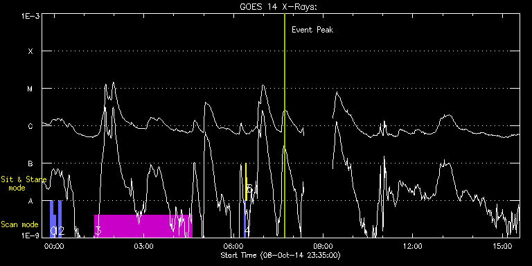 EIS Observation timeline overlay to GOES-Xray curve Code 1" 2" 40" 266" EIS Observations list for this event: STUDY ACRONYM ID DATE OBSERVED DESCRIPTION NOAA# TARGET 0 full_sun_slot_scan_2 | 43226 | 2014/10/08 23:52:13 | HOP130 | 2184 | Quiet Sun TIMELINE ID DATE OBSERVED FITS FILE XCEN (+W/-E) YCEN (+N/-S) DUR ----------------------------------------------------------------------------------------------------------------- 43226 | 2014/10/08 23:52:13.000 | eis_l0_20141008_235213.fits.gz | -431.14 | -666.44 | 5m27s 1 full_sun_slot_scan_2 | 43227 | 2014/10/08 23:57:45 | HOP130 | | Quiet Sun TIMELINE ID DATE OBSERVED FITS FILE XCEN (+W/-E) YCEN (+N/-S) DUR ----------------------------------------------------------------------------------------------------------------- 43227 | 2014/10/08 23:57:45.000 | eis_l0_20141008_235745.fits.gz | -431.14 | -1138.44 | 5m27s 2 full_sun_slot_scan_2 | 43211 | 2014/10/09 00:08:13 | HOP130 | | Quiet Sun TIMELINE ID DATE OBSERVED FITS FILE XCEN (+W/-E) YCEN (+N/-S) DUR ----------------------------------------------------------------------------------------------------------------- 43211 | 2014/10/09 00:08:13.000 | eis_l0_20141009_000813.fits.gz | -835.07 | -763.25 | 5m26s 3 SYNOP006 | 43230 | 2014/10/09 01:21:19 | EIS sensitivity monotoring | | Quiet Sun TIMELINE ID DATE OBSERVED FITS FILE XCEN (+W/-E) YCEN (+N/-S) DUR ----------------------------------------------------------------------------------------------------------------- 43230 | 2014/10/09 01:21:19.000 | eis_l0_20141009_012119.fits.gz | -25.97 | -76.27 | 3h15m36s 4 PRY_slot_contextLITE | 43185 | 2014/10/09 06:21:03 | alignment | | Active Region TIMELINE ID DATE OBSERVED FITS FILE XCEN (+W/-E) YCEN (+N/-S) DUR ----------------------------------------------------------------------------------------------------------------- 43185 | 2014/10/09 06:21:03.000 | eis_l0_20141009_062103.fits.gz | -20.11 | -5.58 | 2m57s 5 Alignment_266 | 43186 | 2014/10/09 06:24:18 | alignment | | Quiet Sun TIMELINE ID DATE OBSERVED FITS FILE XCEN (+W/-E) YCEN (+N/-S) DUR ----------------------------------------------------------------------------------------------------------------- 43186 | 2014/10/09 06:24:18.000 | eis_l0_20141009_062418.fits.gz | -137.56 | -5.27 | 1m22s 6 XRT_synop_AIA | 43187 | 2014/10/09 06:26:25 | alignemnt | | Quiet Sun TIMELINE ID DATE OBSERVED FITS FILE XCEN (+W/-E) YCEN (+N/-S) DUR ----------------------------------------------------------------------------------------------------------------- 43187 | 2014/10/09 06:26:25.000 | eis_l0_20141009_062625.fits.gz | -137.48 | -5.50 | 11s : Check study information : Download file : View thumbnails For this event, also check for: