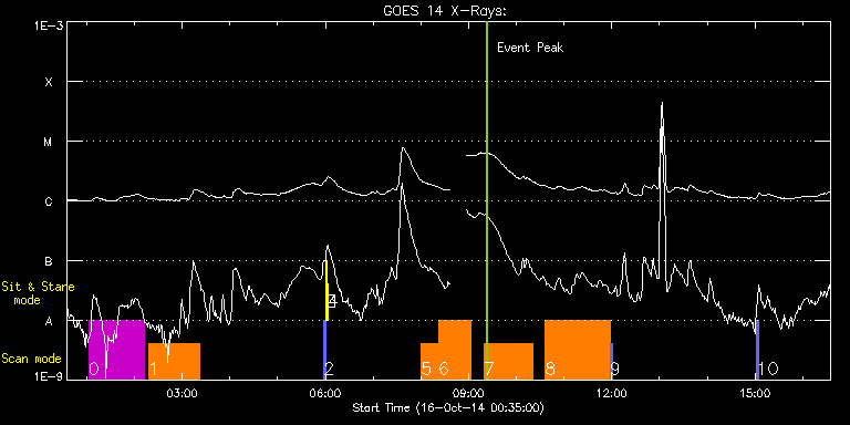 EIS Observation timeline overlay to GOES-Xray curve Code 1" 2" 40" 266" EIS Observations list for this event: STUDY ACRONYM ID DATE OBSERVED DESCRIPTION NOAA# TARGET 0 prom_rast_v1 | 43301 | 2014/10/16 01:02:20 | Prominence-Coronal Cavity Systems: Cyc | | Eruptive Filame TIMELINE ID DATE OBSERVED FITS FILE XCEN (+W/-E) YCEN (+N/-S) DUR ----------------------------------------------------------------------------------------------------------------- 43301 | 2014/10/16 01:02:20.000 | eis_l0_20141016_010220.fits.gz | 803.69 | 299.56 | 1h9m44s 1 GDZ_PLUME1_2_300_50s | 43303 | 2014/10/16 02:17:26 | Prominence-Coronal Cavity Systems: Cyc | | Coronal Hole TIMELINE ID DATE OBSERVED FITS FILE XCEN (+W/-E) YCEN (+N/-S) DUR ----------------------------------------------------------------------------------------------------------------- 43303 | 2014/10/16 02:17:26.000 | eis_l0_20141016_021726.fits.gz | 807.55 | 300.41 | 1h4m51s 2 PRY_slot_contextLITE | 43285 | 2014/10/16 05:57:49 | EIS pointing monitoring. | 2187 | Active Region TIMELINE ID DATE OBSERVED FITS FILE XCEN (+W/-E) YCEN (+N/-S) DUR ----------------------------------------------------------------------------------------------------------------- 43285 | 2014/10/16 05:57:49.000 | eis_l0_20141016_055749.fits.gz | -451.58 | -249.55 | 2m56s 3 Alignment_266 | 43286 | 2014/10/16 06:01:03 | EIS pointing monitoring. | 2187 | Quiet Sun TIMELINE ID DATE OBSERVED FITS FILE XCEN (+W/-E) YCEN (+N/-S) DUR ----------------------------------------------------------------------------------------------------------------- 43286 | 2014/10/16 06:01:03.000 | eis_l0_20141016_060103.fits.gz | -568.40 | -249.62 | 1m22s 4 XRT_synop_AIA | 43287 | 2014/10/16 06:03:11 | EIS pointing monitoring. | 2187 | Quiet Sun TIMELINE ID DATE OBSERVED FITS FILE XCEN (+W/-E) YCEN (+N/-S) DUR ----------------------------------------------------------------------------------------------------------------- 43287 | 2014/10/16 06:03:11.000 | eis_l0_20141016_060311.fits.gz | -568.09 | -249.70 | 10s 5 CompS_NonMax_30 | 43294 | 2014/10/16 08:00:19 | Searching for Non-Maxwellian Distribut | | Quiet Sun TIMELINE ID DATE OBSERVED FITS FILE XCEN (+W/-E) YCEN (+N/-S) DUR ----------------------------------------------------------------------------------------------------------------- 43294 | 2014/10/16 08:00:19.000 | eis_l0_20141016_080019.fits.gz | 993.12 | -303.45 | 21m15s 6 CompS_NonMax_60 | 43295 | 2014/10/16 08:22:06 | Searching for Non-Maxwellian Distribut | | Quiet Sun TIMELINE ID DATE OBSERVED FITS FILE XCEN (+W/-E) YCEN (+N/-S) DUR ----------------------------------------------------------------------------------------------------------------- 43295 | 2014/10/16 08:22:06.000 | eis_l0_20141016_082206.fits.gz | 993.20 | -303.53 | 41m15s 7 CompS_NonMax_90 | 43296 | 2014/10/16 09:19:27 | Searching for Non-Maxwellian Distribut | | Quiet Sun TIMELINE ID DATE OBSERVED FITS FILE XCEN (+W/-E) YCEN (+N/-S) DUR ----------------------------------------------------------------------------------------------------------------- 43296 | 2014/10/16 09:19:27.000 | eis_l0_20141016_091927.fits.gz | 993.20 | -303.22 | 1h1m15s 8 CompS_NonMax_120 | 43304 | 2014/10/16 10:36:14 | Searching for Non-Maxwellian Distribut | | Quiet Sun TIMELINE ID DATE OBSERVED FITS FILE XCEN (+W/-E) YCEN (+N/-S) DUR ----------------------------------------------------------------------------------------------------------------- 43304 | 2014/10/16 10:36:14.000 | eis_l0_20141016_103614.fits.gz | 993.12 | -303.14 | 1h21m14s 9 PRY_slot_context_v3 | 43305 | 2014/10/16 11:57:40 | Searching for Non-Maxwellian Distribut | 2185 | Active Region TIMELINE ID DATE OBSERVED FITS FILE XCEN (+W/-E) YCEN (+N/-S) DUR ----------------------------------------------------------------------------------------------------------------- 43305 | 2014/10/16 11:57:40.000 | eis_l0_20141016_115740.fits.gz | 848.41 | -303.45 | 2m56s 10 PRY_slot_contextLITE | 43323 | 2014/10/16 15:02:14 | Context image for flare observations w | | Active Region TIMELINE ID DATE OBSERVED FITS FILE XCEN (+W/-E) YCEN (+N/-S) DUR ----------------------------------------------------------------------------------------------------------------- 43323 | 2014/10/16 15:02:14.000 | eis_l0_20141016_150214.fits.gz | -9867.22 | -9951.20 | 2m56s : Check study information : Download file : View thumbnails For this event, also check for: