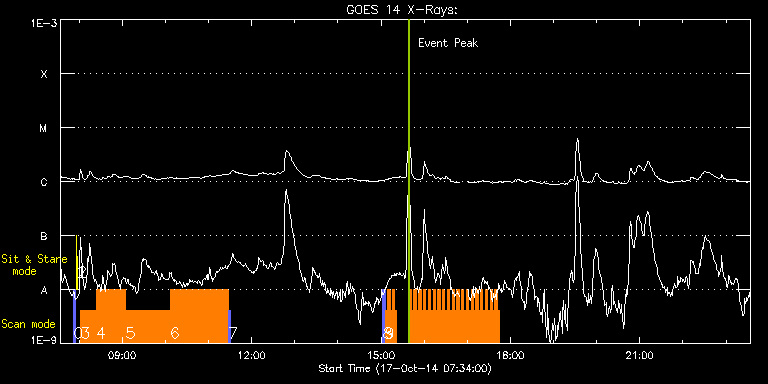 EIS Observation timeline overlay to GOES-Xray curve Code 1" 2" 40" 266" EIS Observations list for this event: STUDY ACRONYM ID DATE OBSERVED DESCRIPTION NOAA# TARGET 0 PRY_slot_contextLITE | 43312 | 2014/10/17 07:52:20 | EIS pointing monitoring. | | Active Region TIMELINE ID DATE OBSERVED FITS FILE XCEN (+W/-E) YCEN (+N/-S) DUR ----------------------------------------------------------------------------------------------------------------- 43312 | 2014/10/17 07:52:20.000 | eis_l0_20141017_075220.fits.gz | -15.14 | -0.42 | 2m56s 1 Alignment_266 | 43313 | 2014/10/17 07:55:34 | EIS pointing monitoring. | | Quiet Sun TIMELINE ID DATE OBSERVED FITS FILE XCEN (+W/-E) YCEN (+N/-S) DUR ----------------------------------------------------------------------------------------------------------------- 43313 | 2014/10/17 07:55:34.000 | eis_l0_20141017_075534.fits.gz | -132.49 | -0.35 | 1m22s 2 XRT_synop_AIA | 43314 | 2014/10/17 07:58:09 | EIS pointing monitoring. | | Quiet Sun TIMELINE ID DATE OBSERVED FITS FILE XCEN (+W/-E) YCEN (+N/-S) DUR ----------------------------------------------------------------------------------------------------------------- 43314 | 2014/10/17 07:58:09.000 | eis_l0_20141017_075809.fits.gz | -132.57 | -0.35 | 10s 3 CompS_NonMax_30 | 43306 | 2014/10/17 08:02:20 | Searching for Non-Maxwellian Distribut | | Quiet Sun TIMELINE ID DATE OBSERVED FITS FILE XCEN (+W/-E) YCEN (+N/-S) DUR ----------------------------------------------------------------------------------------------------------------- 43306 | 2014/10/17 08:02:20.000 | eis_l0_20141017_080220.fits.gz | -9958.81 | -9966.20 | 21m14s 4 CompS_NonMax_60 | 43307 | 2014/10/17 08:23:40 | Searching for Non-Maxwellian Distribut | | Quiet Sun TIMELINE ID DATE OBSERVED FITS FILE XCEN (+W/-E) YCEN (+N/-S) DUR ----------------------------------------------------------------------------------------------------------------- 43307 | 2014/10/17 08:23:40.000 | eis_l0_20141017_082340.fits.gz | -9958.81 | -9966.20 | 41m15s 5 CompS_NonMax_90 | 43308 | 2014/10/17 09:05:01 | Searching for Non-Maxwellian Distribut | | Quiet Sun TIMELINE ID DATE OBSERVED FITS FILE XCEN (+W/-E) YCEN (+N/-S) DUR ----------------------------------------------------------------------------------------------------------------- 43308 | 2014/10/17 09:05:01.000 | eis_l0_20141017_090501.fits.gz | -9958.81 | -9966.20 | 1h1m14s 6 CompS_NonMax_120 | 43309 | 2014/10/17 10:06:22 | Searching for Non-Maxwellian Distribut | | Quiet Sun TIMELINE ID DATE OBSERVED FITS FILE XCEN (+W/-E) YCEN (+N/-S) DUR ----------------------------------------------------------------------------------------------------------------- 43309 | 2014/10/17 10:06:22.000 | eis_l0_20141017_100622.fits.gz | -9959.06 | -9966.20 | 1h21m14s 7 PRY_slot_context_v3 | 43310 | 2014/10/17 11:27:48 | Searching for Non-Maxwellian Distribut | | Active Region TIMELINE ID DATE OBSERVED FITS FILE XCEN (+W/-E) YCEN (+N/-S) DUR ----------------------------------------------------------------------------------------------------------------- 43310 | 2014/10/17 11:27:48.000 | eis_l0_20141017_112748.fits.gz | -9891.68 | -9966.20 | 2m56s 8 PRY_slot_contextLITE | 43325 | 2014/10/17 15:02:40 | Context image for flare observations w | | Active Region TIMELINE ID DATE OBSERVED FITS FILE XCEN (+W/-E) YCEN (+N/-S) DUR ----------------------------------------------------------------------------------------------------------------- 43325 | 2014/10/17 15:02:40.000 | eis_l0_20141017_150240.fits.gz | -9867.22 | -9951.20 | 2m57s 9 qub_hi-cad_flare_v2 | 43326 | 2014/10/17 15:06:02 | Flare observations with DST, ROSA, IRI | | Flare TIMELINE ID DATE OBSERVED FITS FILE XCEN (+W/-E) YCEN (+N/-S) DUR ----------------------------------------------------------------------------------------------------------------- 43326 | 2014/10/17 15:06:02.000 | eis_l0_20141017_150602.fits.gz | -9852.48 | -9951.20 | 3m16s 43326 | 2014/10/17 15:09:21.000 | eis_l0_20141017_150921.fits.gz | -9852.48 | -9951.20 | 3m17s 43326 | 2014/10/17 15:12:40.000 | eis_l0_20141017_151240.fits.gz | -9852.48 | -9951.20 | 3m16s 43326 | 2014/10/17 15:15:59.000 | eis_l0_20141017_151559.fits.gz | -9852.48 | -9951.20 | 3m16s 43326 | 2014/10/17 15:19:18.000 | eis_l0_20141017_151918.fits.gz | -9852.48 | -9951.20 | 2m47s 43326 | 2014/10/17 15:40:29.000 | eis_l0_20141017_154029.fits.gz | -9852.48 | -9951.20 | 1m57s 43326 | 2014/10/17 15:42:28.000 | eis_l0_20141017_154228.fits.gz | -9852.48 | -9951.20 | 3m16s 43326 | 2014/10/17 15:45:47.000 | eis_l0_20141017_154547.fits.gz | -9852.48 | -9951.20 | 3m15s 43326 | 2014/10/17 15:49:05.000 | eis_l0_20141017_154905.fits.gz | -9852.48 | -9951.20 | 3m16s 43326 | 2014/10/17 15:52:23.000 | eis_l0_20141017_155223.fits.gz | -9852.48 | -9951.20 | 3m16s 43326 | 2014/10/17 15:55:42.000 | eis_l0_20141017_155542.fits.gz | -9852.48 | -9951.20 | 3m16s 43326 | 2014/10/17 15:59:01.000 | eis_l0_20141017_155901.fits.gz | -9852.48 | -9951.20 | 3m16s 43326 | 2014/10/17 16:02:20.000 | eis_l0_20141017_160220.fits.gz | -9852.48 | -9951.20 | 3m17s 43326 | 2014/10/17 16:05:39.000 | eis_l0_20141017_160539.fits.gz | -9852.48 | -9951.20 | 3m16s 43326 | 2014/10/17 16:08:58.000 | eis_l0_20141017_160858.fits.gz | -9852.48 | -9951.20 | 3m16s 43326 | 2014/10/17 16:12:16.000 | eis_l0_20141017_161216.fits.gz | -9852.48 | -9951.20 | 3m16s 43326 | 2014/10/17 16:15:35.000 | eis_l0_20141017_161535.fits.gz | -9852.48 | -9951.20 | 3m16s 43326 | 2014/10/17 16:18:53.000 | eis_l0_20141017_161853.fits.gz | -9852.48 | -9951.20 | 3m16s 43326 | 2014/10/17 16:22:12.000 | eis_l0_20141017_162212.fits.gz | -9852.48 | -9951.20 | 3m16s 43326 | 2014/10/17 16:25:30.000 | eis_l0_20141017_162530.fits.gz | -9852.48 | -9951.20 | 3m16s 43326 | 2014/10/17 16:28:49.000 | eis_l0_20141017_162849.fits.gz | -9852.48 | -9951.20 | 3m16s 43326 | 2014/10/17 16:32:08.000 | eis_l0_20141017_163208.fits.gz | -9852.48 | -9951.20 | 3m16s 43326 | 2014/10/17 16:35:27.000 | eis_l0_20141017_163527.fits.gz | -9852.48 | -9951.20