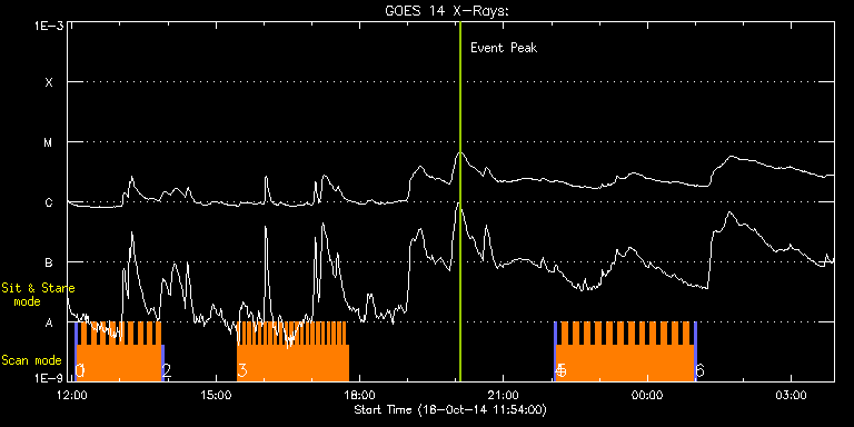 EIS Observation timeline overlay to GOES-Xray curve Code 1" 2" 40" 266" EIS Observations list for this event: STUDY ACRONYM ID DATE OBSERVED DESCRIPTION NOAA# TARGET 0 PRY_slot_context_v3 | 43329 | 2014/10/18 12:03:21 | HOP268 | 2187 | Active Region TIMELINE ID DATE OBSERVED FITS FILE XCEN (+W/-E) YCEN (+N/-S) DUR ----------------------------------------------------------------------------------------------------------------- 43329 | 2014/10/18 12:03:21.000 | eis_l0_20141018_120321.fits.gz | 88.45 | -222.64 | 2m56s 1 Cor_Hole_Jet_v1 | 43330 | 2014/10/18 12:06:43 | HOP268 | | Quiet Sun TIMELINE ID DATE OBSERVED FITS FILE XCEN (+W/-E) YCEN (+N/-S) DUR ----------------------------------------------------------------------------------------------------------------- 43330 | 2014/10/18 12:06:43.000 | eis_l0_20141018_120643.fits.gz | 122.47 | -222.72 | 5m46s 43330 | 2014/10/18 12:12:32.000 | eis_l0_20141018_121232.fits.gz | 123.32 | -222.41 | 5m47s 43330 | 2014/10/18 12:18:22.000 | eis_l0_20141018_121822.fits.gz | 124.32 | -222.56 | 5m46s 43330 | 2014/10/18 12:24:11.000 | eis_l0_20141018_122411.fits.gz | 125.17 | -222.64 | 5m47s 43330 | 2014/10/18 12:30:01.000 | eis_l0_20141018_123001.fits.gz | 126.10 | -222.64 | 5m46s 43330 | 2014/10/18 12:35:50.000 | eis_l0_20141018_123550.fits.gz | 126.95 | -222.72 | 5m47s 43330 | 2014/10/18 12:41:40.000 | eis_l0_20141018_124140.fits.gz | 127.87 | -222.64 | 5m47s 43330 | 2014/10/18 12:47:29.000 | eis_l0_20141018_124729.fits.gz | 128.72 | -222.72 | 5m47s 43330 | 2014/10/18 12:53:19.000 | eis_l0_20141018_125319.fits.gz | 129.73 | -222.49 | 5m47s 43330 | 2014/10/18 12:59:09.000 | eis_l0_20141018_125909.fits.gz | 130.50 | -222.49 | 5m46s 43330 | 2014/10/18 13:04:58.000 | eis_l0_20141018_130458.fits.gz | 131.43 | -222.49 | 5m47s 43330 | 2014/10/18 13:10:48.000 | eis_l0_20141018_131048.fits.gz | 132.28 | -222.41 | 5m47s 43330 | 2014/10/18 13:16:38.000 | eis_l0_20141018_131638.fits.gz | 133.20 | -222.49 | 5m47s 43330 | 2014/10/18 13:22:27.000 | eis_l0_20141018_132227.fits.gz | 134.13 | -222.56 | 5m47s 43330 | 2014/10/18 13:28:17.000 | eis_l0_20141018_132817.fits.gz | 135.06 | -222.56 | 5m47s 43330 | 2014/10/18 13:34:07.000 | eis_l0_20141018_133407.fits.gz | 135.91 | -222.41 | 5m47s 43330 | 2014/10/18 13:39:57.000 | eis_l0_20141018_133957.fits.gz | 136.76 | -222.49 | 5m46s 43330 | 2014/10/18 13:45:46.000 | eis_l0_20141018_134546.fits.gz | 137.61 | -222.41 | 5m47s 2 PRY_slot_context_v3 | 43331 | 2014/10/18 13:51:44 | HOP268 | 2187 | Active Region TIMELINE ID DATE OBSERVED FITS FILE XCEN (+W/-E) YCEN (+N/-S) DUR ----------------------------------------------------------------------------------------------------------------- 43331 | 2014/10/18 13:51:44.000 | eis_l0_20141018_135144.fits.gz | 104.82 | -222.25 | 2m56s 3 qub_hi-cad_flare_v2 | 43353 | 2014/10/18 15:26:33 | HOP263 | 2192 | Flare TIMELINE ID DATE OBSERVED FITS FILE XCEN (+W/-E) YCEN (+N/-S) DUR ----------------------------------------------------------------------------------------------------------------- 43353 | 2014/10/18 15:26:33.000 | eis_l0_20141018_152633.fits.gz | -904.73 | -243.94 | 3m17s 43353 | 2014/10/18 15:29:53.000 | eis_l0_20141018_152953.fits.gz | -904.65 | -243.86 | 3m16s 43353 | 2014/10/18 15:33:12.000 | eis_l0_20141018_153312.fits.gz | -904.34 | -244.09 | 3m16s 43353 | 2014/10/18 15:36:31.000 | eis_l0_20141018_153631.fits.gz | -904.19 | -244.09 | 3m16s 43353 | 2014/10/18 15:39:50.000 | eis_l0_20141018_153950.fits.gz | -903.96 | -244.09 | 3m17s 43353 | 2014/10/18 15:43:09.000 | eis_l0_20141018_154309.fits.gz | -903.72 | -244.17 | 3m16s 43353 | 2014/10/18 15:46:28.000 | eis_l0_20141018_154628.fits.gz | -903.57 | -244.25 | 3m16s 43353 | 2014/10/18 15:49:46.000 | eis_l0_20141018_154946.fits.gz | -903.41 | -244.17 | 3m17s 43353 | 2014/10/18 15:53:06.000 | eis_l0_20141018_155306.fits.gz | -903.18 | -244.17 | 3m15s 43353 | 2014/10/18 15:56:24.000 | eis_l0_20141018_155624.fits.gz | -903.11 | -244.17 | 3m16s 43353 | 2014/10/18 15:59:43.000 | eis_l0_20141018_155943.fits.gz | -902.80 | -244.40 | 3m15s 43353 | 2014/10/18 16:03:01.000 | eis_l0_20141018_160301.fits.gz | -902.64 | -244.32 | 3m16s 43353 | 2014/10/18 16:06:20.000 | eis_l0_20141018_160620.fits.gz | -902.41 | -244.40 | 3m16s 43353 | 2014/10/18 16:09:39.000 | eis_l0_20141018_160939.fits.gz | -902.26 | -244.56 | 3m15s 43353 | 2014/10/18 16:12:57.000 | eis_l0_20141018_161257.fits.gz | -902.10 | -244.40 | 3m16s 43353 | 2014/10/18 16:16:16.000 | eis_l0_20141018_161616.fits.gz | -901.87 | -244.63 | 3m16s 43353 | 2014/10/18 16:19:35.000 | eis_l0_20141018_161935.fits.gz | -901.72 | -244.71 | 3m16s 43353 | 2014/10/18 16:22:53.000 | eis_l0_20141018_162253.fits.gz | -901.56 | -244.63 | 3m17s 43353 | 2014/10/18 16:26:12.000 | eis_l0_20141018_162612.fits.gz | -901.33 | -244.71 | 3m17s 43353 | 2014/10/18 16:29:31.000 | eis_l0_20141018_162931.fits.gz | -901.10 | -244.56 | 3m16s 43353 | 2014/10/18 16:32:50.000 | eis_l0_20141018_163250.fits.gz | -900.94 | -244.63 | 3m16s 43353 | 2014/10/18 16:36:09.000 | eis_l0_20141018_163609.fits.gz | -900.71 | -245.02 | 3m15s 43353 | 2014/10/18 16:39:27.000 | eis_l0_20141018_163927.fits.gz | -900.48 | -244.87 | 3m16s 43353 | 2014/10/18 16:42:45.000 | eis_l0_20141018_164245.fits.gz | -900.25 | -244.94 | 3m16s 43353 | 2014/10/18 16:46:04.000 | eis_l0_20141018_164604.fits.gz | -900.09 | -245.10 | 3m16s 43353 | 2014/10/18 16:49:23.000 | eis_l0_20141018_164923.fits.gz | -899.86 | -244.94 | 3m16s 43353 | 2014/10/18 16:52:42.000 | eis_l0_20141018_165242.fits.gz | -899.71 | -245.02 | 3m16s 43353 | 2014/10/18 16:56:00.000 | eis_l0_20141018_165600.fits.gz | -899.55 | -245.02 | 3m17s 43353 | 2014/10/18 16:59:19.000 | eis_l0_20141018_165919.fits.gz | -899.32 | -245.10 | 3m16s 43353 | 2014/10/18 17:02:38.000 | eis_l0_20141018_170238.fits.gz | -899.17 | -245.17 | 3m16s 43353 | 2014/10/18 17:05:57.000 | eis_l0_20141018_170557.fits.gz | -898.86 | -245.25 | 3m15s 43353 | 2014/10/18 17:09:15.000 | eis_l0_20141018_170915.fits.gz | -898.70 | 