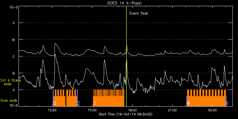 EIS Observation timeline overlay to GOES-Xray curve Code 1" 2" 40" 266" EIS Observations list for this event: STUDY ACRONYM ID DATE OBSERVED DESCRIPTION NOAA# TARGET 0 PRY_slot_context_v3 | 43354 | 2014/10/19 12:03:20 | HOP268 | 2187 | Active Region TIMELINE ID DATE OBSERVED FITS FILE XCEN (+W/-E) YCEN (+N/-S) DUR ----------------------------------------------------------------------------------------------------------------- 43354 | 2014/10/19 12:03:20.000 | eis_l0_20141019_120320.fits.gz | 303.24 | -216.69 | 2m56s 1 Cor_Hole_Jet_v1 | 43355 | 2014/10/19 12:06:42 | HOP268 | | Quiet Sun TIMELINE ID DATE OBSERVED FITS FILE XCEN (+W/-E) YCEN (+N/-S) DUR ----------------------------------------------------------------------------------------------------------------- 43355 | 2014/10/19 12:06:42.000 | eis_l0_20141019_120642.fits.gz | 337.16 | -216.54 | 5m46s 43355 | 2014/10/19 12:12:31.000 | eis_l0_20141019_121231.fits.gz | 338.01 | -216.62 | 5m47s 43355 | 2014/10/19 12:18:21.000 | eis_l0_20141019_121821.fits.gz | 338.86 | -216.38 | 5m47s 43355 | 2014/10/19 12:24:11.000 | eis_l0_20141019_122411.fits.gz | 339.71 | -216.46 | 5m46s 43355 | 2014/10/19 12:30:00.000 | eis_l0_20141019_123000.fits.gz | 340.56 | -216.54 | 5m47s 43355 | 2014/10/19 12:35:50.000 | eis_l0_20141019_123550.fits.gz | 341.33 | -216.62 | 5m46s 43355 | 2014/10/19 12:41:39.000 | eis_l0_20141019_124139.fits.gz | 342.18 | -216.54 | 5m47s 43355 | 2014/10/19 12:47:28.000 | eis_l0_20141019_124728.fits.gz | 343.03 | -216.38 | 5m47s 43355 | 2014/10/19 12:53:18.000 | eis_l0_20141019_125318.fits.gz | 343.88 | -216.31 | 5m47s 43355 | 2014/10/19 13:04:57.000 | eis_l0_20141019_130457.fits.gz | 345.58 | -216.38 | 5m47s 43355 | 2014/10/19 13:10:47.000 | eis_l0_20141019_131047.fits.gz | 346.35 | -216.15 | 5m47s 43355 | 2014/10/19 13:16:37.000 | eis_l0_20141019_131637.fits.gz | 347.28 | -216.31 | 5m47s 43355 | 2014/10/19 13:22:26.000 | eis_l0_20141019_132226.fits.gz | 348.05 | -216.07 | 5m47s 43355 | 2014/10/19 13:28:16.000 | eis_l0_20141019_132816.fits.gz | 348.98 | -216.23 | 5m47s 43355 | 2014/10/19 13:34:06.000 | eis_l0_20141019_133406.fits.gz | 349.75 | -216.15 | 5m47s 43355 | 2014/10/19 13:39:55.000 | eis_l0_20141019_133955.fits.gz | 350.60 | -216.07 | 5m48s 43355 | 2014/10/19 13:45:45.000 | eis_l0_20141019_134545.fits.gz | 351.53 | -216.15 | 5m47s 2 PRY_slot_context_v3 | 43356 | 2014/10/19 13:51:43 | HOP268 | 2187 | Active Region TIMELINE ID DATE OBSERVED FITS FILE XCEN (+W/-E) YCEN (+N/-S) DUR ----------------------------------------------------------------------------------------------------------------- 43356 | 2014/10/19 13:51:43.000 | eis_l0_20141019_135143.fits.gz | 318.59 | -215.84 | 2m56s 3 qub_hi-cad_flare_v2 | 43357 | 2014/10/19 15:03:34 | HOP263 | 2192 | Flare TIMELINE ID DATE OBSERVED FITS FILE XCEN (+W/-E) YCEN (+N/-S) DUR ----------------------------------------------------------------------------------------------------------------- 43357 | 2014/10/19 15:03:34.000 | eis_l0_20141019_150334.fits.gz | -751.32 | -244.71 | 3m15s 43357 | 2014/10/19 15:06:52.000 | eis_l0_20141019_150652.fits.gz | -750.93 | -244.71 | 3m16s 43357 | 2014/10/19 15:10:11.000 | eis_l0_20141019_151011.fits.gz | -750.62 | -244.55 | 3m17s 43357 | 2014/10/19 15:13:31.000 | eis_l0_20141019_151331.fits.gz | -750.39 | -244.71 | 3m16s 43357 | 2014/10/19 15:16:50.000 | eis_l0_20141019_151650.fits.gz | -750.08 | -244.86 | 3m16s 43357 | 2014/10/19 15:20:09.000 | eis_l0_20141019_152009.fits.gz | -749.78 | -244.86 | 3m16s 43357 | 2014/10/19 15:23:28.000 | eis_l0_20141019_152328.fits.gz | -749.47 | -244.86 | 3m16s 43357 | 2014/10/19 15:26:47.000 | eis_l0_20141019_152647.fits.gz | -749.16 | -244.78 | 3m15s 43357 | 2014/10/19 15:30:05.000 | eis_l0_20141019_153005.fits.gz | -748.92 | -244.86 | 3m16s 43357 | 2014/10/19 15:33:23.000 | eis_l0_20141019_153323.fits.gz | -748.62 | -244.86 | 3m17s 43357 | 2014/10/19 15:36:42.000 | eis_l0_20141019_153642.fits.gz | -748.31 | -245.01 | 3m17s 43357 | 2014/10/19 15:40:01.000 | eis_l0_20141019_154001.fits.gz | -748.00 | -245.09 | 3m17s 43357 | 2014/10/19 15:43:20.000 | eis_l0_20141019_154320.fits.gz | -747.69 | -245.09 | 3m16s 43357 | 2014/10/19 15:46:39.000 | eis_l0_20141019_154639.fits.gz | -747.38 | -245.09 | 3m16s 43357 | 2014/10/19 15:49:58.000 | eis_l0_20141019_154958.fits.gz | -747.15 | -245.25 | 3m16s 43357 | 2014/10/19 15:53:16.000 | eis_l0_20141019_155316.fits.gz | -746.76 | -245.17 | 3m16s 43357 | 2014/10/19 15:56:35.000 | eis_l0_20141019_155635.fits.gz | -746.61 | -245.25 | 3m16s 43357 | 2014/10/19 15:59:54.000 | eis_l0_20141019_155954.fits.gz | -746.30 | -245.32 | 3m16s 43357 | 2014/10/19 16:03:13.000 | eis_l0_20141019_160313.fits.gz | -745.99 | -245.40 | 3m16s 43357 | 2014/10/19 16:06:31.000 | eis_l0_20141019_160631.fits.gz | -745.68 | -245.25 | 3m17s 43357 | 2014/10/19 16:09:50.000 | eis_l0_20141019_160950.fits.gz | -745.37 | -245.25 | 3m16s 43357 | 2014/10/19 16:13:08.000 | eis_l0_20141019_161308.fits.gz | -745.22 | -245.40 | 3m16s 43357 | 2014/10/19 16:16:27.000 | eis_l0_20141019_161627.fits.gz | -744.83 | -245.63 | 3m15s 43357 | 2014/10/19 16:19:45.000 | eis_l0_20141019_161945.fits.gz | -744.52 | -245.40 | 3m16s 43357 | 2014/10/19 16:23:03.000 | eis_l0_20141019_162303.fits.gz | -744.21 | -245.55 | 3m16s 43357 | 2014/10/19 16:26:22.000 | eis_l0_20141019_162622.fits.gz | -743.90 | -245.63 | 3m16s 43357 | 2014/10/19 16:29:41.000 | eis_l0_20141019_162941.fits.gz | -743.67 | -245.55 | 3m16s 43357 | 2014/10/19 16:33:00.000 | eis_l0_20141019_163300.fits.gz | -743.29 | -245.71 | 3m15s 43357 | 2014/10/19 16:36:18.000 | eis_l0_20141019_163618.fits.gz | -743.13 | -245.63 | 3m16s 43357 | 2014/10/19 16:39:37.000 | eis_l0_20141019_163937.fits.gz | -742.67 | -245.79 | 3m16s 43357 | 2014/10/19 16:42:55.000 | eis_l0_20141019_164255.fits.gz | -742.44 | -245.86 | 3m17s 43357 | 2014/10/19 16:46:15.000 | eis_l0_20141019_164615.fits.gz | -742.21 | -245.79 | 3m15s 43357 | 2014/10/19 16:49:33.000 | eis_l0_20141019_164933.fits.gz | -741.90 
