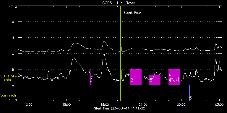 EIS Observation timeline overlay to GOES-Xray curve Code 1" 2" 40" 266" EIS Observations list for this event: STUDY ACRONYM ID DATE OBSERVED DESCRIPTION NOAA# TARGET 0 regcal071 | 43404 | 2014/10/23 16:49:12 | Dark exposures, CCD bottom rows (100s | | Engineering TIMELINE ID DATE OBSERVED FITS FILE XCEN (+W/-E) YCEN (+N/-S) DUR ----------------------------------------------------------------------------------------------------------------- 43404 | 2014/10/23 16:49:12.000 | eis_l0_20141023_164912.fits.gz | 10.34 | -643.77 | 3m21s 1 regcal072 | 43405 | 2014/10/23 16:53:00 | Dark exposures, top CCD rows (100s exp | | Engineering TIMELINE ID DATE OBSERVED FITS FILE XCEN (+W/-E) YCEN (+N/-S) DUR ----------------------------------------------------------------------------------------------------------------- 43405 | 2014/10/23 16:53:00.000 | eis_l0_20141023_165300.fits.gz | 10.96 | -132.61 | 3m22s 2 HPW002_QS_SAS_060m | 43409 | 2014/10/23 20:00:34 | EIS pole observation (north) | | Quiet Sun TIMELINE ID DATE OBSERVED FITS FILE XCEN (+W/-E) YCEN (+N/-S) DUR ----------------------------------------------------------------------------------------------------------------- 43409 | 2014/10/23 20:00:34.000 | eis_l0_20141023_200034.fits.gz | -9.88 | 1147.71 | 51m34s 3 HPW002_QS_SAS_060m | 43410 | 2014/10/23 21:30:14 | EIS pole observation (disc center) | | Quiet Sun TIMELINE ID DATE OBSERVED FITS FILE XCEN (+W/-E) YCEN (+N/-S) DUR ----------------------------------------------------------------------------------------------------------------- 43410 | 2014/10/23 21:30:14.000 | eis_l0_20141023_213014.fits.gz | -9.88 | 801.97 | 51m33s 4 HPW002_QS_SAS_060m | 43411 | 2014/10/23 23:00:13 | EIS pole observation (south) | | Quiet Sun TIMELINE ID DATE OBSERVED FITS FILE XCEN (+W/-E) YCEN (+N/-S) DUR ----------------------------------------------------------------------------------------------------------------- 43411 | 2014/10/23 23:00:13.000 | eis_l0_20141023_230013.fits.gz | -9.72 | -941.59 | 51m34s 5 PRY_slot_context_v3 | 43433 | 2014/10/24 00:37:33 | Flare study | 2192 | Active Region TIMELINE ID DATE OBSERVED FITS FILE XCEN (+W/-E) YCEN (+N/-S) DUR ----------------------------------------------------------------------------------------------------------------- 43433 | 2014/10/24 00:37:33.000 | eis_l0_20141024_003733.fits.gz | 40.96 | -341.92 | 2m57s : Check study information : Download file : View thumbnails For this event, also check for:
