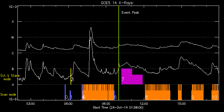EIS Observation timeline overlay to GOES-Xray curve Code 1" 2" 40" 266" EIS Observations list for this event: STUDY ACRONYM ID DATE OBSERVED DESCRIPTION NOAA# TARGET 0 PRY_slot_context_v3 | 43435 | 2014/10/24 05:43:28 | Flare study | 2192 | Active Region TIMELINE ID DATE OBSERVED FITS FILE XCEN (+W/-E) YCEN (+N/-S) DUR ----------------------------------------------------------------------------------------------------------------- 43435 | 2014/10/24 05:43:28.000 | eis_l0_20141024_054328.fits.gz | 86.37 | -341.30 | 2m57s 1 PRY_slot_contextLITE | 43401 | 2014/10/24 06:07:43 | alignment | | Active Region TIMELINE ID DATE OBSERVED FITS FILE XCEN (+W/-E) YCEN (+N/-S) DUR ----------------------------------------------------------------------------------------------------------------- 43401 | 2014/10/24 06:07:43.000 | eis_l0_20141024_060743.fits.gz | -24.77 | -4.42 | 2m57s 2 Alignment_266 | 43402 | 2014/10/24 06:10:58 | alignment | | Quiet Sun TIMELINE ID DATE OBSERVED FITS FILE XCEN (+W/-E) YCEN (+N/-S) DUR ----------------------------------------------------------------------------------------------------------------- 43402 | 2014/10/24 06:10:58.000 | eis_l0_20141024_061058.fits.gz | -142.38 | -4.42 | 1m22s 3 XRT_synop_AIA | 43403 | 2014/10/24 06:13:05 | alignment | | Quiet Sun TIMELINE ID DATE OBSERVED FITS FILE XCEN (+W/-E) YCEN (+N/-S) DUR ----------------------------------------------------------------------------------------------------------------- 43403 | 2014/10/24 06:13:05.000 | eis_l0_20141024_061305.fits.gz | -142.30 | -4.27 | 10s 4 PRY_slot_context_v3 | 43430 | 2014/10/24 07:04:26 | Flare study | 2192 | Active Region TIMELINE ID DATE OBSERVED FITS FILE XCEN (+W/-E) YCEN (+N/-S) DUR ----------------------------------------------------------------------------------------------------------------- 43430 | 2014/10/24 07:04:26.000 | eis_l0_20141024_070426.fits.gz | 98.51 | -341.07 | 2m57s 5 PRY_flare_2 | 43431 | 2014/10/24 07:07:48 | Flare study | | Flare TIMELINE ID DATE OBSERVED FITS FILE XCEN (+W/-E) YCEN (+N/-S) DUR ----------------------------------------------------------------------------------------------------------------- 43431 | 2014/10/24 07:07:48.000 | eis_l0_20141024_070748.fits.gz | 113.54 | -310.99 | 1m45s 43431 | 2014/10/24 07:09:36.000 | eis_l0_20141024_070936.fits.gz | 113.85 | -311.14 | 1m45s 43431 | 2014/10/24 07:11:24.000 | eis_l0_20141024_071124.fits.gz | 114.08 | -311.14 | 1m45s 43431 | 2014/10/24 07:13:12.000 | eis_l0_20141024_071312.fits.gz | 114.32 | -311.07 | 1m45s 43431 | 2014/10/24 07:15:00.000 | eis_l0_20141024_071500.fits.gz | 114.55 | -311.07 | 1m45s 43431 | 2014/10/24 07:16:48.000 | eis_l0_20141024_071648.fits.gz | 114.86 | -311.14 | 1m45s 43431 | 2014/10/24 07:18:36.000 | eis_l0_20141024_071836.fits.gz | 115.17 | -310.99 | 1m45s 43431 | 2014/10/24 07:20:24.000 | eis_l0_20141024_072024.fits.gz | 115.40 | -310.84 | 1m45s 43431 | 2014/10/24 07:22:12.000 | eis_l0_20141024_072212.fits.gz | 115.63 | -311.07 | 1m45s 43431 | 2014/10/24 07:23:59.000 | eis_l0_20141024_072359.fits.gz | 115.86 | -310.99 | 1m45s 43431 | 2014/10/24 07:25:47.000 | eis_l0_20141024_072547.fits.gz | 116.25 | -311.14 | 1m46s 43431 | 2014/10/24 07:27:35.000 | eis_l0_20141024_072735.fits.gz | 116.40 | -310.99 | 1m46s 43431 | 2014/10/24 07:29:23.000 | eis_l0_20141024_072923.fits.gz | 116.79 | -310.91 | 1m46s 43431 | 2014/10/24 07:31:11.000 | eis_l0_20141024_073111.fits.gz | 117.02 | -311.07 | 1m46s 43431 | 2014/10/24 07:32:59.000 | eis_l0_20141024_073259.fits.gz | 117.25 | -311.07 | 1m46s 43431 | 2014/10/24 07:34:47.000 | eis_l0_20141024_073447.fits.gz | 117.56 | -311.07 | 1m45s 43431 | 2014/10/24 07:36:35.000 | eis_l0_20141024_073635.fits.gz | 117.79 | -311.14 | 1m45s 43431 | 2014/10/24 07:38:23.000 | eis_l0_20141024_073823.fits.gz | 118.10 | -311.14 | 1m46s 43431 | 2014/10/24 07:40:11.000 | eis_l0_20141024_074011.fits.gz | 118.33 | -311.14 | 1m46s 43431 | 2014/10/24 07:42:00.000 | eis_l0_20141024_074200.fits.gz | 118.56 | -310.99 | 1m45s 43431 | 2014/10/24 07:43:47.000 | eis_l0_20141024_074347.fits.gz | 118.87 | -310.99 | 1m45s 43431 | 2014/10/24 07:45:35.000 | eis_l0_20141024_074535.fits.gz | 119.11 | -311.07 | 1m46s 43431 | 2014/10/24 07:47:23.000 | eis_l0_20141024_074723.fits.gz | 119.34 | -310.99 | 1m46s 43431 | 2014/10/24 07:49:11.000 | eis_l0_20141024_074911.fits.gz | 119.64 | -310.91 | 1m46s 43431 | 2014/10/24 07:51:00.000 | eis_l0_20141024_075100.fits.gz | 119.88 | -310.99 | 1m45s 43431 | 2014/10/24 07:52:48.000 | eis_l0_20141024_075248.fits.gz | 120.19 | -311.07 | 1m45s 43431 | 2014/10/24 07:54:36.000 | eis_l0_20141024_075436.fits.gz | 120.42 | -310.84 | 1m45s 43431 | 2014/10/24 07:56:24.000 | eis_l0_20141024_075624.fits.gz | 120.80 | -310.91 | 1m45s 43431 | 2014/10/24 07:58:12.000 | eis_l0_20141024_075812.fits.gz | 120.96 | -310.91 | 1m45s 43431 | 2014/10/24 08:00:00.000 | eis_l0_20141024_080000.fits.gz | 121.35 | -311.07 | 1m45s 43431 | 2014/10/24 08:01:48.000 | eis_l0_20141024_080148.fits.gz | 121.42 | -310.99 | 1m45s 43431 | 2014/10/24 08:03:36.000 | eis_l0_20141024_080336.fits.gz | 121.81 | -311.07 | 1m45s 43431 | 2014/10/24 08:05:24.000 | eis_l0_20141024_080524.fits.gz | 122.04 | -310.91 | 1m45s 43431 | 2014/10/24 08:07:12.000 | eis_l0_20141024_080712.fits.gz | 122.35 | -310.91 | 1m45s 43431 | 2014/10/24 08:09:00.000 | eis_l0_20141024_080900.fits.gz | 122.66 | -310.99 | 1m46s 43431 | 2014/10/24 08:10:48.000 | eis_l0_20141024_081048.fits.gz | 122.97 | -310.99 | 1m45s 43431 | 2014/10/24 08:12:36.000 | eis_l0_20141024_081236.fits.gz | 123.04 | -311.07 | 1m45s 43431 | 2014/10/24 08:14:24.000 | eis_l0_20141024_081424.fits.gz | 123.35 | -310.99 | 1m45s 43431 | 2014/10/24 08:16:12.000 | eis_l0_20141024_081612.fits.gz | 123.66 | -310.84 | 1m46s 43431 | 2014/10/24 08:18:00.000 | eis_l0_20141024_081800.fits.gz | 123.89 | -311.07 | 1m46s 43431 | 2014/10/24 08:19:49.000 | eis_l0_20141024_081949.fits.gz | 124.20 | -310.91 | 1m45s 43431 | 2014/10/24 08:21:37.000 | eis_l0_20141024_082137.