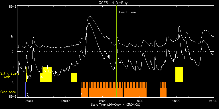EIS Observation timeline overlay to GOES-Xray curve Code 1" 2" 40" 266" EIS Observations list for this event: STUDY ACRONYM ID DATE OBSERVED DESCRIPTION NOAA# TARGET 0 PRY_slot_contextLITE | 43437 | 2014/10/26 05:43:50 | alignment | | Active Region TIMELINE ID DATE OBSERVED FITS FILE XCEN (+W/-E) YCEN (+N/-S) DUR ----------------------------------------------------------------------------------------------------------------- 43437 | 2014/10/26 05:43:50.000 | eis_l0_20141026_054350.fits.gz | -25.10 | -3.42 | 2m56s 1 Alignment_266 | 43438 | 2014/10/26 05:47:05 | alignment | | Quiet Sun TIMELINE ID DATE OBSERVED FITS FILE XCEN (+W/-E) YCEN (+N/-S) DUR ----------------------------------------------------------------------------------------------------------------- 43438 | 2014/10/26 05:47:05.000 | eis_l0_20141026_054705.fits.gz | -142.55 | -3.50 | 1m22s 2 XRT_synop_AIA | 43439 | 2014/10/26 05:49:12 | alignment | | Quiet Sun TIMELINE ID DATE OBSERVED FITS FILE XCEN (+W/-E) YCEN (+N/-S) DUR ----------------------------------------------------------------------------------------------------------------- 43439 | 2014/10/26 05:49:12.000 | eis_l0_20141026_054912.fits.gz | -142.55 | -3.50 | 10s 3 regcal077 | 43485 | 2014/10/26 06:00:21 | Flatfield, 2 exposures, led 80ms, full | | Engineering TIMELINE ID DATE OBSERVED FITS FILE XCEN (+W/-E) YCEN (+N/-S) DUR ----------------------------------------------------------------------------------------------------------------- 43485 | 2014/10/26 06:00:21.000 | eis_l0_20141026_060021.fits.gz | 528.67 | -371.54 | 4s 4 Flare266_Hunter02 | 43489 | 2014/10/26 06:57:06 | Major Flare Watch observation | 2192 | Flare TIMELINE ID DATE OBSERVED FITS FILE XCEN (+W/-E) YCEN (+N/-S) DUR ----------------------------------------------------------------------------------------------------------------- 43489 | 2014/10/26 06:57:06.000 | eis_l0_20141026_065706.fits.gz | 388.70 | -321.00 | 10m36s 43489 | 2014/10/26 07:08:08.000 | eis_l0_20141026_070808.fits.gz | 390.09 | -320.92 | 42m41s 43489 | 2014/10/26 09:28:00.000 | eis_l0_20141026_092800.fits.gz | 407.32 | -319.76 | 28m29s 5 HH_Flare_raster_v6 | 43457 | 2014/10/26 10:14:19 | Major Flare Watch observation | 2192 | Flare TIMELINE ID DATE OBSERVED FITS FILE XCEN (+W/-E) YCEN (+N/-S) DUR ----------------------------------------------------------------------------------------------------------------- 43457 | 2014/10/26 10:14:19.000 | eis_l0_20141026_101419.fits.gz | 558.05 | -307.22 | 3m32s 43457 | 2014/10/26 10:17:53.000 | eis_l0_20141026_101753.fits.gz | 558.66 | -307.45 | 3m32s 43457 | 2014/10/26 10:21:28.000 | eis_l0_20141026_102128.fits.gz | 558.97 | -307.38 | 3m32s 43457 | 2014/10/26 10:25:02.000 | eis_l0_20141026_102502.fits.gz | 559.44 | -307.30 | 3m31s 43457 | 2014/10/26 10:28:36.000 | eis_l0_20141026_102836.fits.gz | 559.90 | -307.22 | 3m31s 43457 | 2014/10/26 10:32:10.000 | eis_l0_20141026_103210.fits.gz | 560.36 | -307.15 | 3m32s 43457 | 2014/10/26 10:35:44.000 | eis_l0_20141026_103544.fits.gz | 560.75 | -307.15 | 3m32s 43457 | 2014/10/26 10:39:19.000 | eis_l0_20141026_103919.fits.gz | 561.14 | -307.15 | 3m32s 43457 | 2014/10/26 10:42:54.000 | eis_l0_20141026_104254.fits.gz | 561.68 | -307.15 | 3m32s 43457 | 2014/10/26 10:46:29.000 | eis_l0_20141026_104629.fits.gz | 562.06 | -307.45 | 51s 43457 | 2014/10/26 10:54:09.000 | eis_l0_20141026_105409.fits.gz | 562.99 | -307.15 | 3m 43457 | 2014/10/26 10:57:12.000 | eis_l0_20141026_105712.fits.gz | 563.30 | -307.07 | 3m31s 43457 | 2014/10/26 11:00:46.000 | eis_l0_20141026_110046.fits.gz | 563.76 | -307.07 | 3m31s 43457 | 2014/10/26 11:04:20.000 | eis_l0_20141026_110420.fits.gz | 564.23 | -307.07 | 3m32s 43457 | 2014/10/26 11:07:54.000 | eis_l0_20141026_110754.fits.gz | 564.53 | -306.76 | 3m32s 43457 | 2014/10/26 11:11:29.000 | eis_l0_20141026_111129.fits.gz | 565.00 | -306.92 | 3m31s 43457 | 2014/10/26 11:15:03.000 | eis_l0_20141026_111503.fits.gz | 565.54 | -306.84 | 3m32s 43457 | 2014/10/26 11:18:38.000 | eis_l0_20141026_111838.fits.gz | 565.93 | -306.76 | 3m32s 43457 | 2014/10/26 11:22:12.000 | eis_l0_20141026_112212.fits.gz | 566.39 | -306.68 | 3m31s 43457 | 2014/10/26 11:25:46.000 | eis_l0_20141026_112546.fits.gz | 566.78 | -306.84 | 3m31s 43457 | 2014/10/26 11:29:20.000 | eis_l0_20141026_112920.fits.gz | 567.24 | -306.76 | 3m32s 43457 | 2014/10/26 11:32:55.000 | eis_l0_20141026_113255.fits.gz | 567.62 | -306.61 | 3m31s 43457 | 2014/10/26 11:36:29.000 | eis_l0_20141026_113629.fits.gz | 568.09 | -306.61 | 3m31s 43457 | 2014/10/26 11:40:03.000 | eis_l0_20141026_114003.fits.gz | 568.40 | -306.53 | 3m32s 43457 | 2014/10/26 11:43:38.000 | eis_l0_20141026_114338.fits.gz | 568.94 | -306.68 | 3m31s 43457 | 2014/10/26 11:47:12.000 | eis_l0_20141026_114712.fits.gz | 569.32 | -306.76 | 3m31s 43457 | 2014/10/26 11:50:46.000 | eis_l0_20141026_115046.fits.gz | 569.79 | -306.53 | 3m32s 43457 | 2014/10/26 11:54:21.000 | eis_l0_20141026_115421.fits.gz | 570.25 | -306.45 | 3m31s 43457 | 2014/10/26 11:57:55.000 | eis_l0_20141026_115755.fits.gz | 570.72 | -306.61 | 3m31s 43457 | 2014/10/26 12:01:29.000 | eis_l0_20141026_120129.fits.gz | 570.95 | -306.37 | 3m32s 43457 | 2014/10/26 12:05:04.000 | eis_l0_20141026_120504.fits.gz | 571.41 | -306.37 | 3m31s 43457 | 2014/10/26 12:08:38.000 | eis_l0_20141026_120838.fits.gz | 572.03 | -306.53 | 3m31s 43457 | 2014/10/26 12:12:12.000 | eis_l0_20141026_121212.fits.gz | 572.34 | -306.45 | 3m31s 43457 | 2014/10/26 12:15:46.000 | eis_l0_20141026_121546.fits.gz | 572.72 | -306.45 | 3m32s 43457 | 2014/10/26 12:19:20.000 | eis_l0_20141026_121920.fits.gz | 573.19 | -306.37 | 3m32s 43457 | 2014/10/26 12:22:54.000 | eis_l0_20141026_122254.fits.gz | 573.65 | -306.45 | 3m32s 43457 | 2014/10/26 12:26:28.000 | eis_l0_20141026_122628.fits.gz | 574.04 | -306.22 | 3m32s 43457 | 2014/10/26 12:30:03.000 | eis_l0_20141026_123003.fits.gz | 574.42 | -306.14 | 3m31s 43457 | 2014/10/26 12:33:37.000 | eis_l0_20141026_123337.fits.gz | 574.81 | -306.22 | 3m31s 43457 | 2014