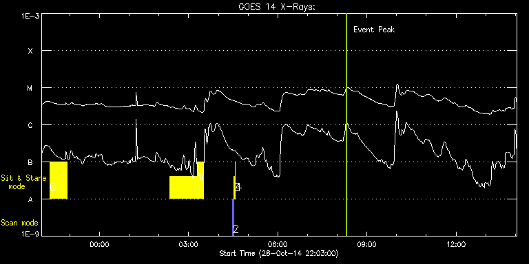 EIS Observation timeline overlay to GOES-Xray curve Code 1" 2" 40" 266" EIS Observations list for this event: STUDY ACRONYM ID DATE OBSERVED DESCRIPTION NOAA# TARGET 0 Flare266_Hunter02 | 43512 | 2014/10/28 22:19:33 | Major Flare Watch observation | 2192 | Flare TIMELINE ID DATE OBSERVED FITS FILE XCEN (+W/-E) YCEN (+N/-S) DUR ----------------------------------------------------------------------------------------------------------------- 43512 | 2014/10/28 22:19:33.000 | eis_l0_20141028_221933.fits.gz | 737.40 | -280.99 | 34m16s 1 Flare266_Hunter02 | 43513 | 2014/10/29 02:21:33 | Major Flare Watch observation | | Flare TIMELINE ID DATE OBSERVED FITS FILE XCEN (+W/-E) YCEN (+N/-S) DUR ----------------------------------------------------------------------------------------------------------------- 43513 | 2014/10/29 02:21:33.000 | eis_l0_20141029_022133.fits.gz | 749.83 | -278.05 | 55m50s 43513 | 2014/10/29 03:17:50.000 | eis_l0_20141029_031750.fits.gz | 752.54 | -277.43 | 12m10s 2 PRY_slot_contextLITE | 43496 | 2014/10/29 04:28:20 | alignment | 2195 | Active Region TIMELINE ID DATE OBSERVED FITS FILE XCEN (+W/-E) YCEN (+N/-S) DUR ----------------------------------------------------------------------------------------------------------------- 43496 | 2014/10/29 04:28:20.000 | eis_l0_20141029_042820.fits.gz | -25.02 | -3.42 | 2m56s 3 Alignment_266 | 43497 | 2014/10/29 04:31:35 | alignment | 2196 | Quiet Sun TIMELINE ID DATE OBSERVED FITS FILE XCEN (+W/-E) YCEN (+N/-S) DUR ----------------------------------------------------------------------------------------------------------------- 43497 | 2014/10/29 04:31:35.000 | eis_l0_20141029_043135.fits.gz | -142.55 | -3.42 | 1m22s 4 XRT_synop_AIA | 43498 | 2014/10/29 04:34:09 | alignment | 2196 | Quiet Sun TIMELINE ID DATE OBSERVED FITS FILE XCEN (+W/-E) YCEN (+N/-S) DUR ----------------------------------------------------------------------------------------------------------------- 43498 | 2014/10/29 04:34:09.000 | eis_l0_20141029_043409.fits.gz | -142.40 | -3.42 | 10s : Check study information : Download file : View thumbnails For this event, also check for: