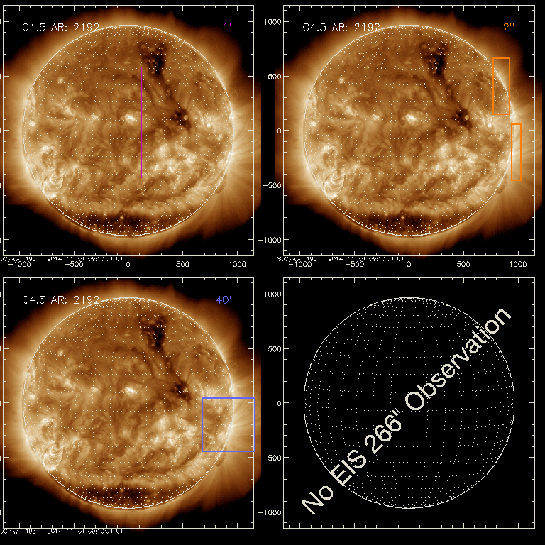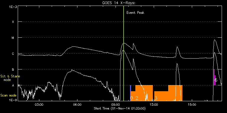 EIS Observation timeline overlay to GOES-Xray curve Code 1" 2" 40" 266" EIS Observations list for this event: STUDY ACRONYM ID DATE OBSERVED DESCRIPTION NOAA# TARGET 0 PRY_slot_context_v3 | 43559 | 2014/11/01 10:08:21 | HOP265 | 2194 | Active Region TIMELINE ID DATE OBSERVED FITS FILE XCEN (+W/-E) YCEN (+N/-S) DUR ----------------------------------------------------------------------------------------------------------------- 43559 | 2014/11/01 10:08:21.000 | eis_l0_20141101_100821.fits.gz | 921.97 | -203.65 | 2m56s 1 CompS_NonMax_30 | 43566 | 2014/11/01 10:11:42 | HOP265 | | Quiet Sun TIMELINE ID DATE OBSERVED FITS FILE XCEN (+W/-E) YCEN (+N/-S) DUR ----------------------------------------------------------------------------------------------------------------- 43566 | 2014/11/01 10:11:42.000 | eis_l0_20141101_101142.fits.gz | 986.63 | -203.49 | 21m15s 2 CompS_NonMax_120 | 43567 | 2014/11/01 10:33:03 | HOP265 | | Quiet Sun TIMELINE ID DATE OBSERVED FITS FILE XCEN (+W/-E) YCEN (+N/-S) DUR ----------------------------------------------------------------------------------------------------------------- 43567 | 2014/11/01 10:33:03.000 | eis_l0_20141101_103303.fits.gz | 986.78 | -203.57 | 1h21m16s 3 GDZ_PLUME1_2_300_50s | 43568 | 2014/11/01 12:03:14 | HOP264 | | Coronal Hole TIMELINE ID DATE OBSERVED FITS FILE XCEN (+W/-E) YCEN (+N/-S) DUR ----------------------------------------------------------------------------------------------------------------- 43568 | 2014/11/01 12:03:14.000 | eis_l0_20141101_120314.fits.gz | 847.66 | 401.59 | 1h4m52s 43568 | 2014/11/01 13:08:14.000 | eis_l0_20141101_130814.fits.gz | 847.58 | 401.59 | 1h4m51s 4 regcal071 | 43564 | 2014/11/01 16:42:12 | Dark exposures, CCD bottom rows (100s | | Engineering TIMELINE ID DATE OBSERVED FITS FILE XCEN (+W/-E) YCEN (+N/-S) DUR ----------------------------------------------------------------------------------------------------------------- 43564 | 2014/11/01 16:42:12.000 | eis_l0_20141101_164212.fits.gz | 122.27 | -184.76 | 3m22s 5 regcal072 | 43565 | 2014/11/01 16:46:01 | Dark exposures, top CCD rows (100s exp | | Engineering TIMELINE ID DATE OBSERVED FITS FILE XCEN (+W/-E) YCEN (+N/-S) DUR ----------------------------------------------------------------------------------------------------------------- 43565 | 2014/11/01 16:46:01.000 | eis_l0_20141101_164601.fits.gz | 122.97 | 326.08 | 3m21s : Check study information : Download file : View thumbnails For this event, also check for: