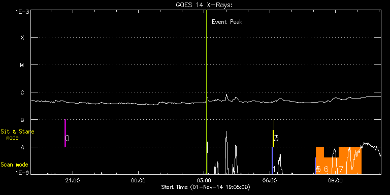 EIS Observation timeline overlay to GOES-Xray curve Code 1" 2" 40" 266" EIS Observations list for this event: STUDY ACRONYM ID DATE OBSERVED DESCRIPTION NOAA# TARGET 0 regcal074 | 43584 | 2014/11/01 20:38:12 | Dark exposures including overscan pixe | | Engineering TIMELINE ID DATE OBSERVED FITS FILE XCEN (+W/-E) YCEN (+N/-S) DUR ----------------------------------------------------------------------------------------------------------------- 43584 | 2014/11/01 20:38:12.000 | eis_l0_20141101_203812.fits.gz | 158.19 | 326.78 | 3m22s 1 PRY_slot_contextLITE | 43550 | 2014/11/02 06:05:50 | alighnment | 2202 | Active Region TIMELINE ID DATE OBSERVED FITS FILE XCEN (+W/-E) YCEN (+N/-S) DUR ----------------------------------------------------------------------------------------------------------------- 43550 | 2014/11/02 06:05:50.000 | eis_l0_20141102_060550.fits.gz | -28.27 | -2.58 | 2m56s 2 Alignment_266 | 43551 | 2014/11/02 06:09:05 | alignment | 2203 | Quiet Sun TIMELINE ID DATE OBSERVED FITS FILE XCEN (+W/-E) YCEN (+N/-S) DUR ----------------------------------------------------------------------------------------------------------------- 43551 | 2014/11/02 06:09:05.000 | eis_l0_20141102_060905.fits.gz | -145.54 | -2.50 | 1m22s 3 XRT_synop_AIA | 43552 | 2014/11/02 06:11:12 | alignment | 2203 | Quiet Sun TIMELINE ID DATE OBSERVED FITS FILE XCEN (+W/-E) YCEN (+N/-S) DUR ----------------------------------------------------------------------------------------------------------------- 43552 | 2014/11/02 06:11:12.000 | eis_l0_20141102_061112.fits.gz | -145.54 | -2.42 | 10s 4 PRY_slot_context_v3 | 43574 | 2014/11/02 08:03:27 | HOP265 | | Active Region TIMELINE ID DATE OBSERVED FITS FILE XCEN (+W/-E) YCEN (+N/-S) DUR ----------------------------------------------------------------------------------------------------------------- 43574 | 2014/11/02 08:03:27.000 | eis_l0_20141102_080327.fits.gz | 921.80 | -202.57 | 2m56s 5 CompS_NonMax_30 | 43575 | 2014/11/02 08:06:48 | HOP265 | | Quiet Sun TIMELINE ID DATE OBSERVED FITS FILE XCEN (+W/-E) YCEN (+N/-S) DUR ----------------------------------------------------------------------------------------------------------------- 43575 | 2014/11/02 08:06:48.000 | eis_l0_20141102_080648.fits.gz | 986.46 | -202.65 | 21m14s 6 CompS_NonMax_60 | 43578 | 2014/11/02 08:28:08 | HOP265 | | Quiet Sun TIMELINE ID DATE OBSERVED FITS FILE XCEN (+W/-E) YCEN (+N/-S) DUR ----------------------------------------------------------------------------------------------------------------- 43578 | 2014/11/02 08:28:08.000 | eis_l0_20141102_082808.fits.gz | 986.38 | -202.49 | 41m15s 7 CompS_NonMax_90 | 43579 | 2014/11/02 09:09:55 | HOP265 | | Quiet Sun TIMELINE ID DATE OBSERVED FITS FILE XCEN (+W/-E) YCEN (+N/-S) DUR ----------------------------------------------------------------------------------------------------------------- 43579 | 2014/11/02 09:09:55.000 | eis_l0_20141102_090955.fits.gz | 986.38 | -202.57 | 1h1m15s : Check study information : Download file : View thumbnails For this event, also check for: